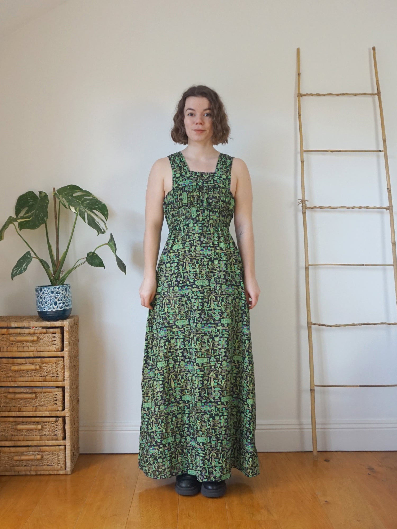 Vintage 70s black cotton maxi dress with a ruched bust, tie waist and unique African inspired pattern in green.