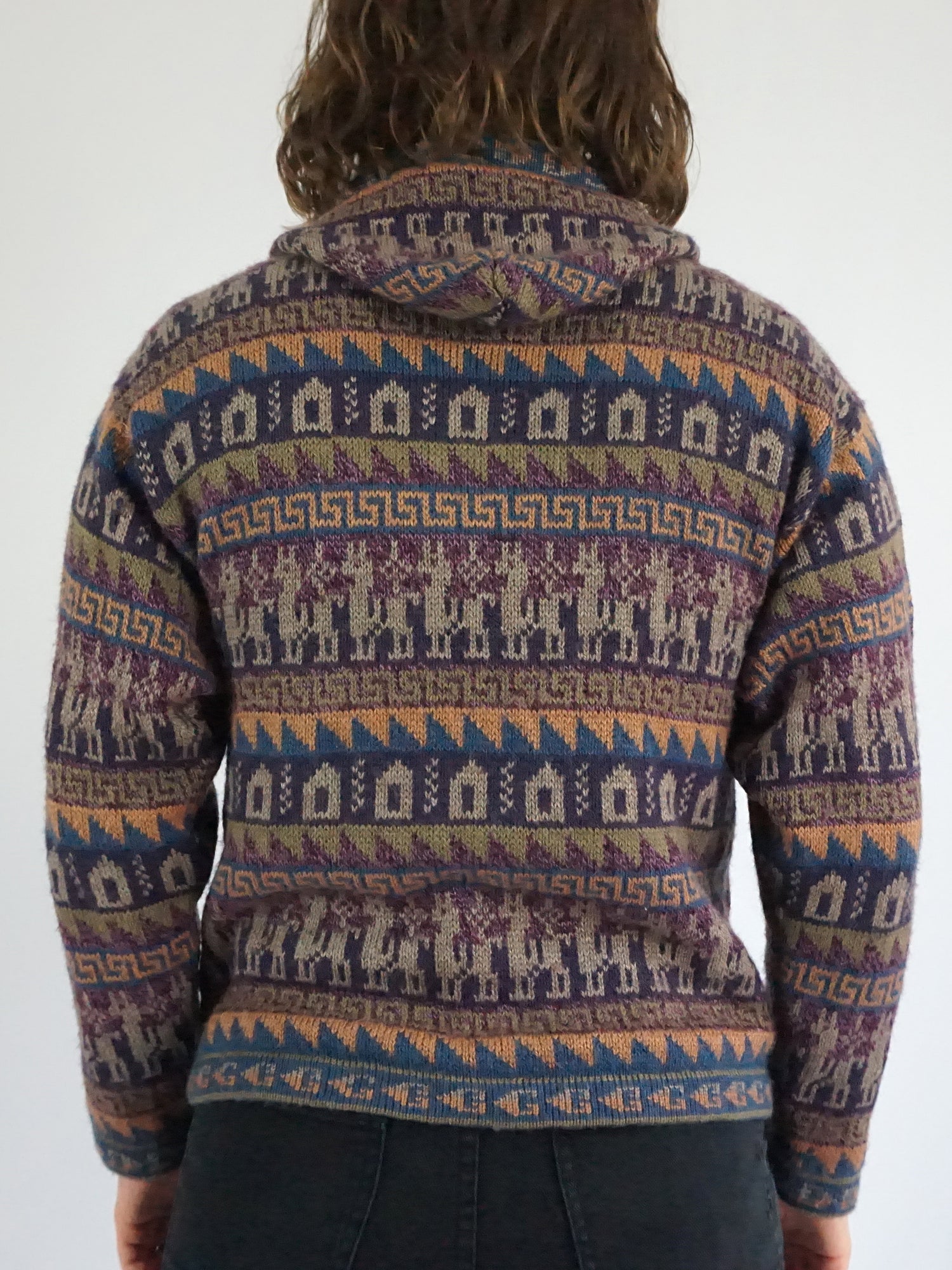 Vintage 90s Aztec style super soft alpaca wool cardigan, hooded with a zip front and pockets.