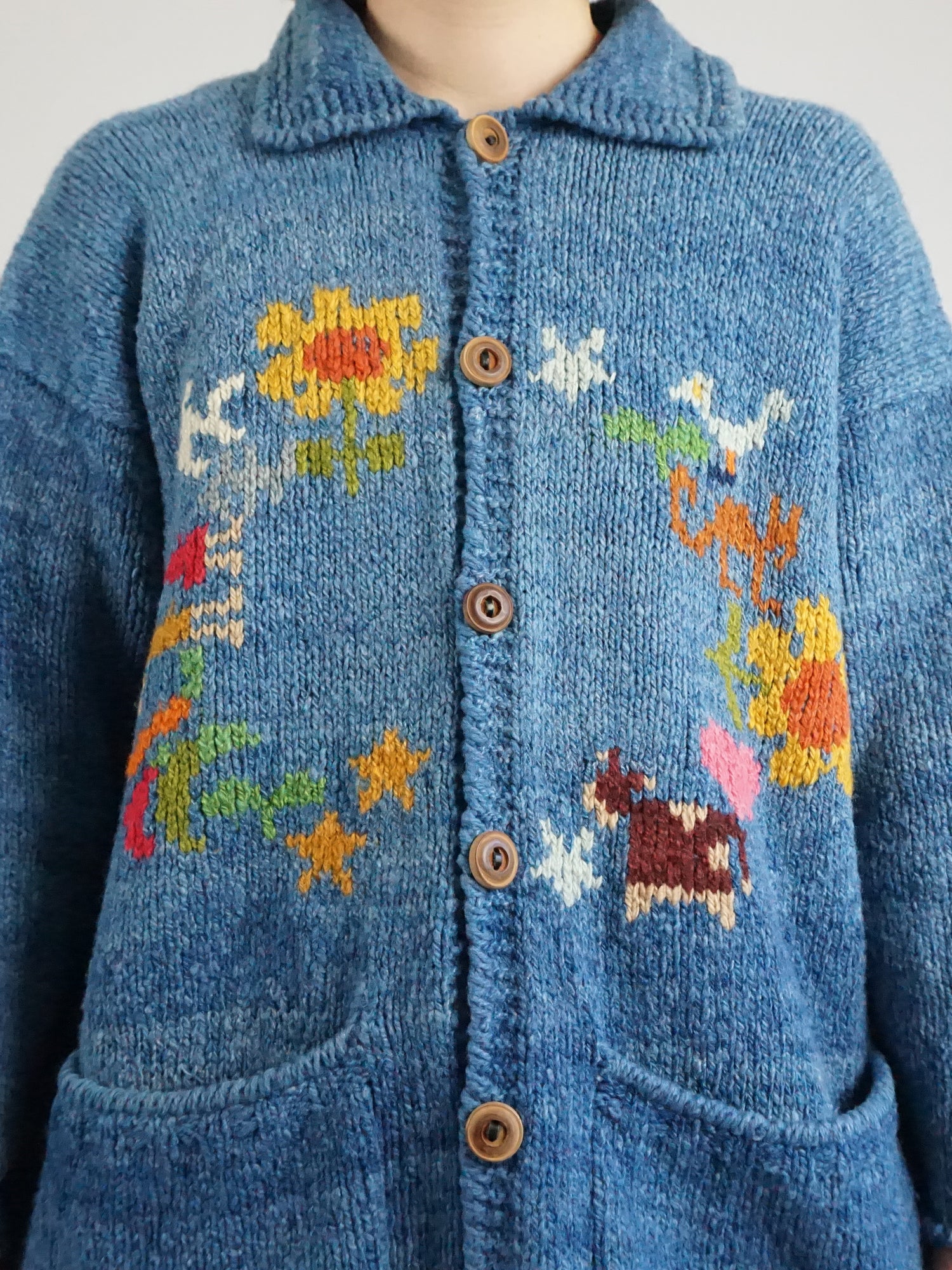 Vintage 90s Amano chunky wool cardigan in blue with stars, flowers and farm animal motifs on the front and back.