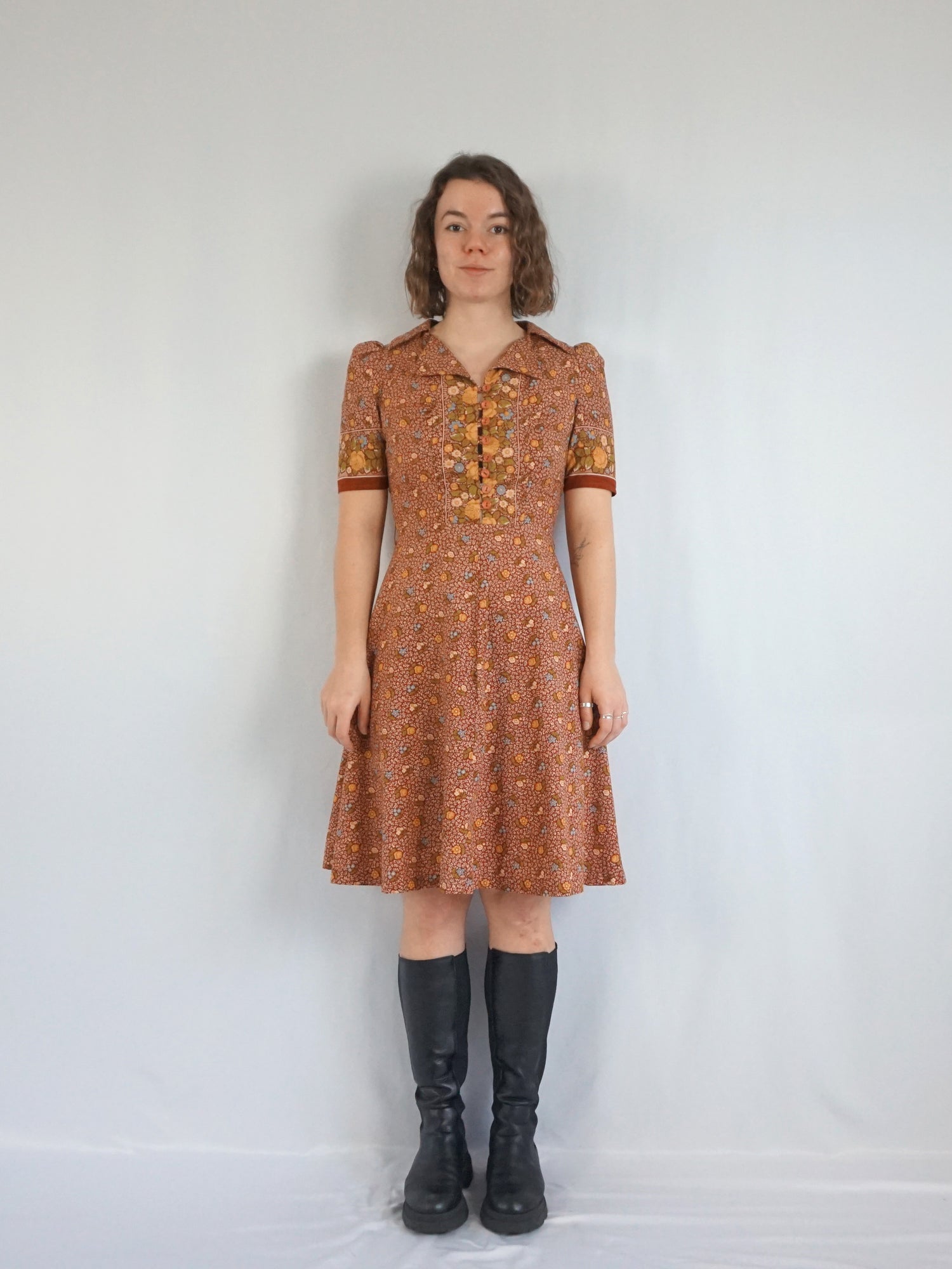 Vintage 70s brown cotton mini dress with a ditsy floral print, puff sleeves, button down bust and collar.
