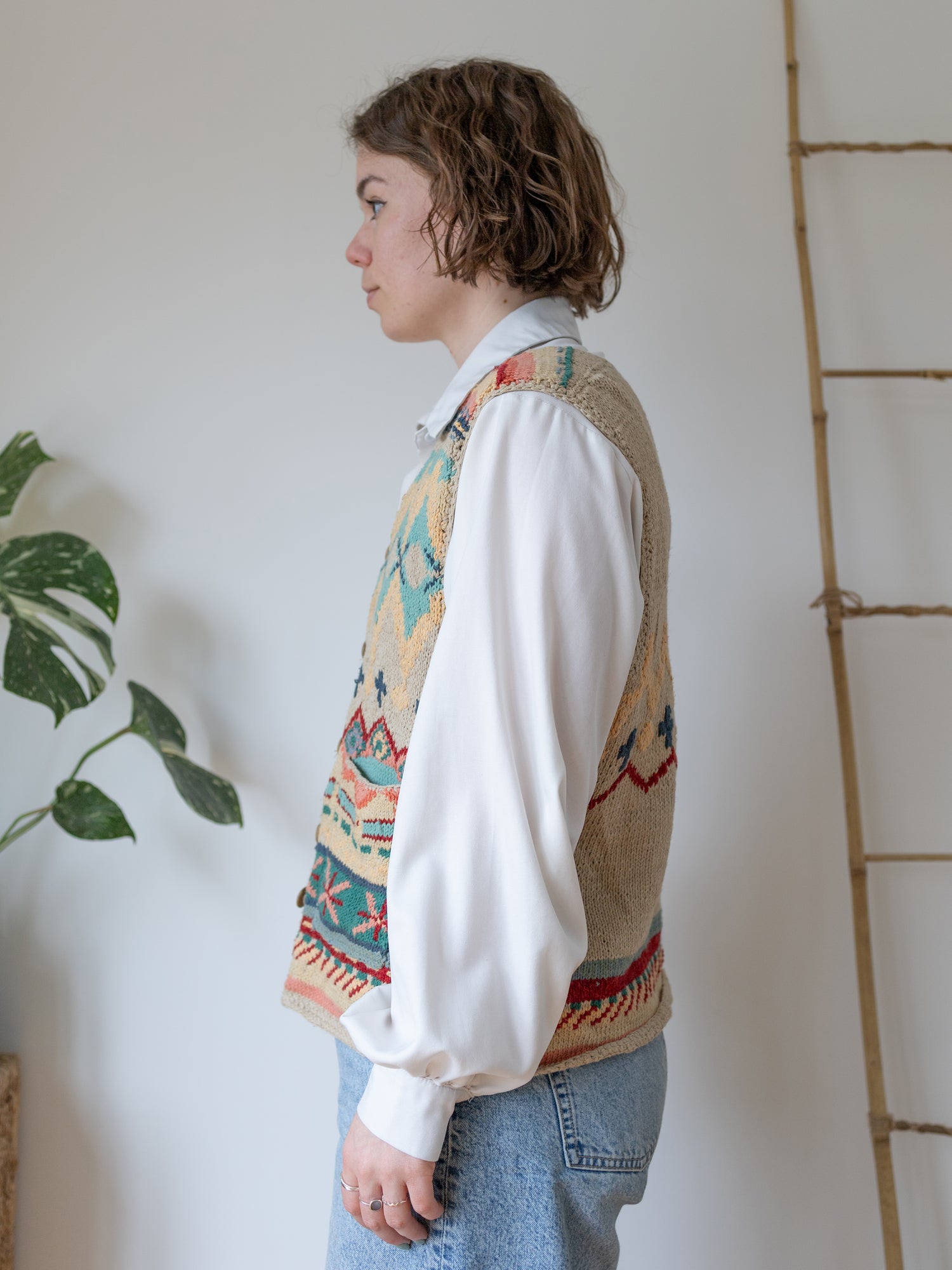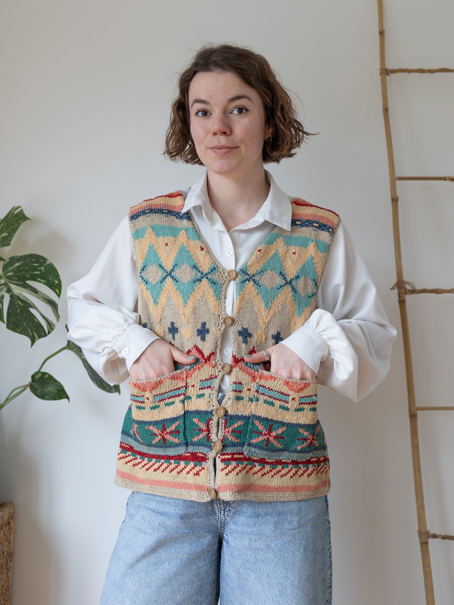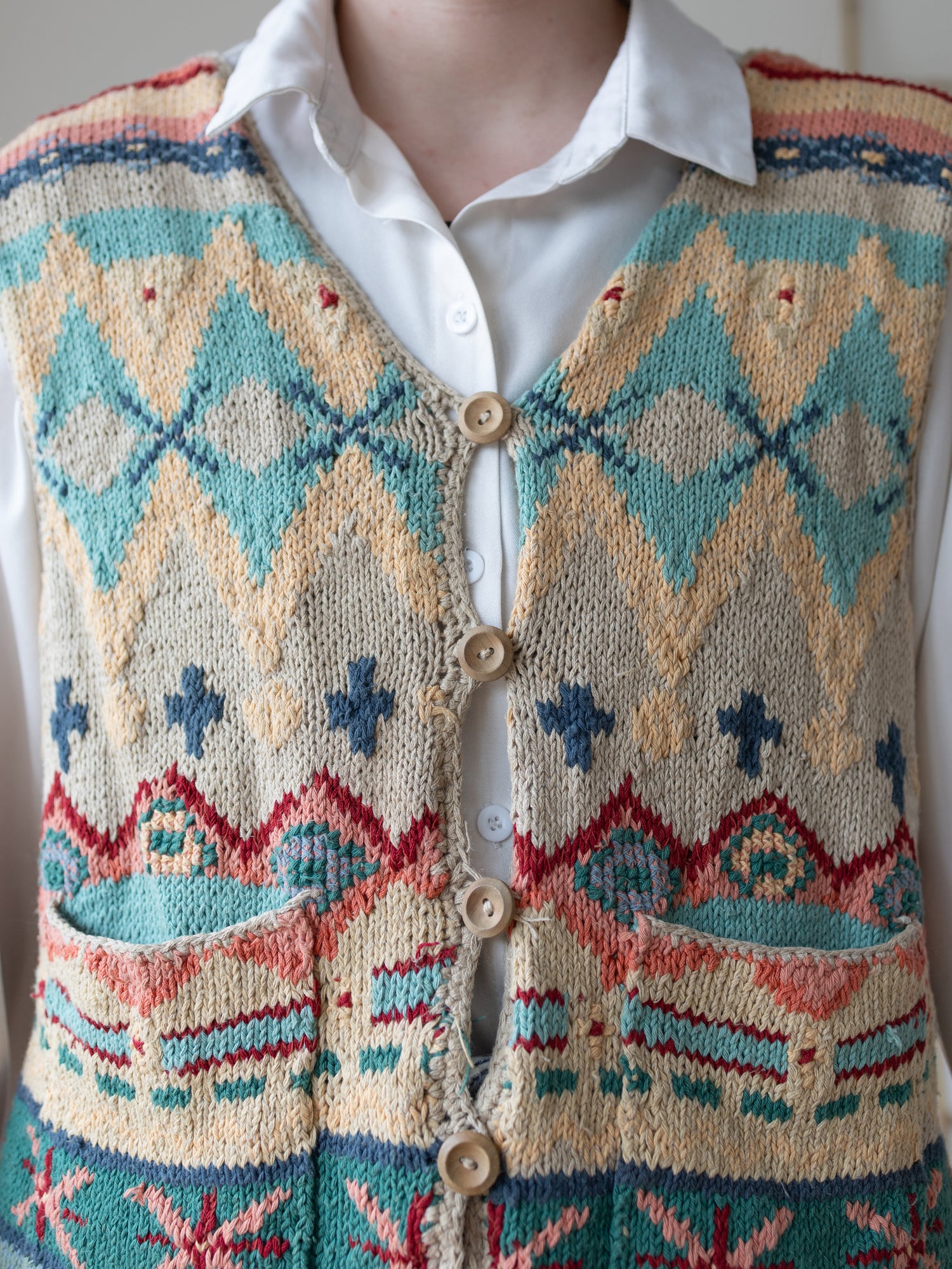Vintage 80s beige cotton vest with colourful patterned detailing, button front, pockets and wooden buttons.