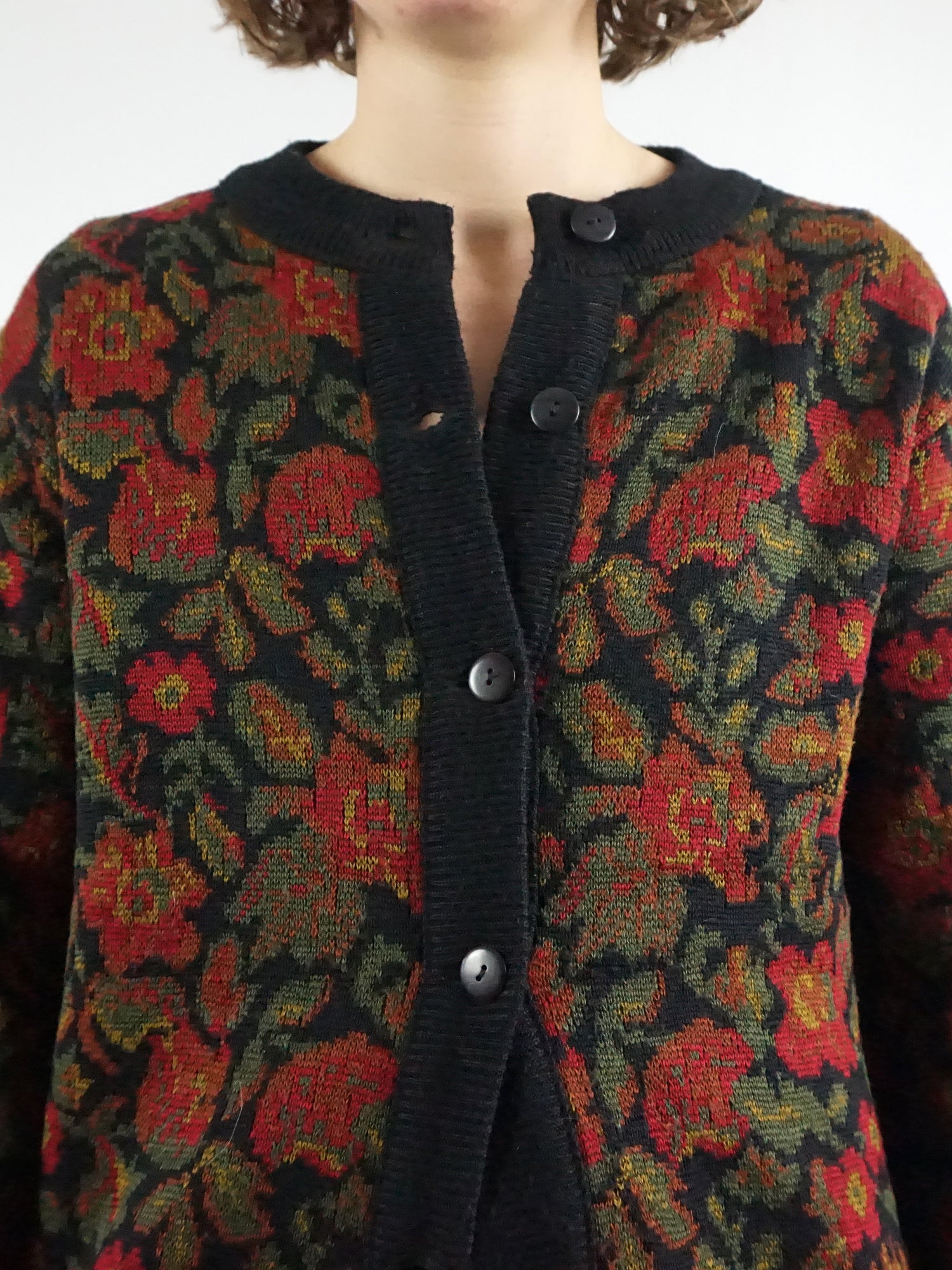 True vintage, not a reproduction. A beautifully made cardigan with rich contrast and a timeless floral design.