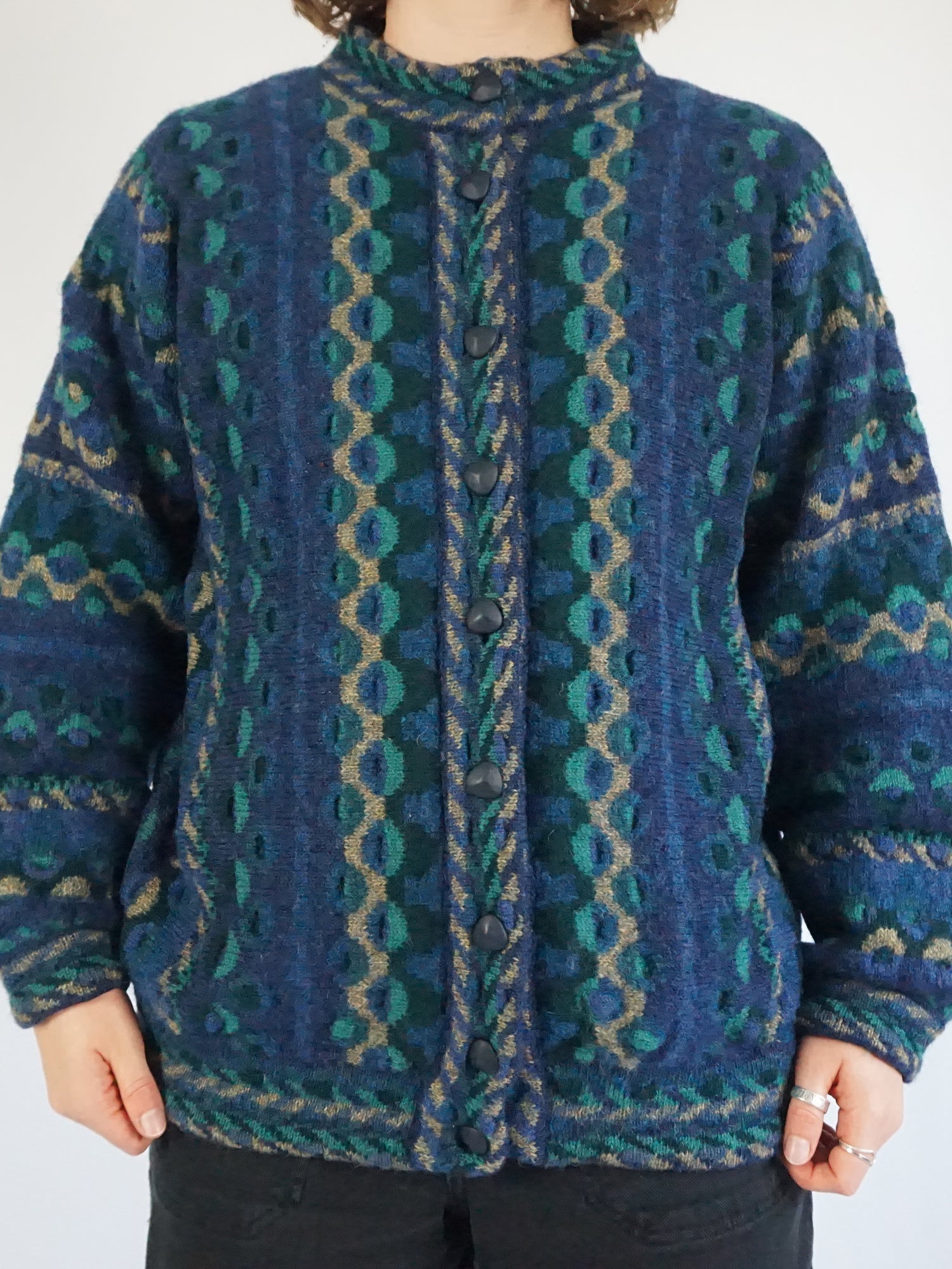 Vintage 90s wool cardigan in blue and green with a funky patterning and pockets.