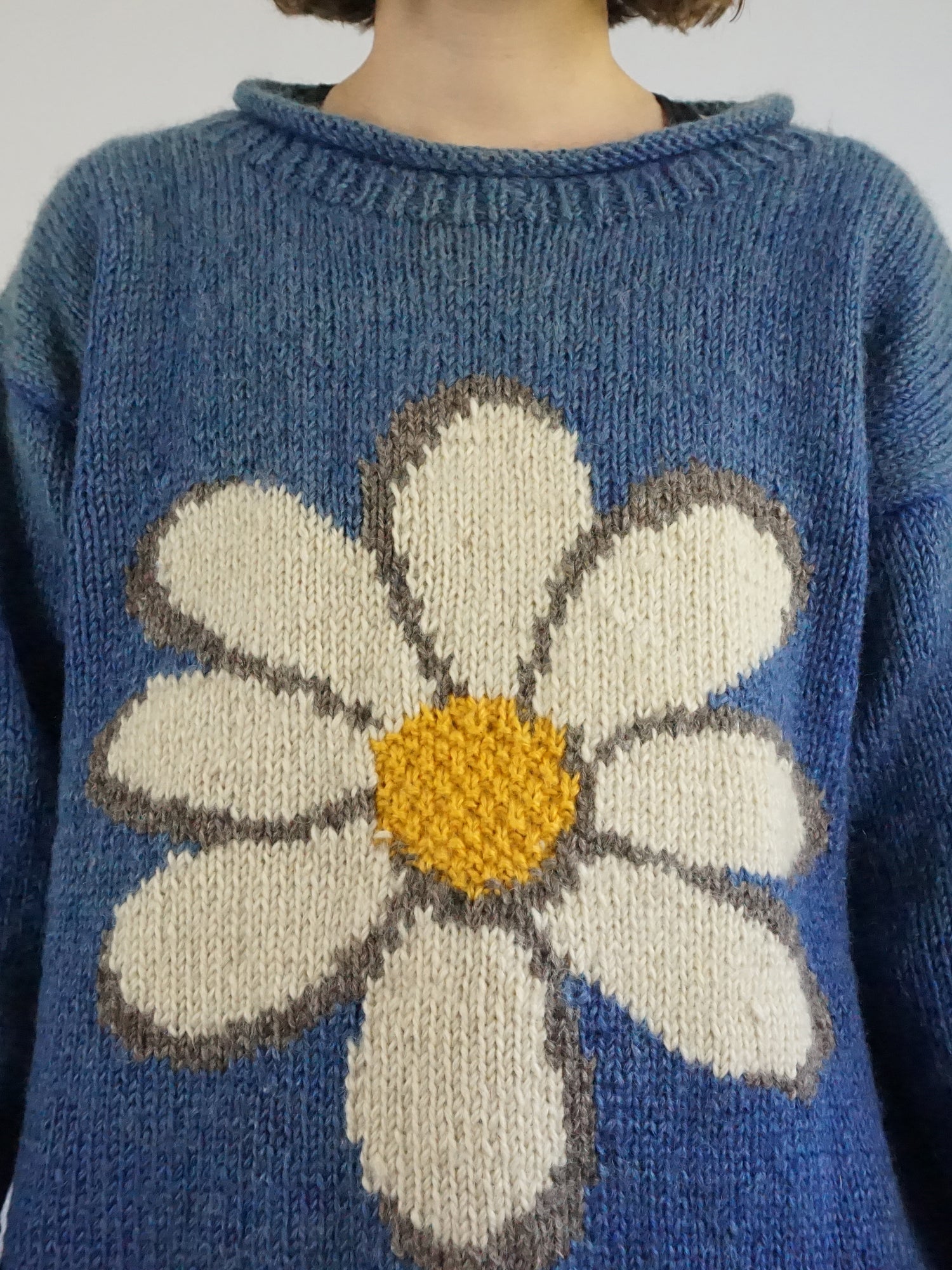 Vintage 90s Pachamama chunky wool jumper in blue with their classic daisy pattern.