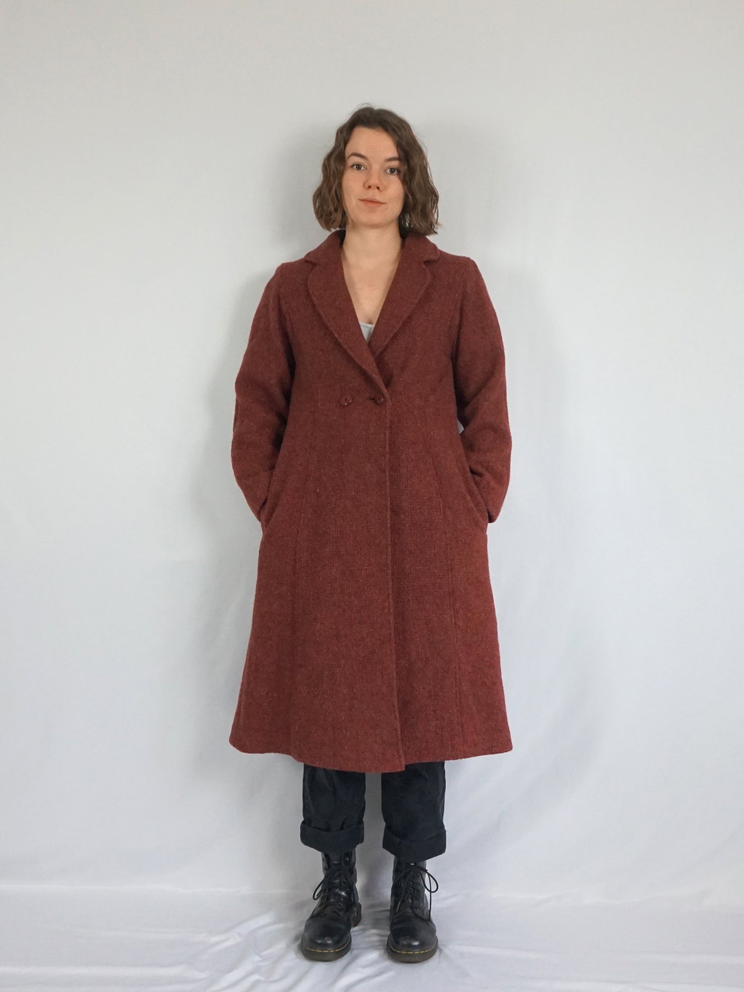 Vintage 70s St Michael pure wool longline trench coat in burgundy with pockets.