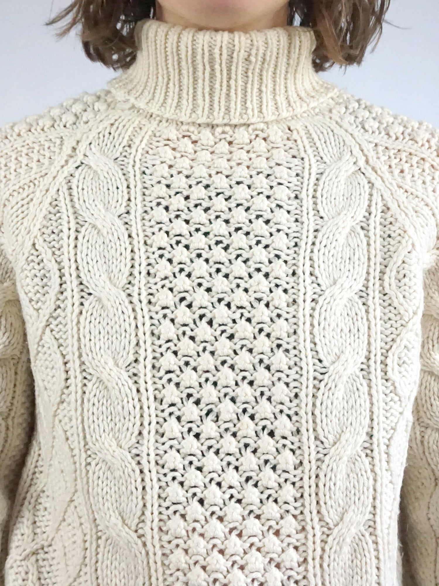 Vintage 90s cream turtleneck jumper with cable knit detailing.