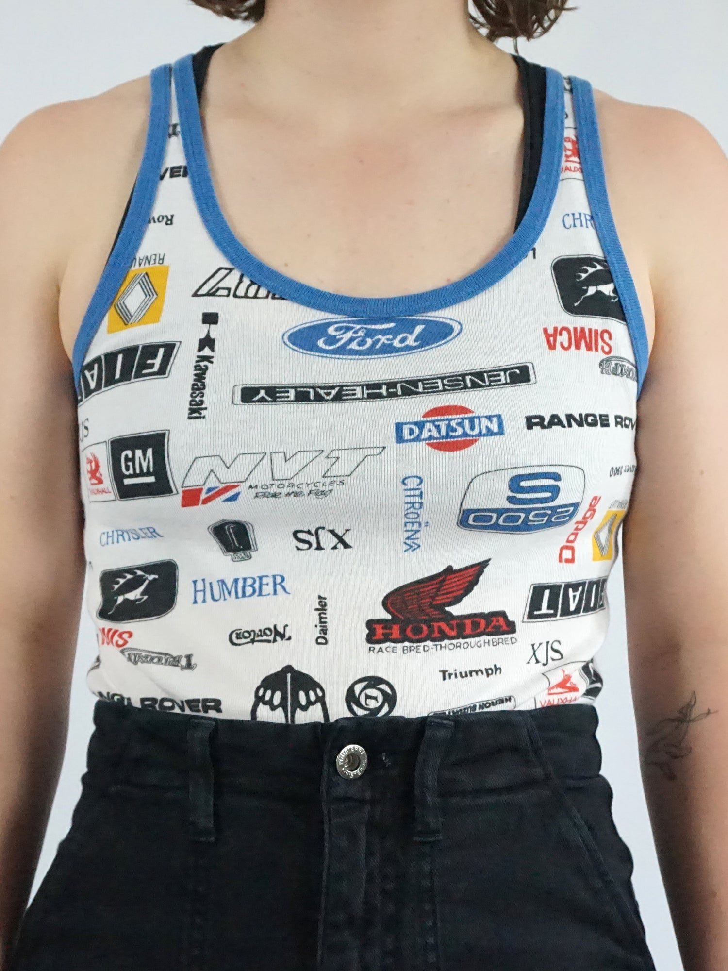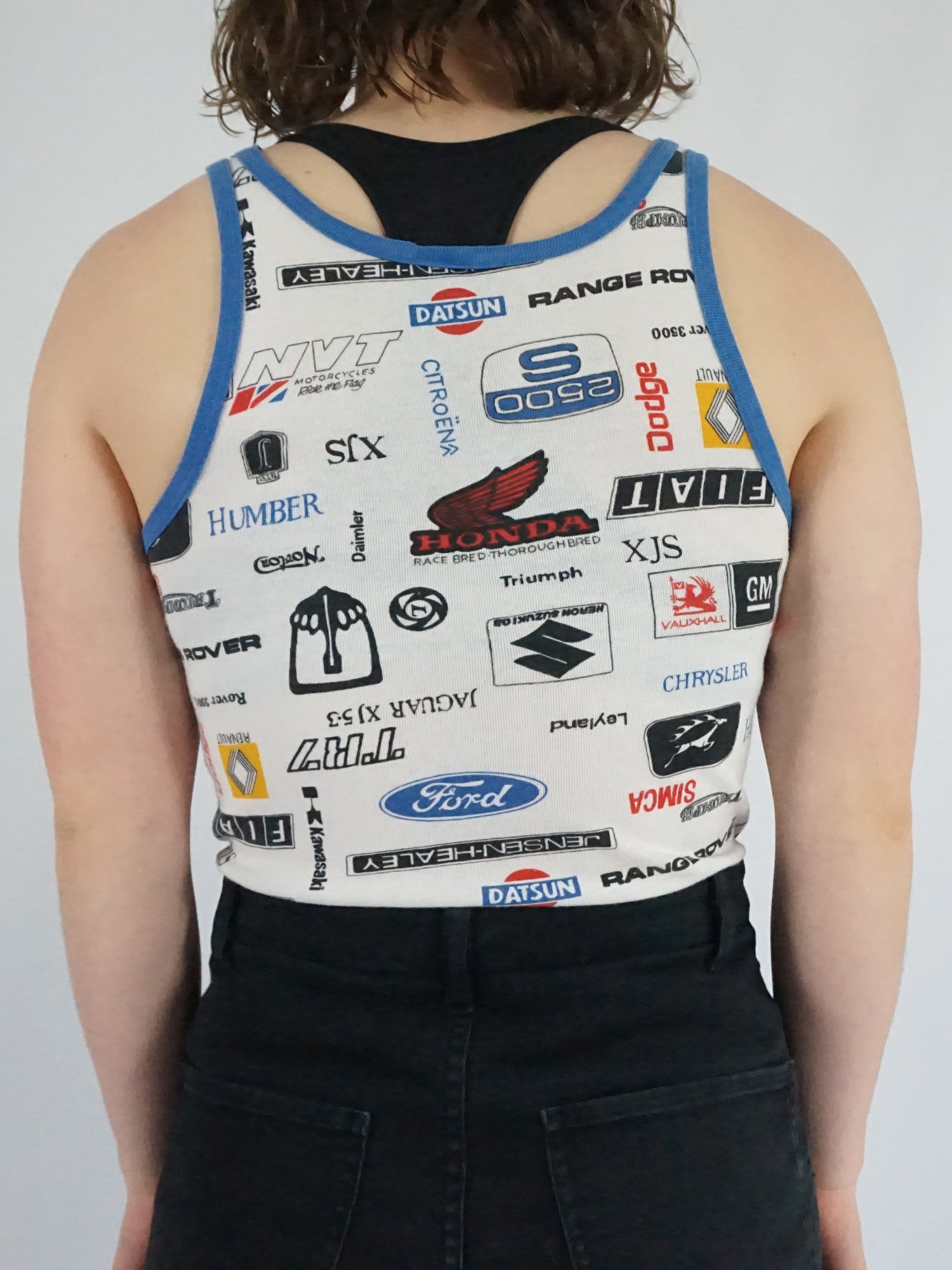 Vintage 70s St Michael white cotton vest top with a really cool car brand pattern all over.