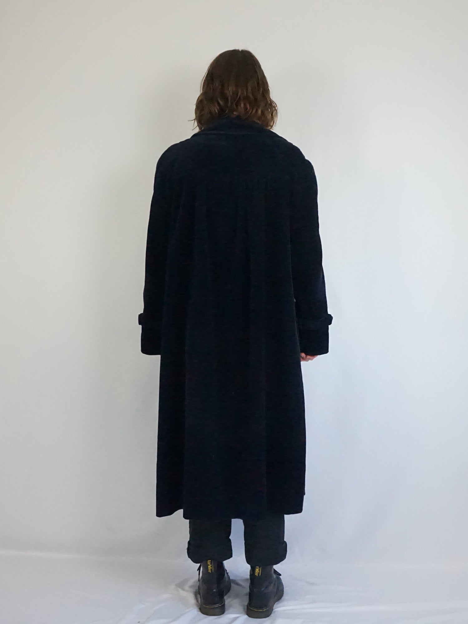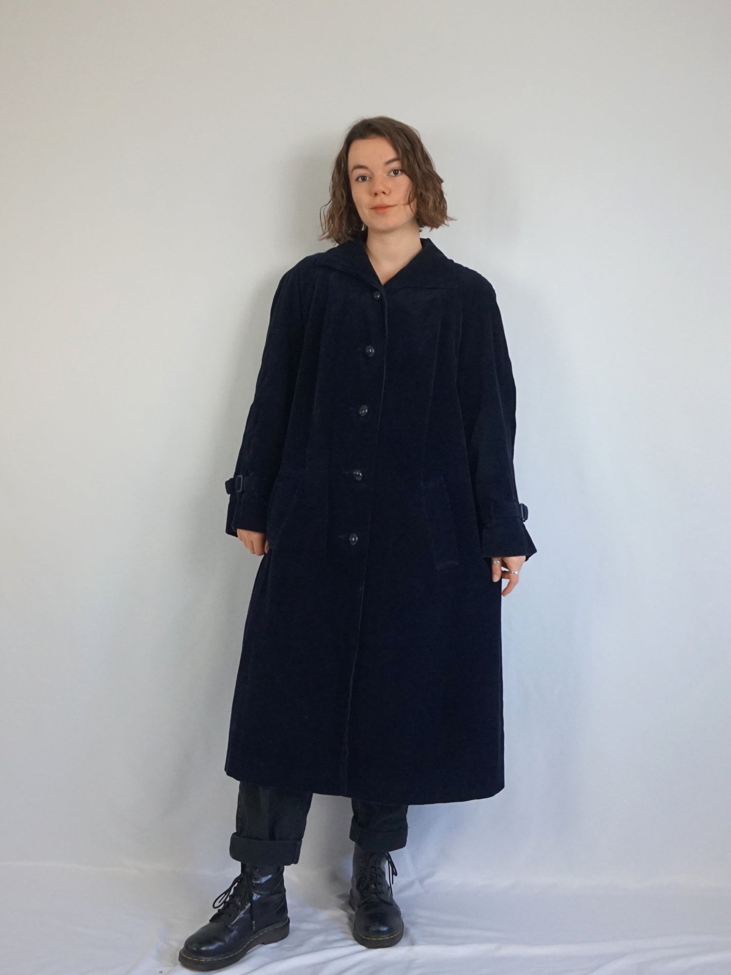 Vintage 70s navy blue chunky corduroy trench coat with pockets and a button down front.