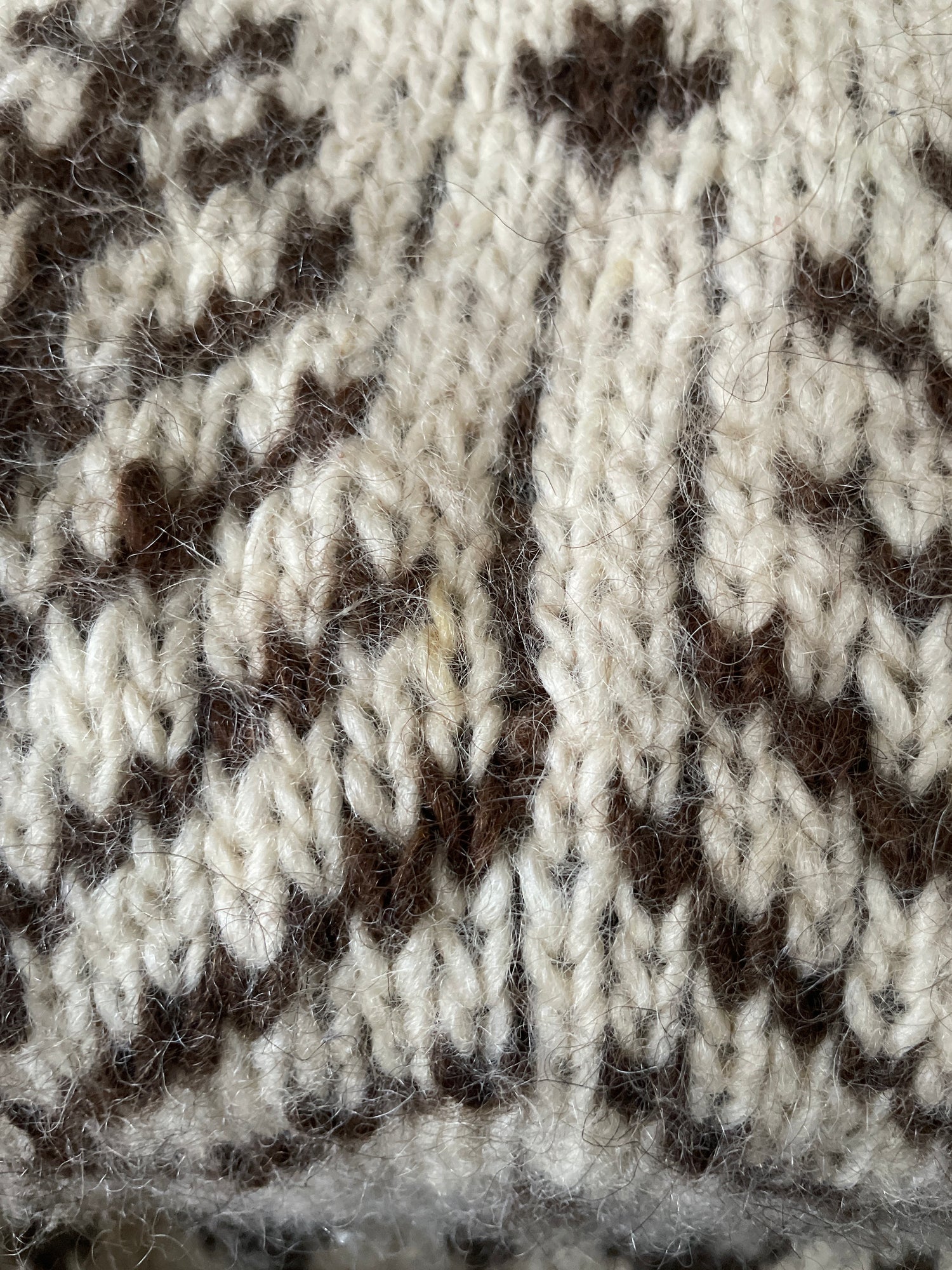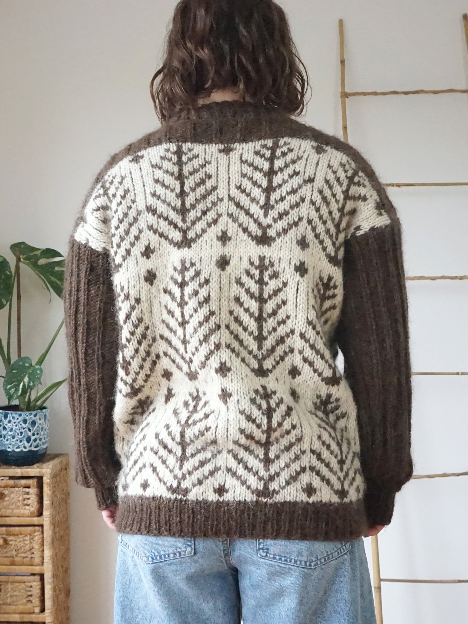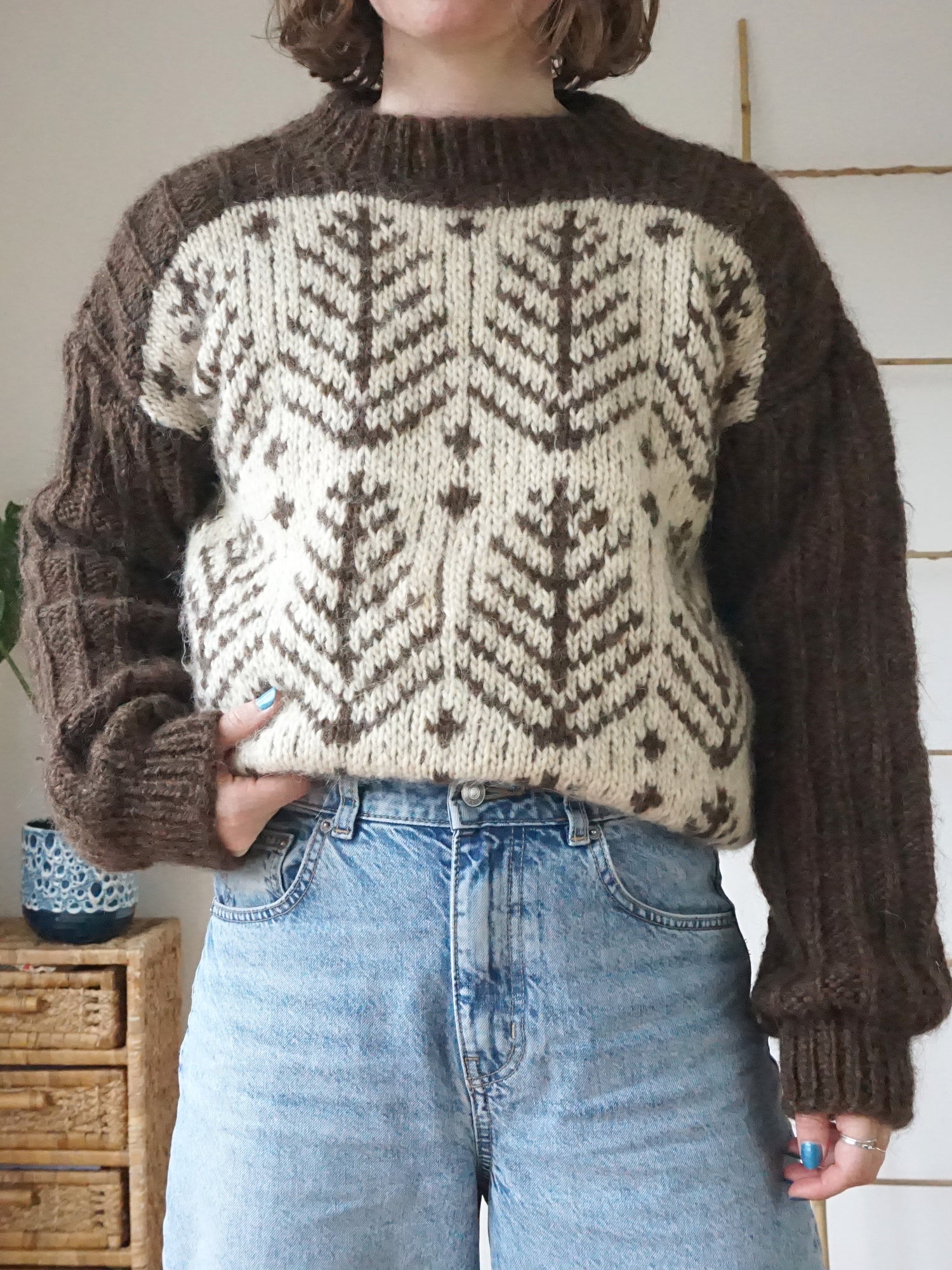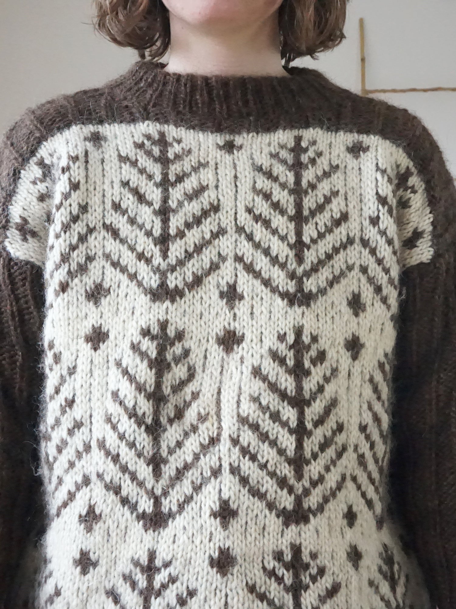 Vintage 80s ashy brown chunky wool jumper with a white and brown leaf pattern all over.