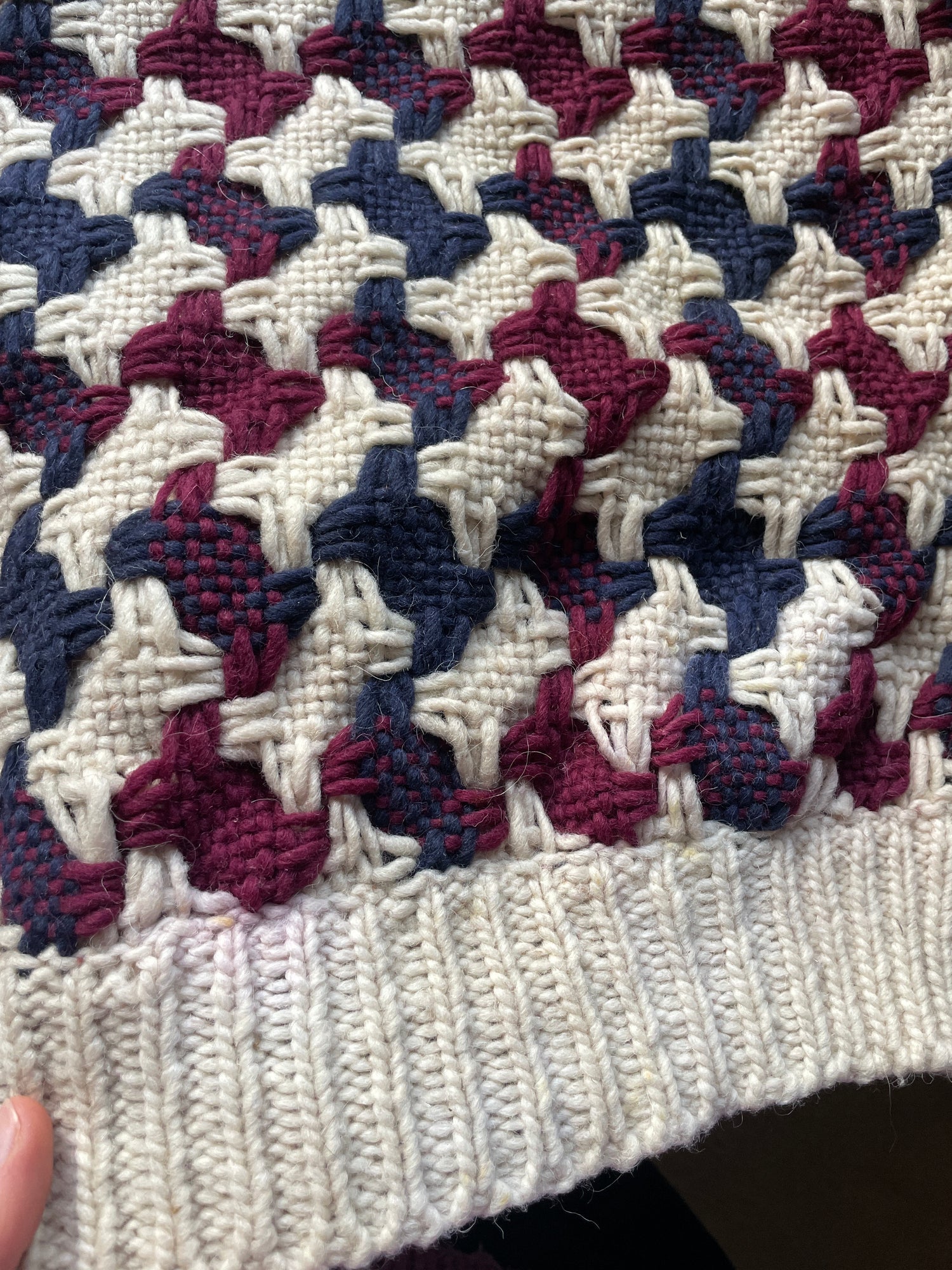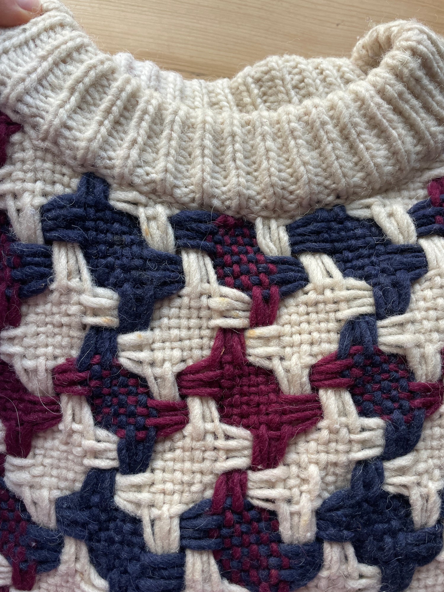 Vintage 90s chunky wool jumper in cream with a navy blue and burgundy woven pattern.
