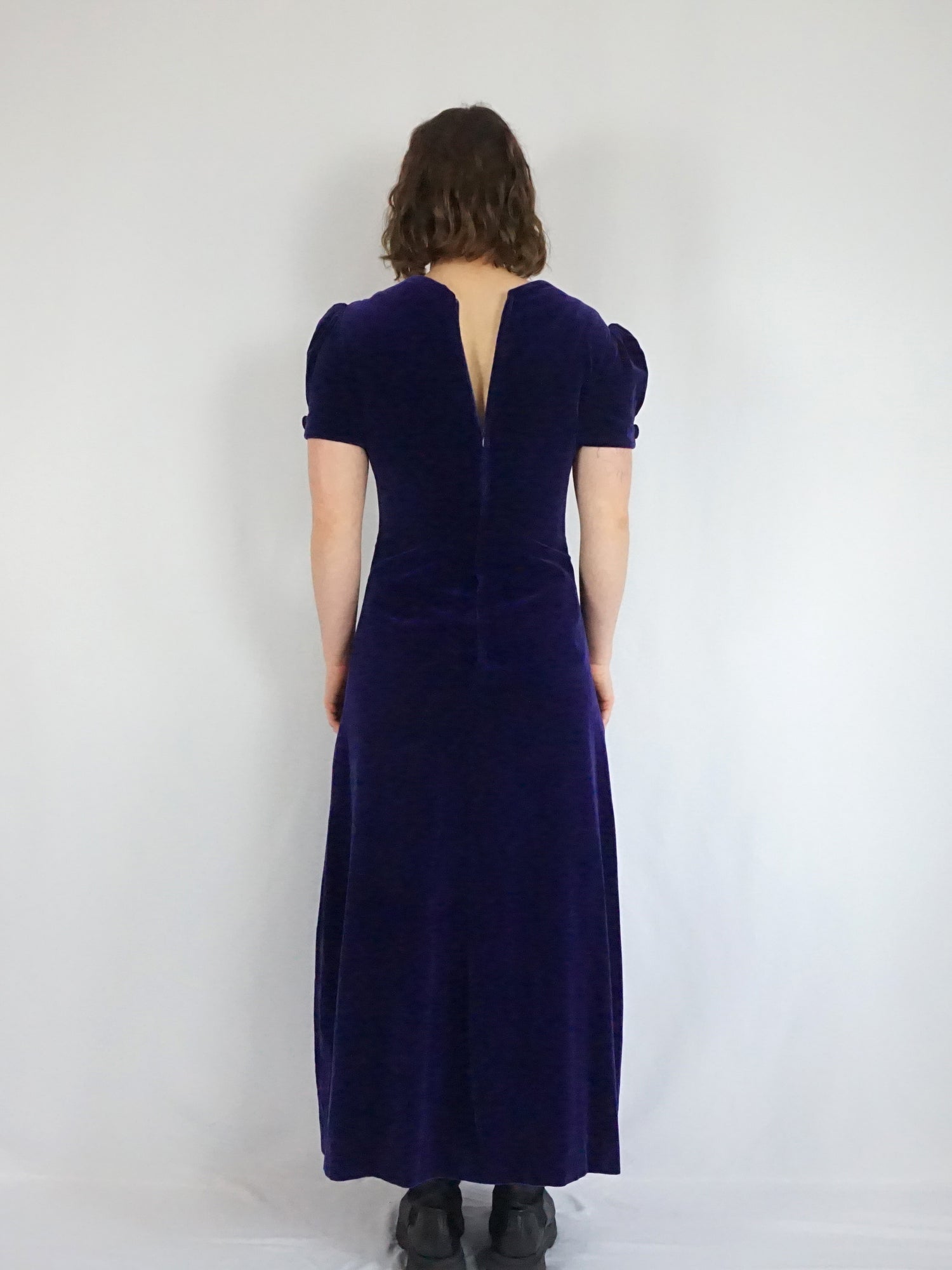 Vintage 70s Cadbury purple velvet maxi dress with a scoop neckline, puff sleeves and faux button detailing on the bust.