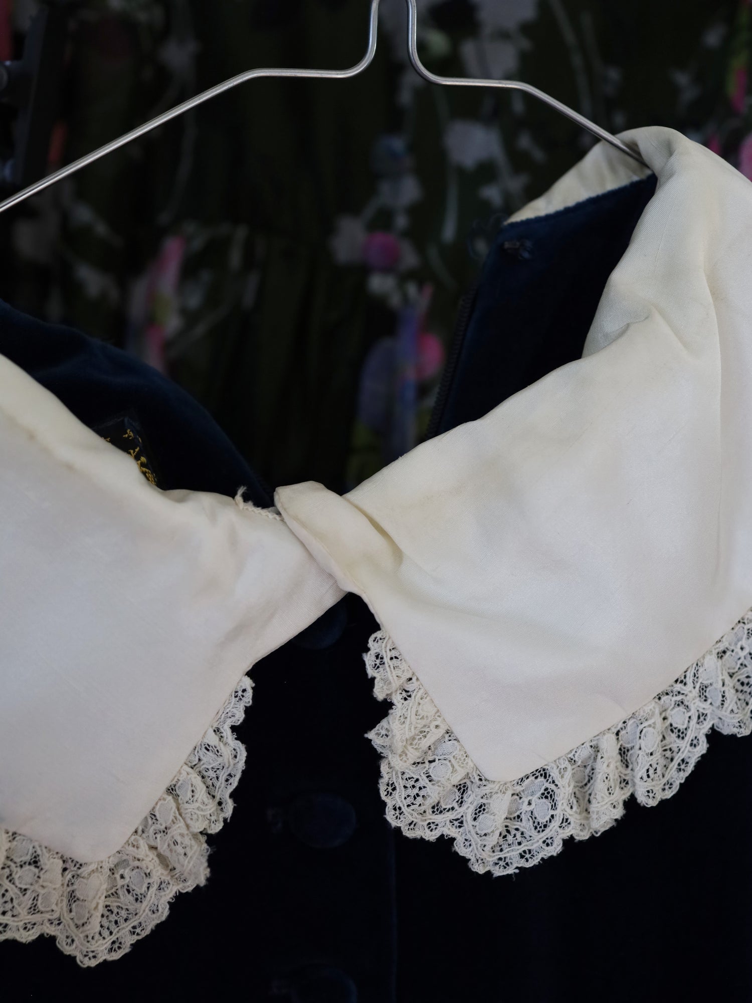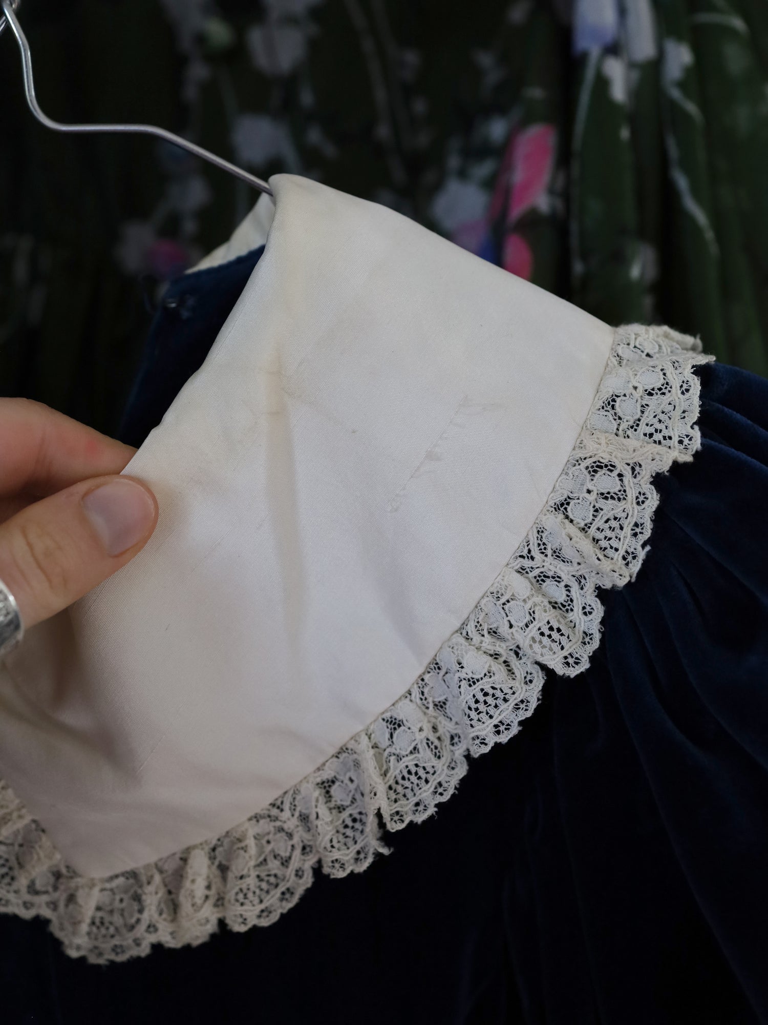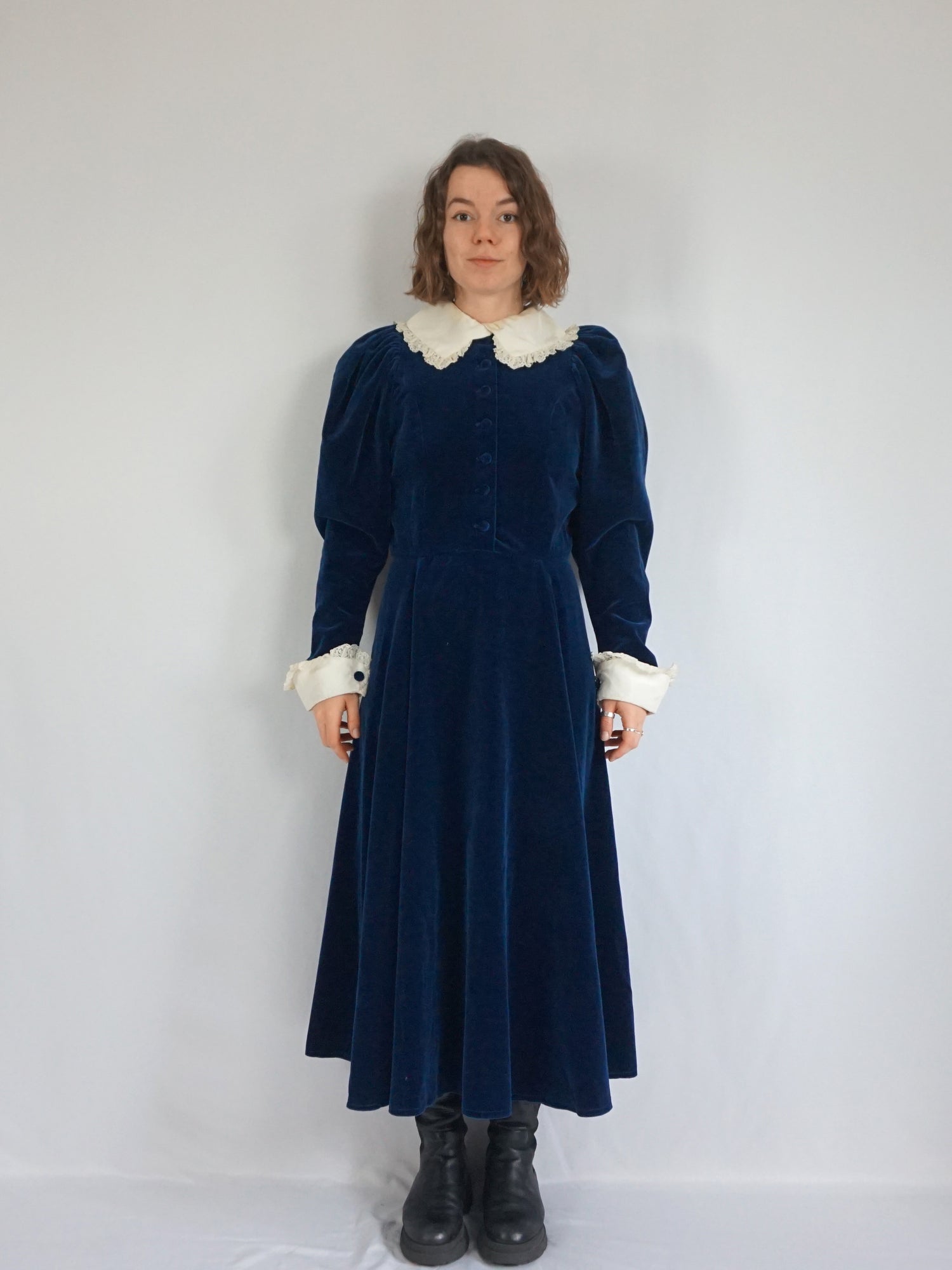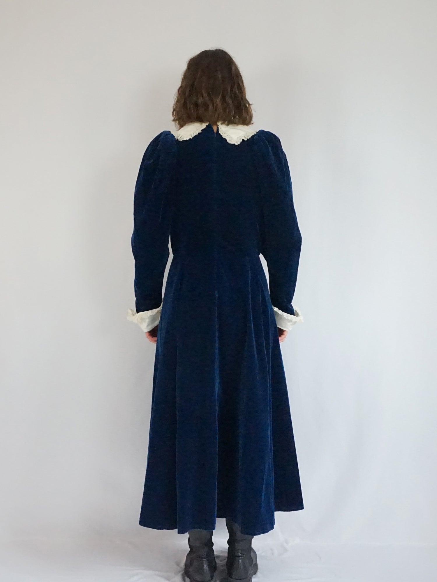 Vintage 80s Droopy and Browns navy blue maxi dress with dramatic balloon sleeves, oversized collar and cuffs, and a button front.