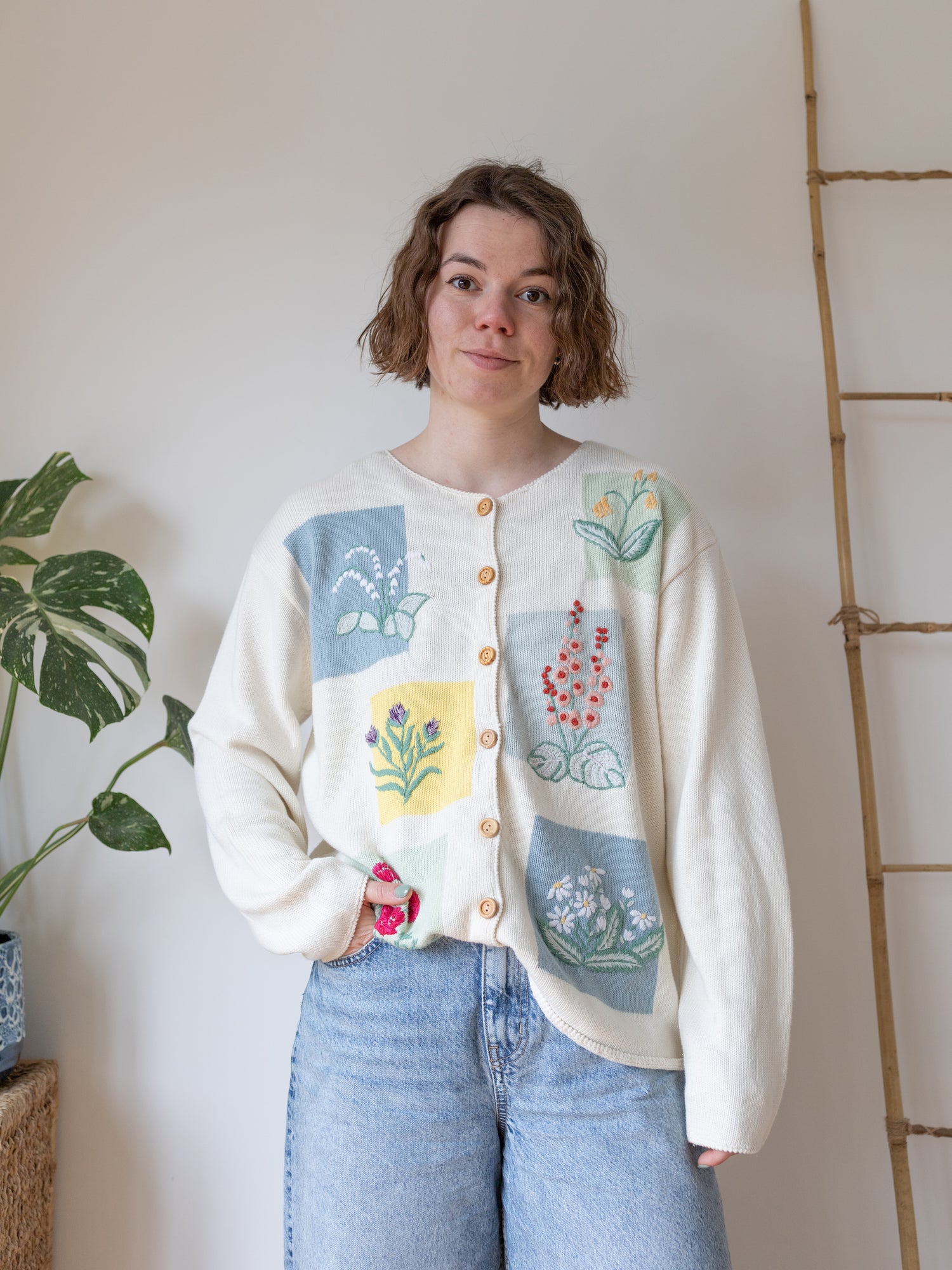 Vintage 90s white cotton cardigan with floral patchwork embroidery on the front and wooden buttons.