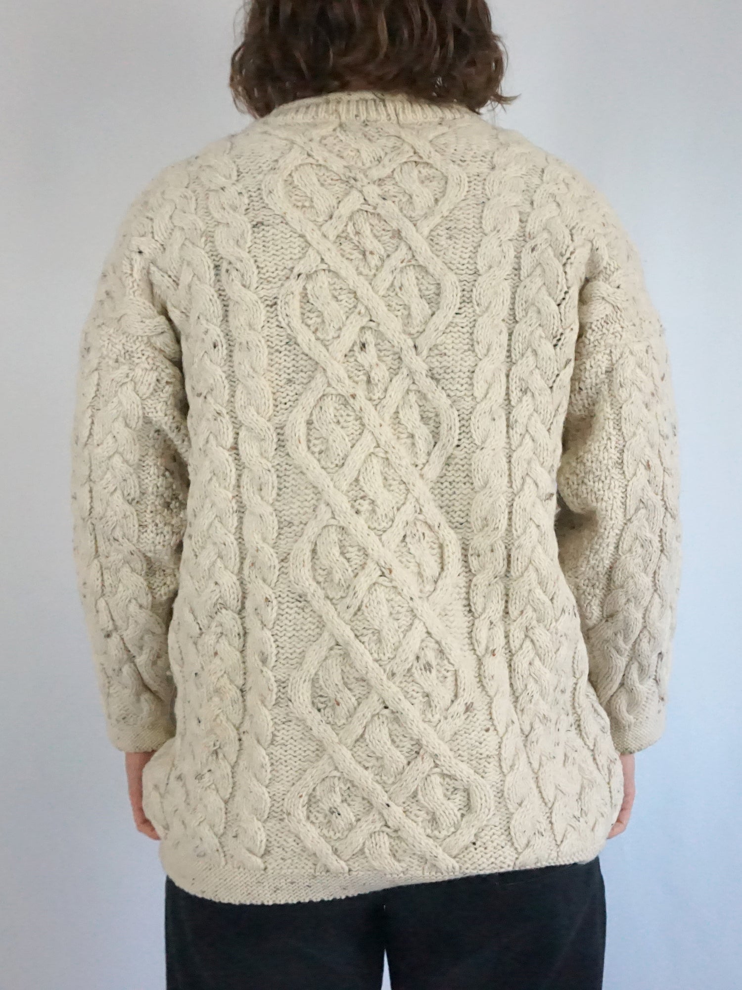 Vintage 90s speckled wool jumper with cable knit texture and floral embroidery on the front.