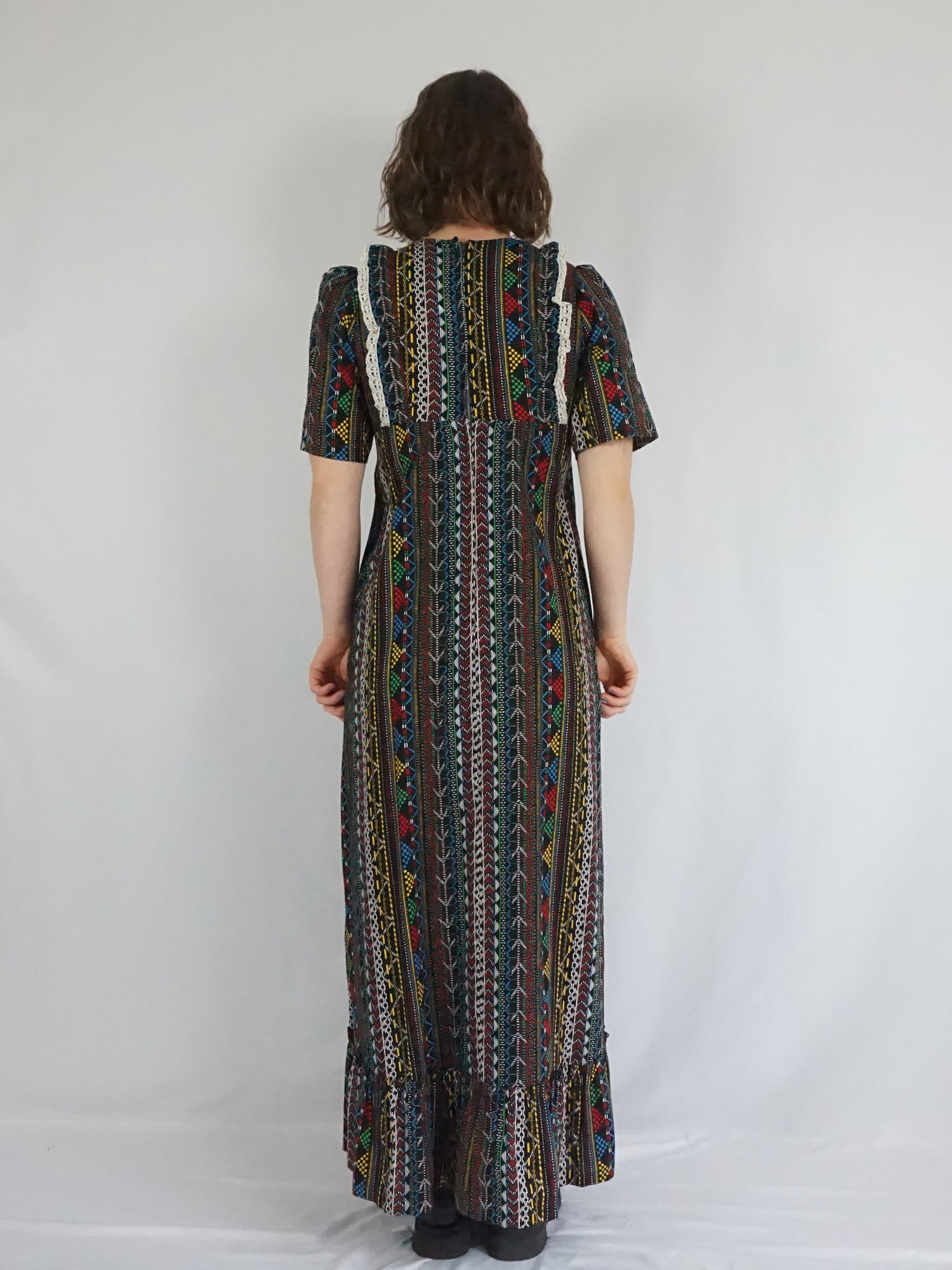 Vintage 70s black cotton maxi dress with a colourful geometric print, square neckline and crochet detailing.