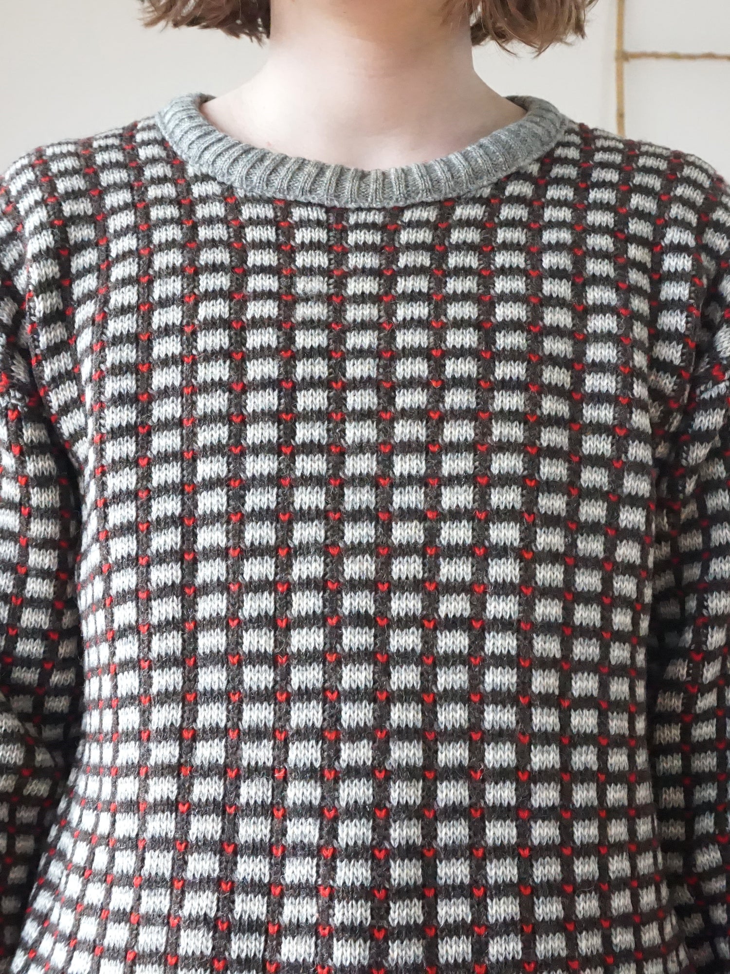 Vintage 80s pure wool made in Norway grey, black and red wool jumper with a patterned design.