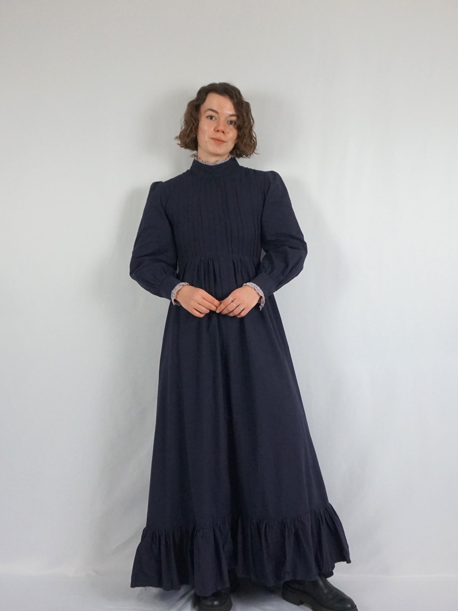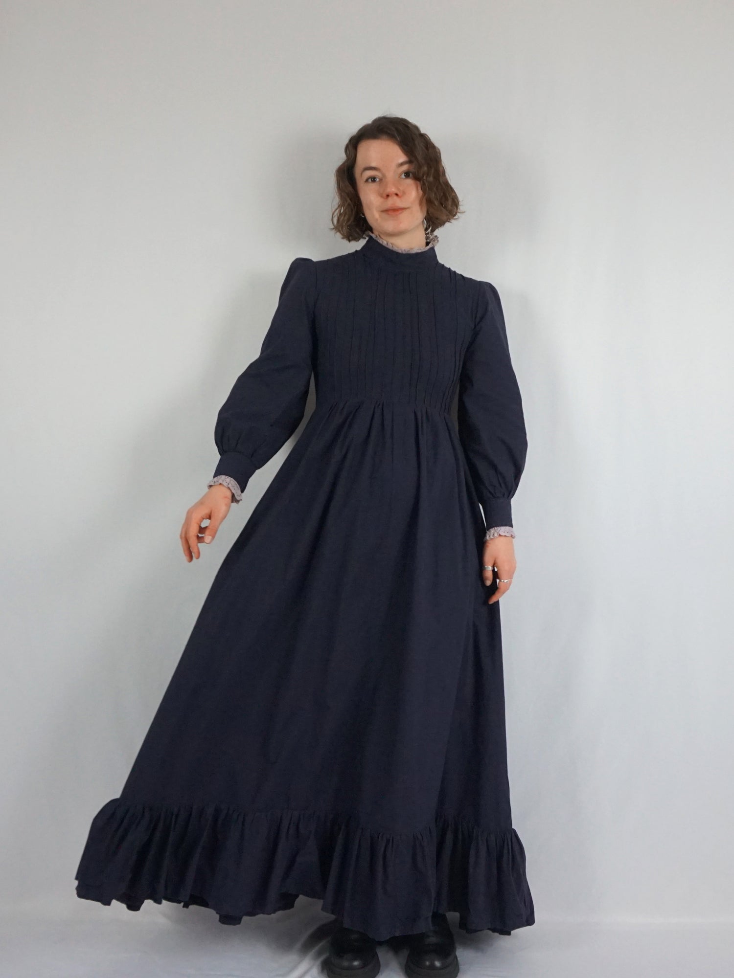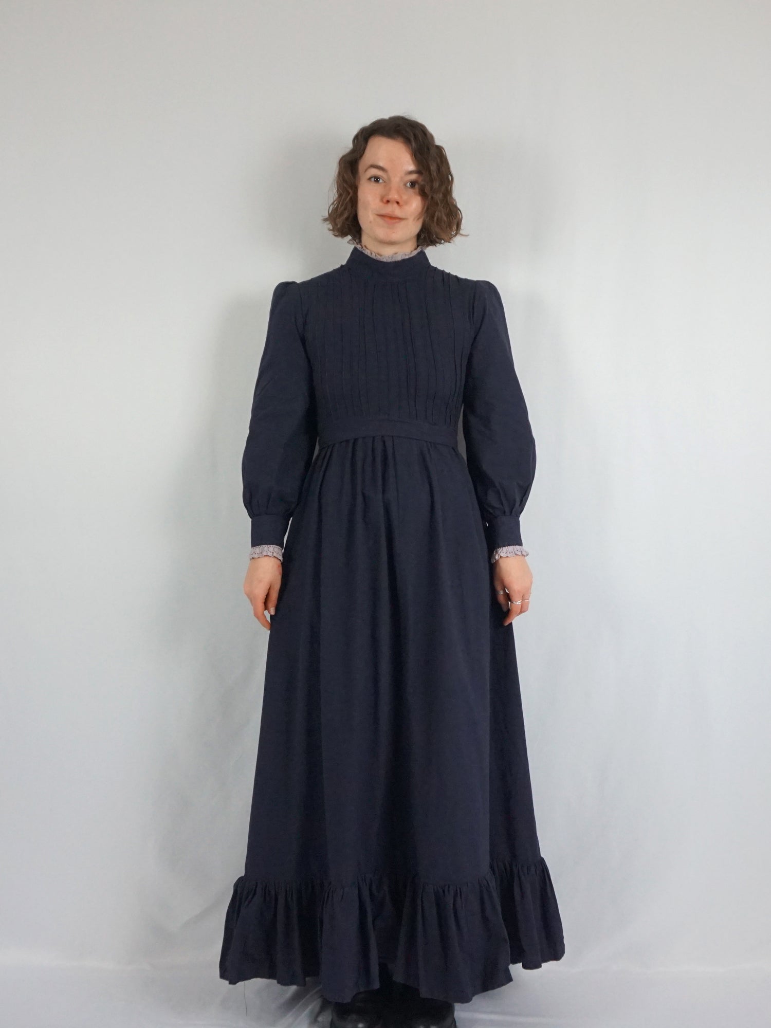 Vintage 70s Laura Ashley made in Wales rare black cotton maxi dress with puff sleeves, a large sweep skirt, piecrust collar and pintuck bust detail.