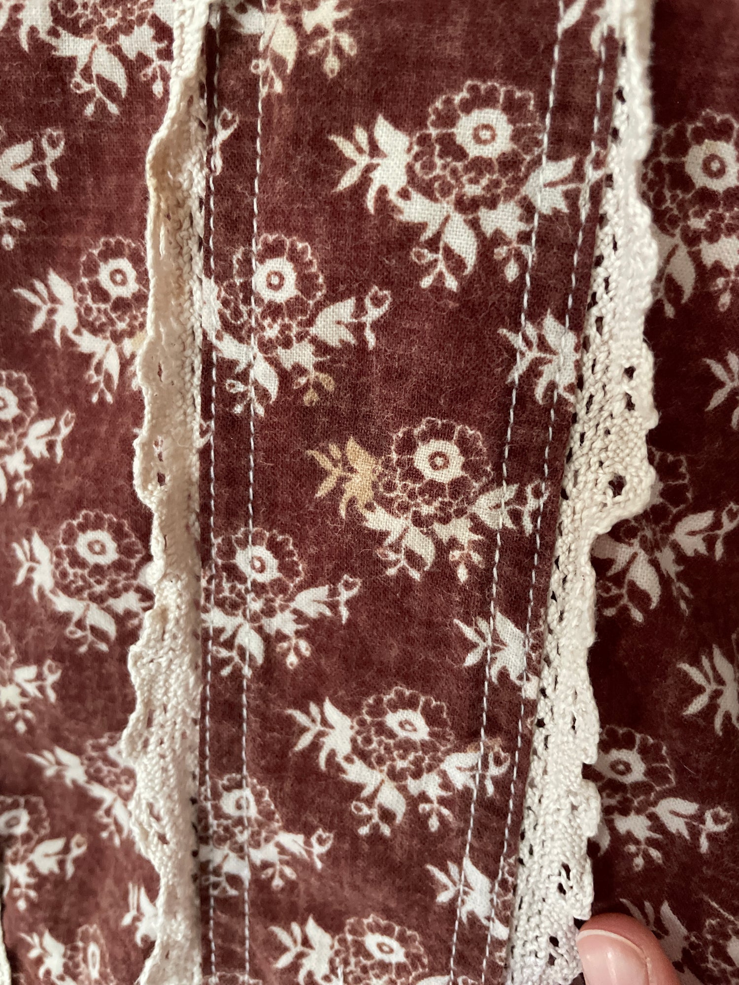 True vintage, not a reproduction. A beautiful heritage Laura Ashley design with soft prairie styling and intricate crochet accents.