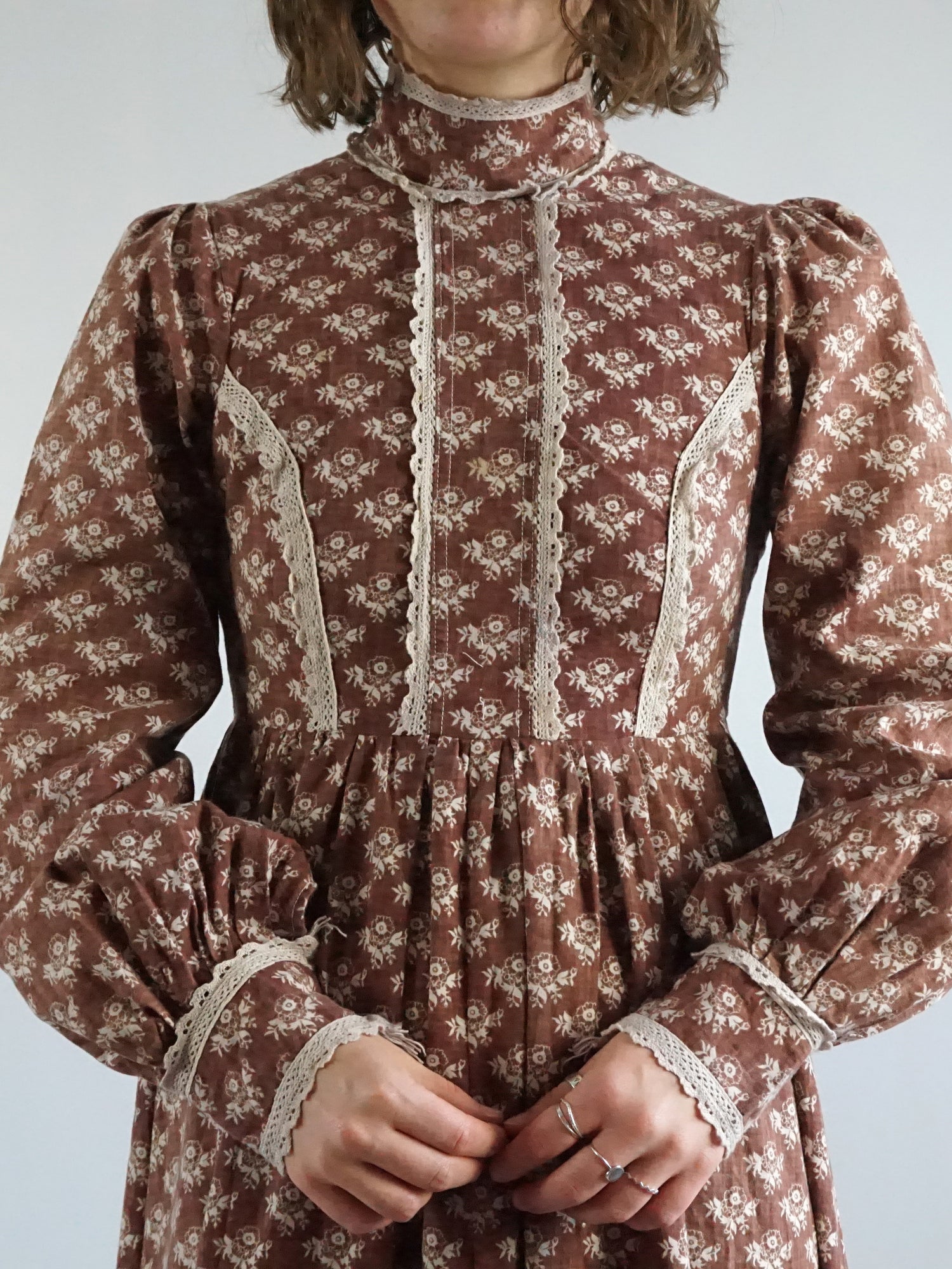 Vintage 70s Laura Ashley brown ditsy floral cotton maxi dress with long puff sleeves, a high neckline and crochet detailing.
