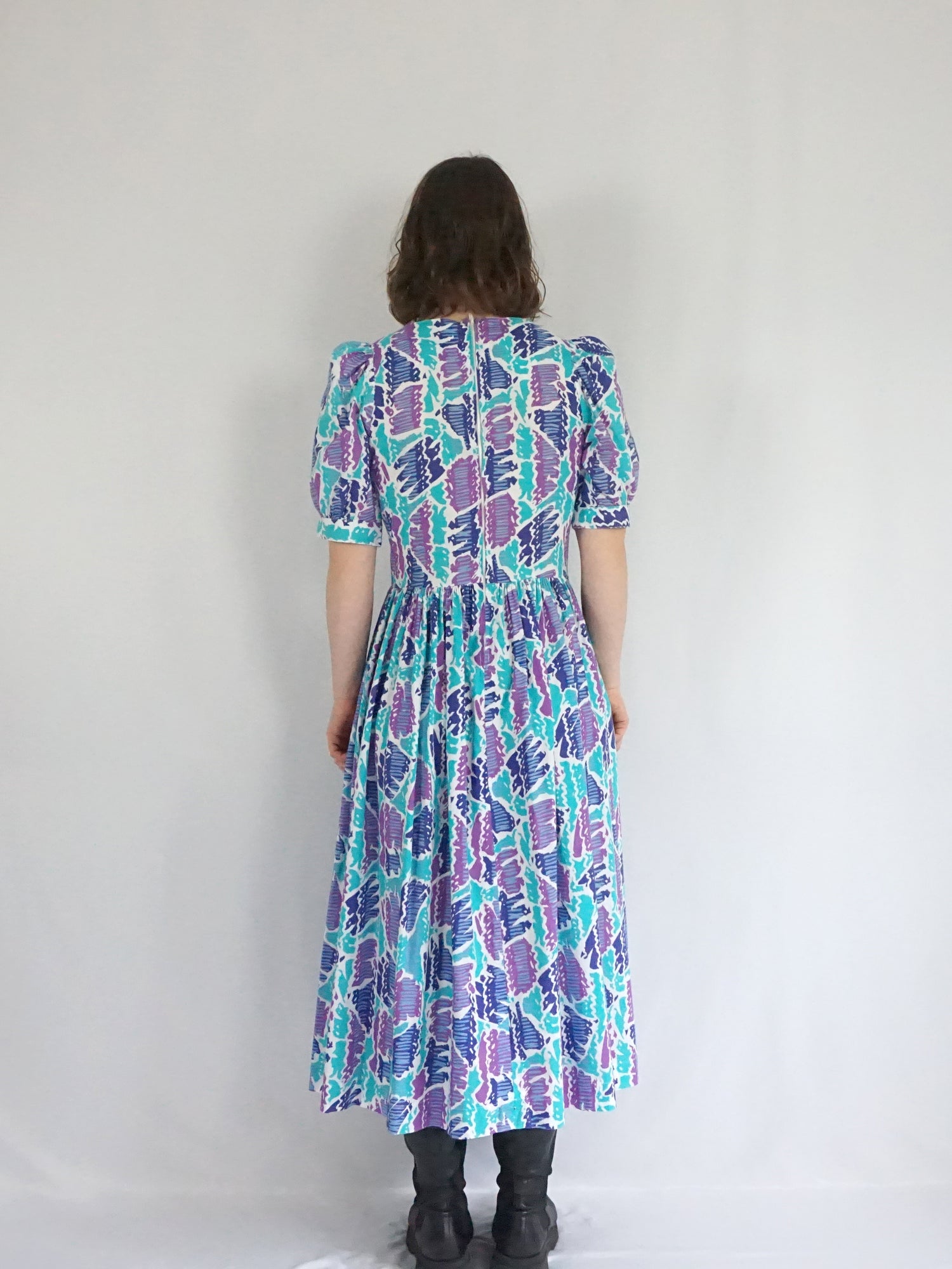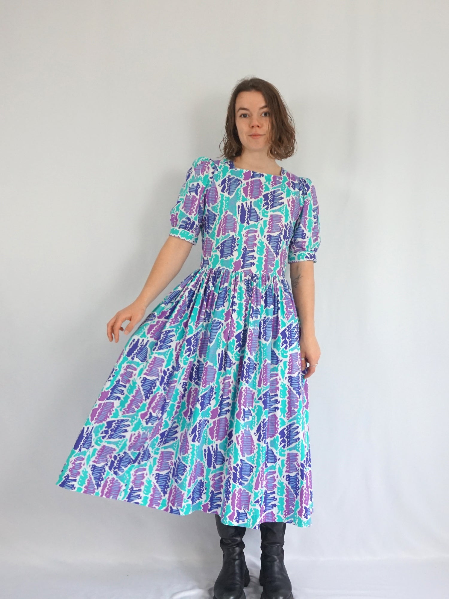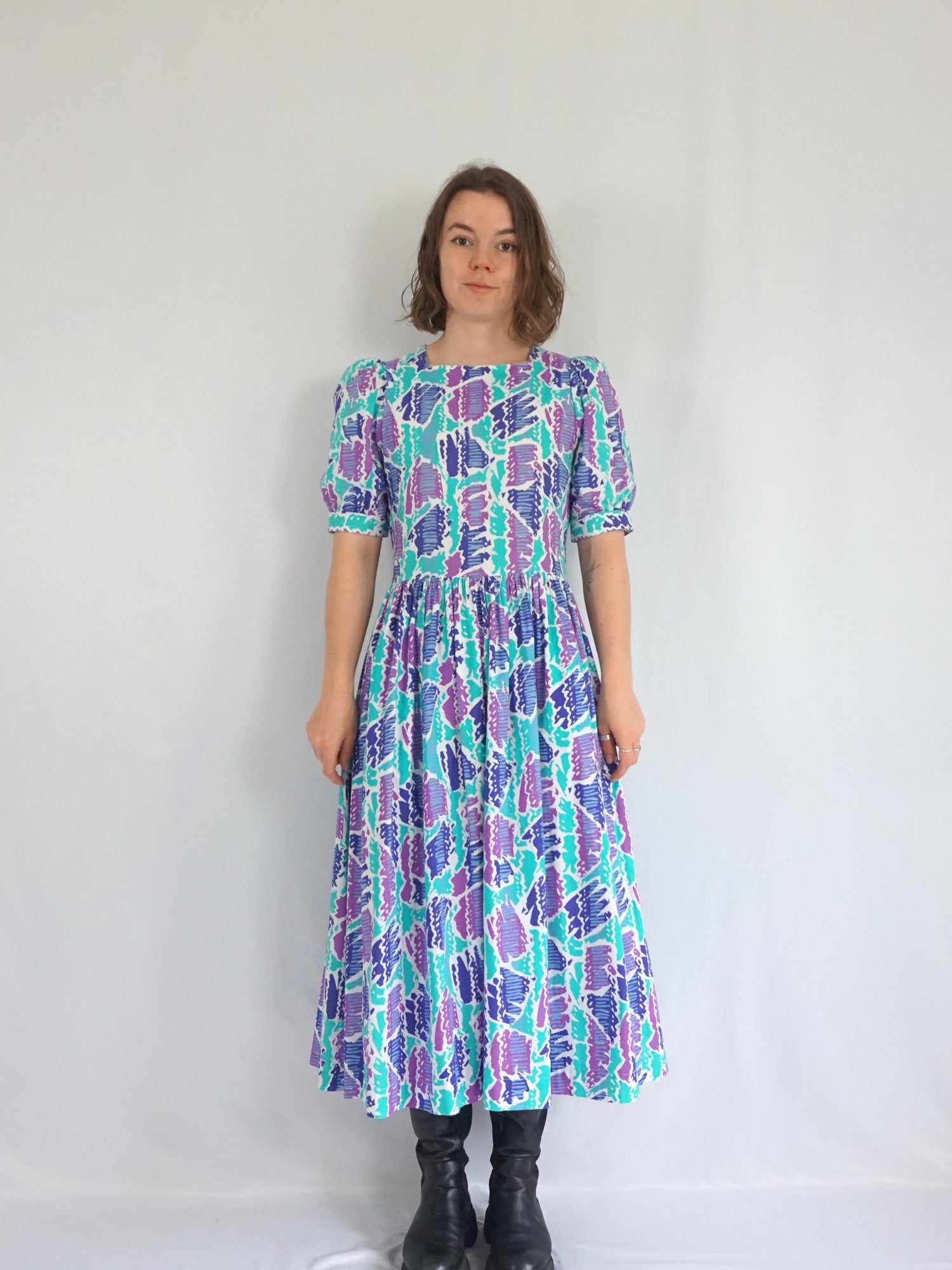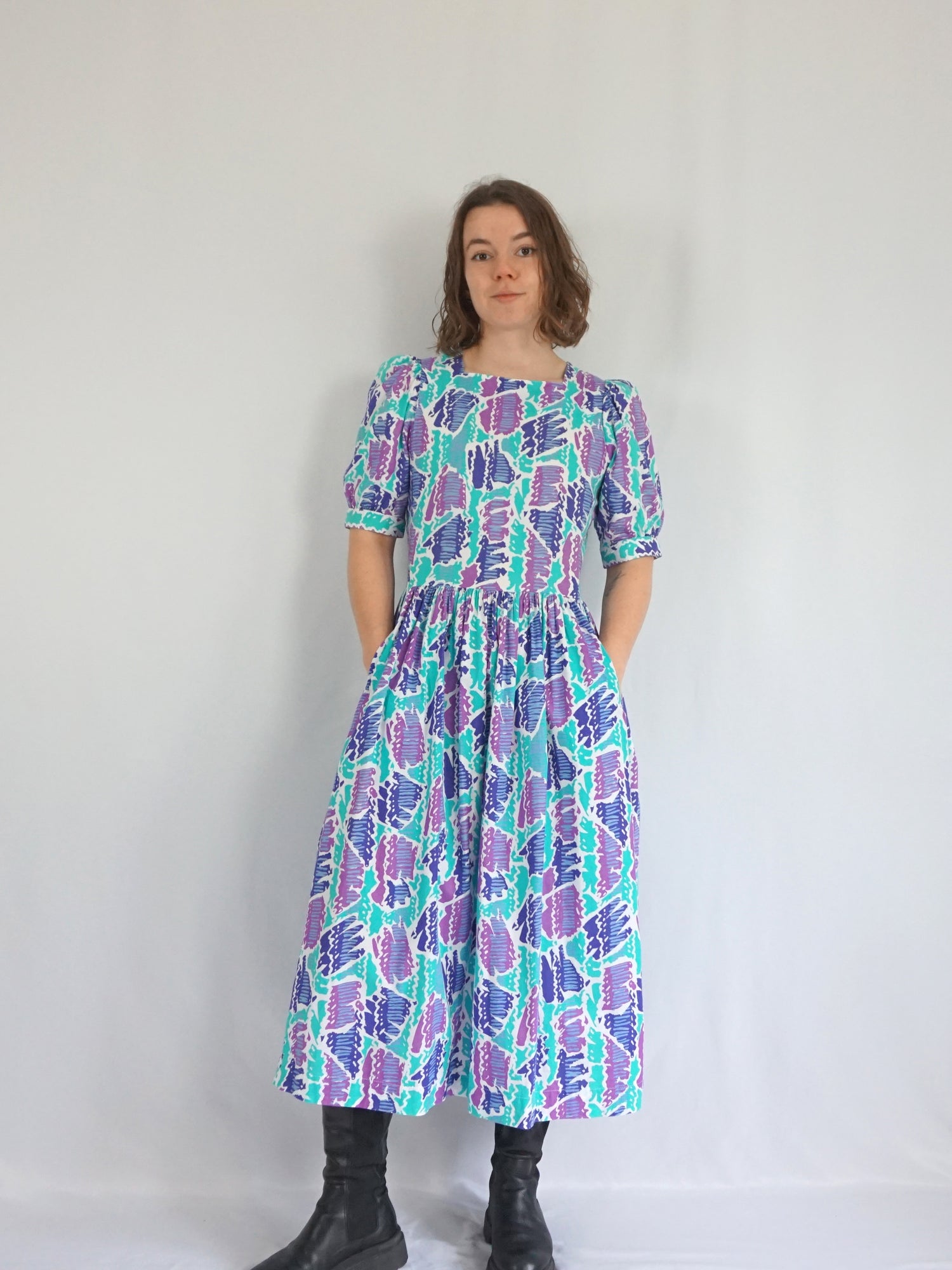 Vintage 80s Laura Ashley cotton maxi dress in blue and purple with a funky brushstroke pattern, puff sleeves and pockets.