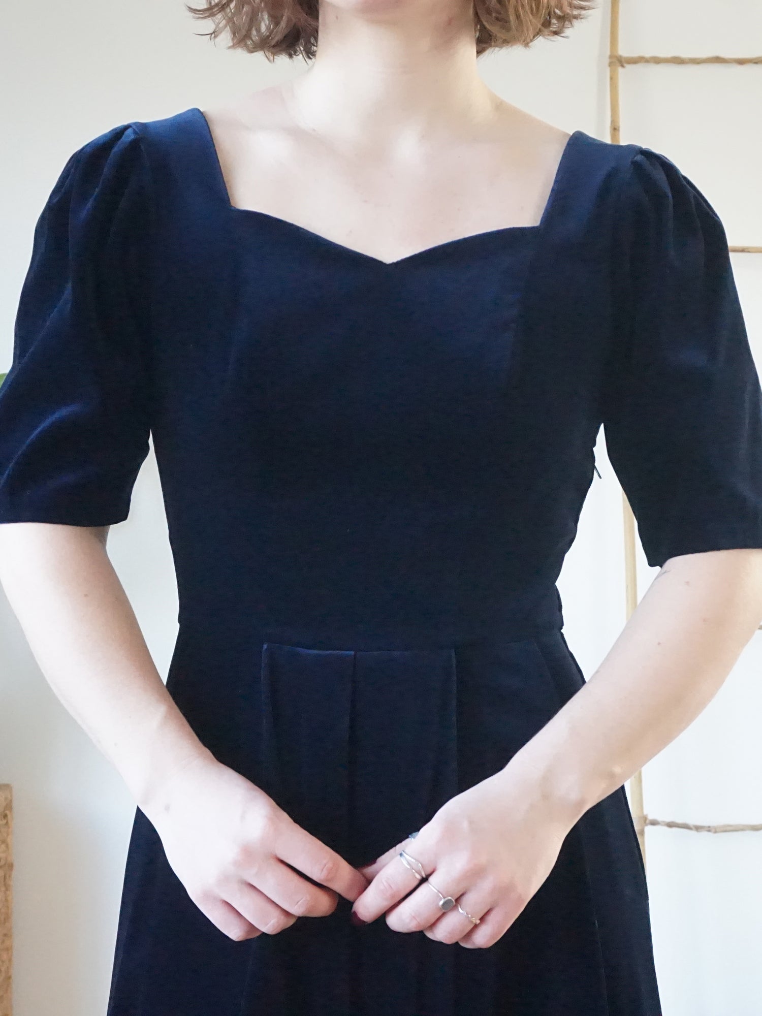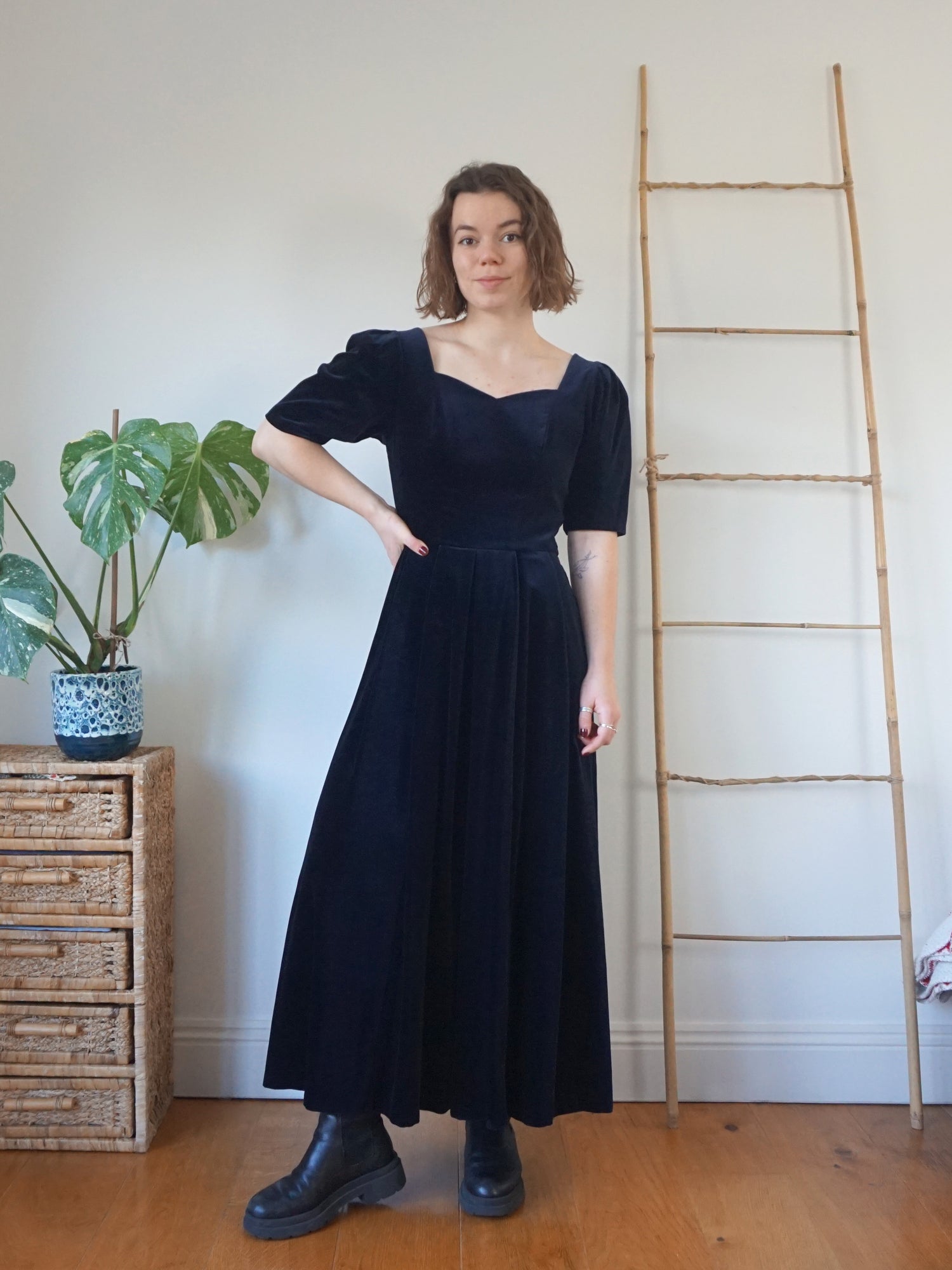 Vintage 80s Laura Ashley navy blue velvet maxi dress with a sweetheart neckline, puff sleeves and fabric covered buttons down the back.