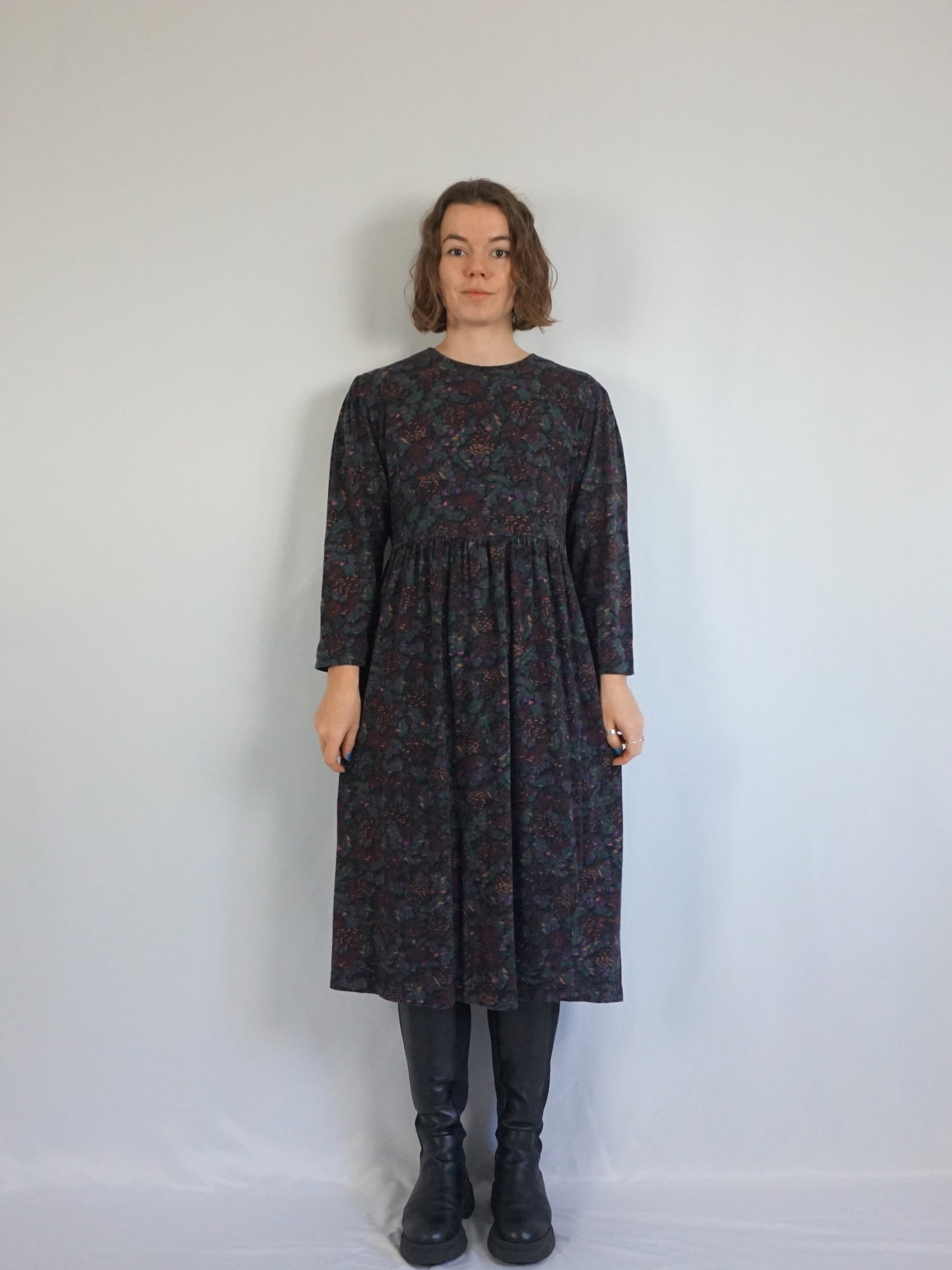Vintage 80s Laura Ashley cotton midi dress with a pinecone pattern in black with autumnal tones, long sleeves and pockets.