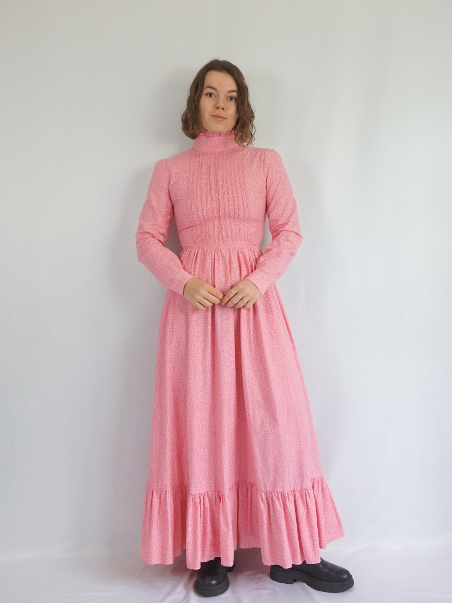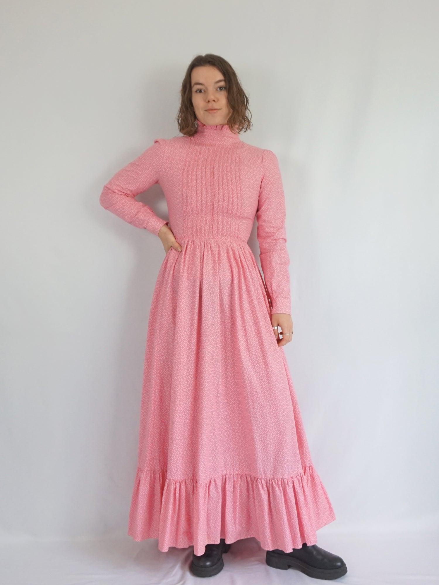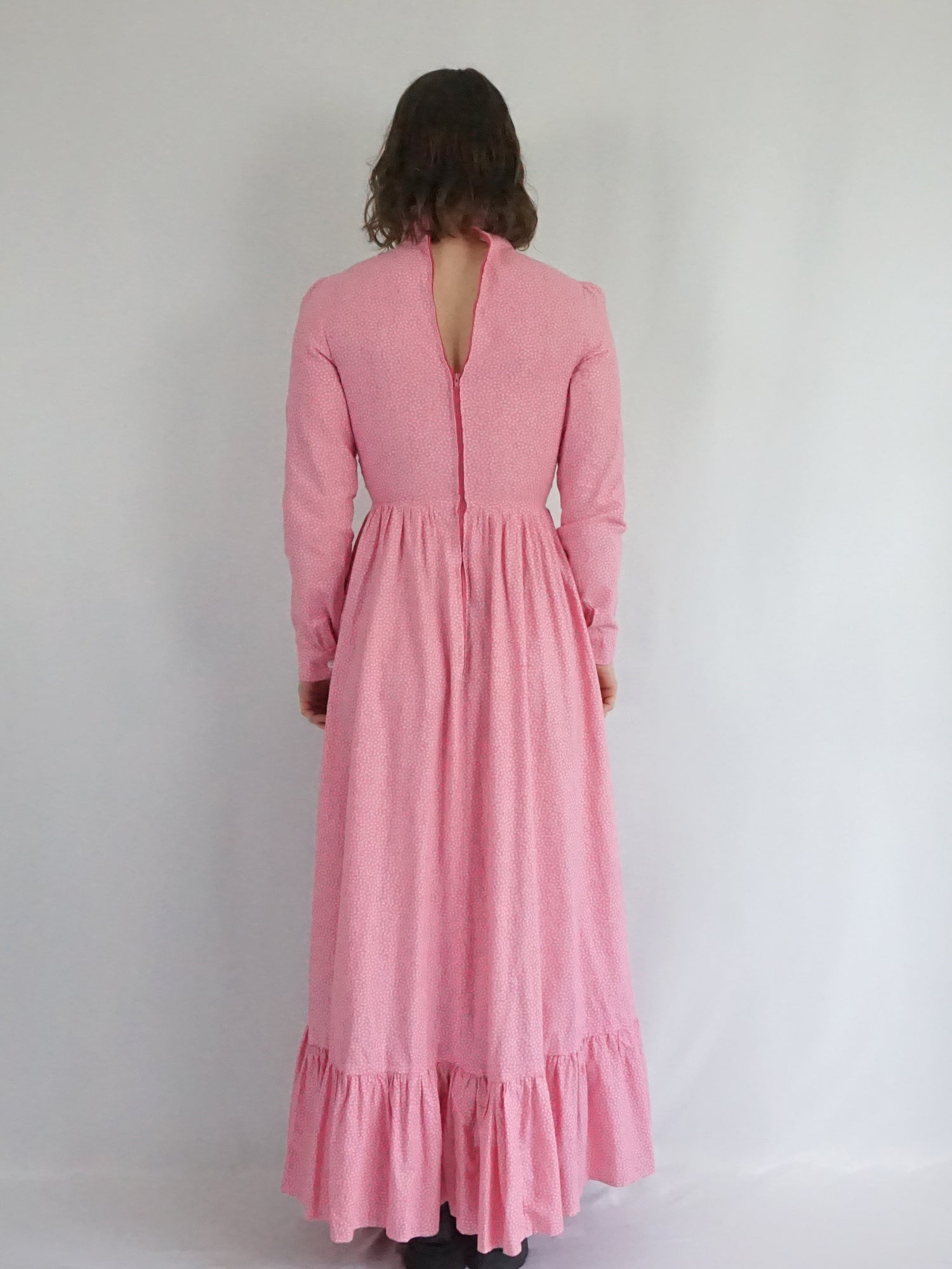 Vintage 70s Laura Ashley cotton prairie style maxi dress in pink with a ditsy floral print, long puff sleeves, pintuck detailing and a huge sweep on the skirt.