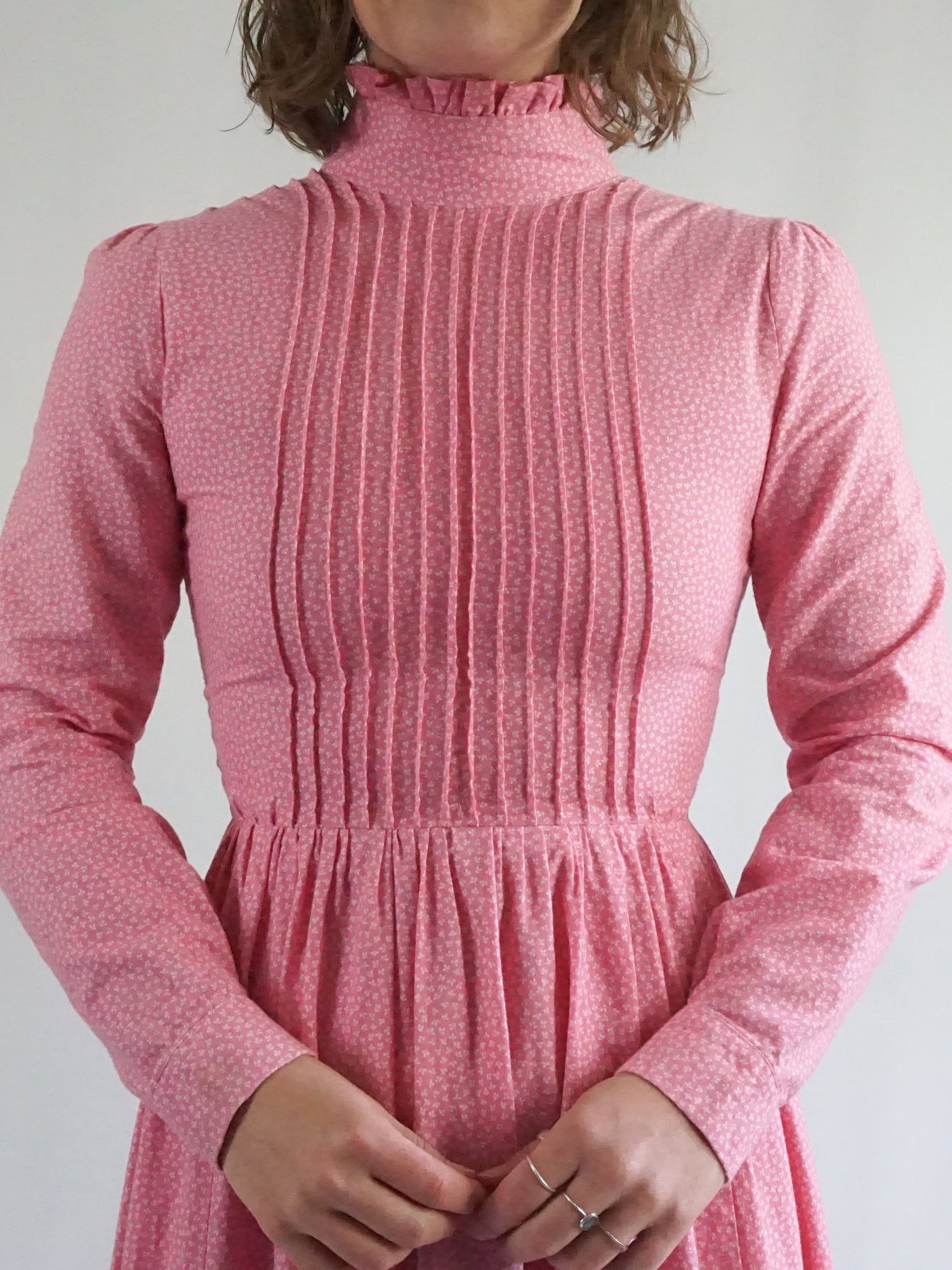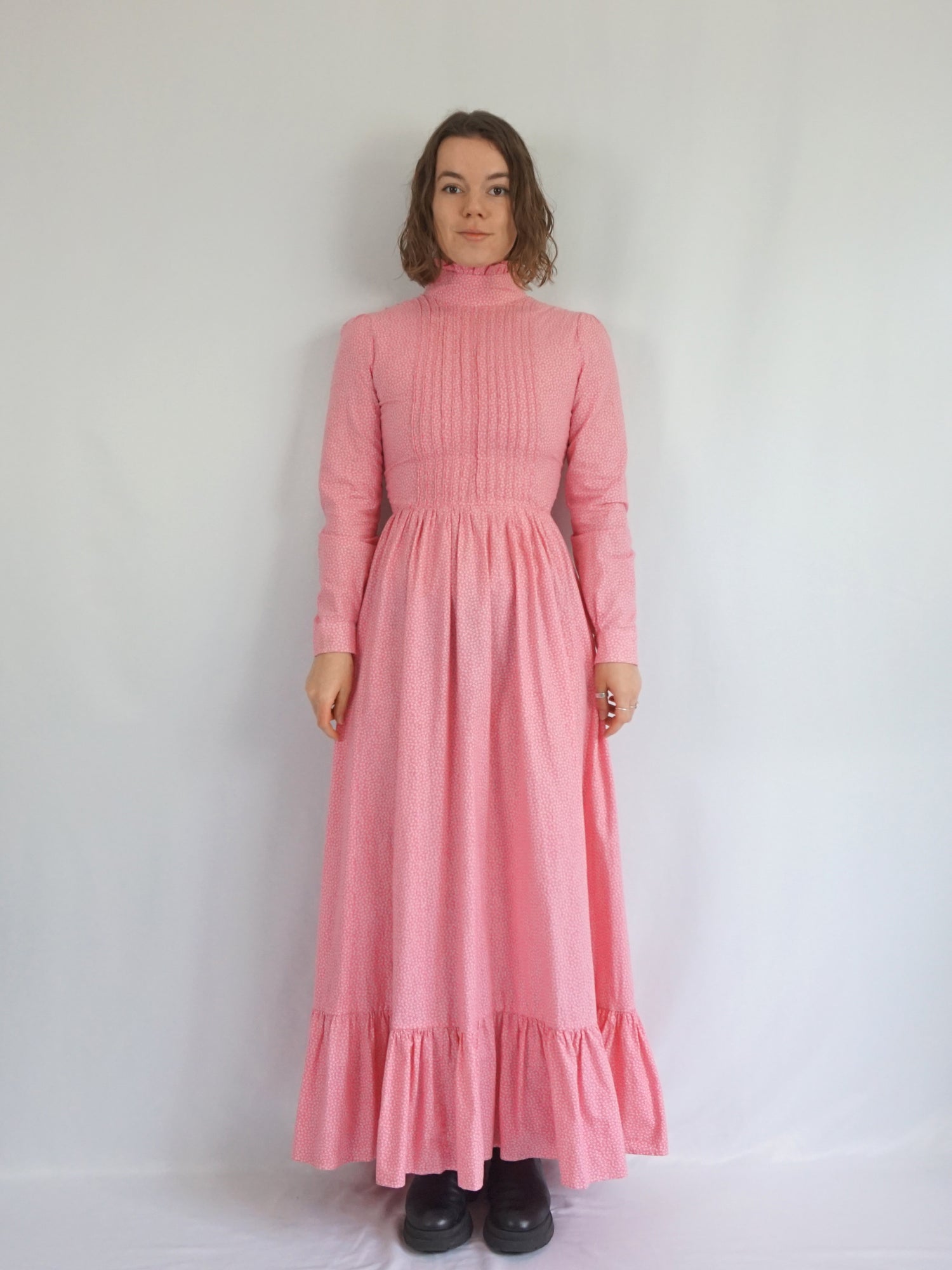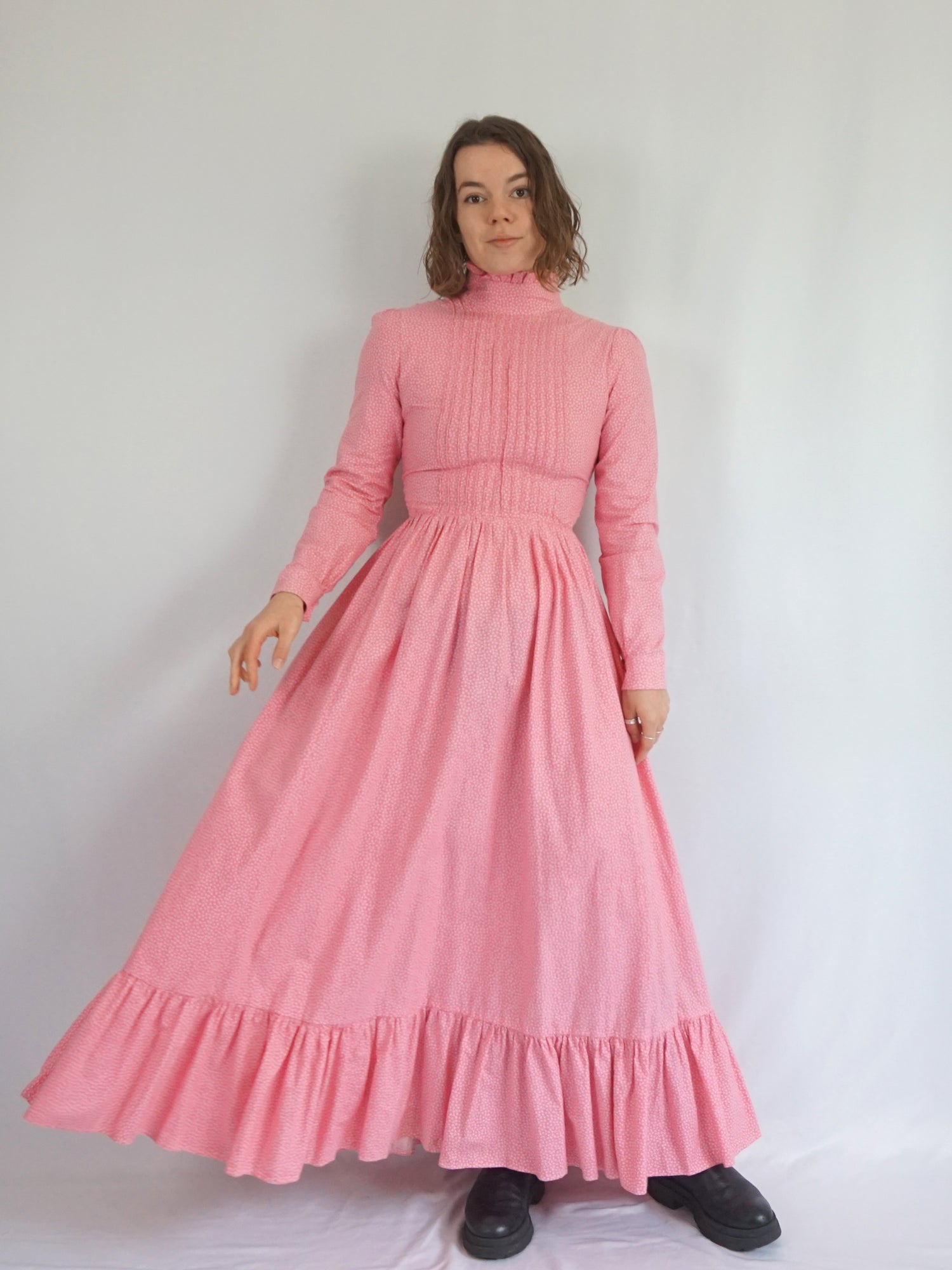 Vintage 70s Laura Ashley cotton prairie style maxi dress in pink with a ditsy floral print, long puff sleeves, pintuck detailing and a huge sweep on the skirt.