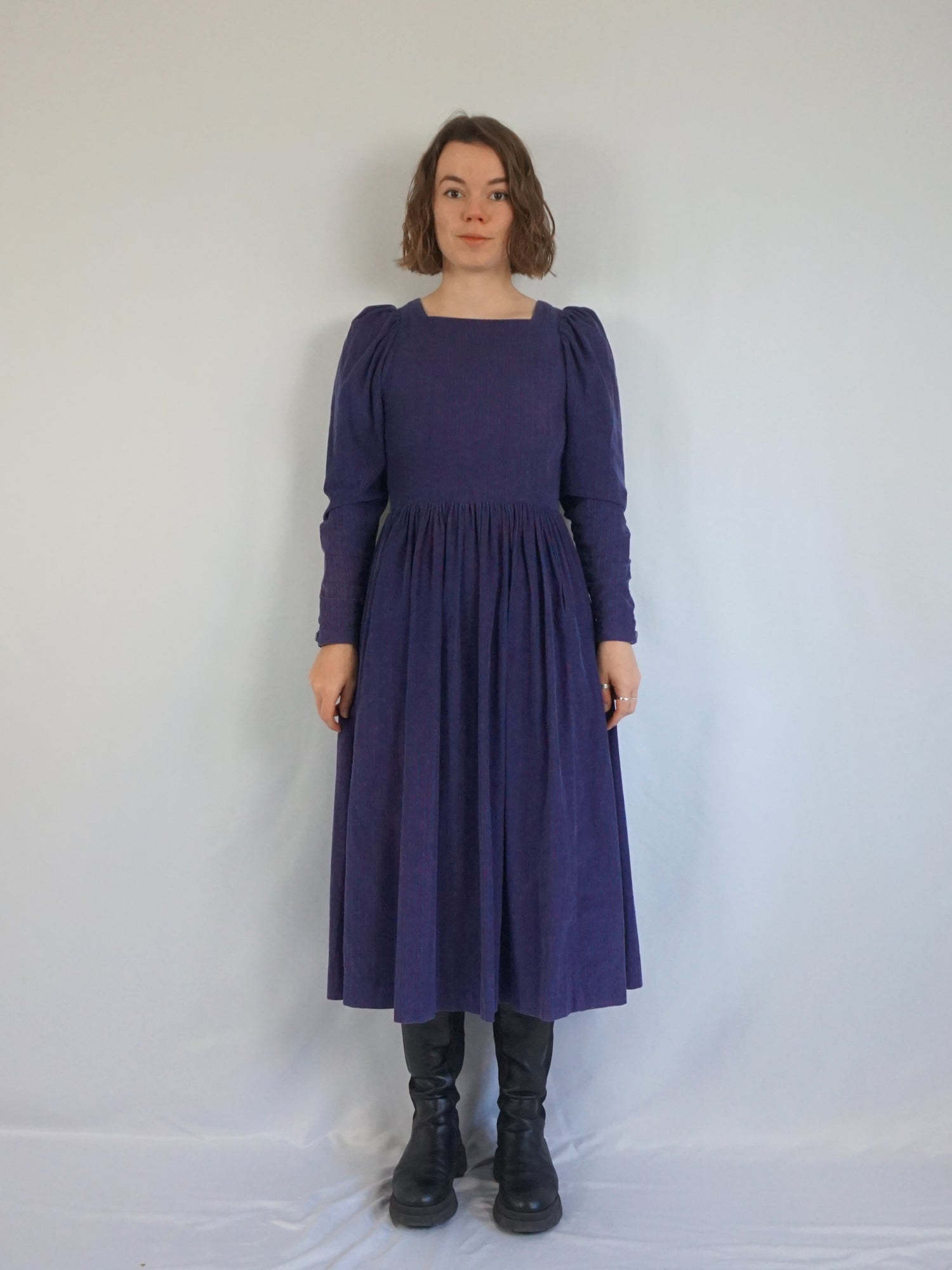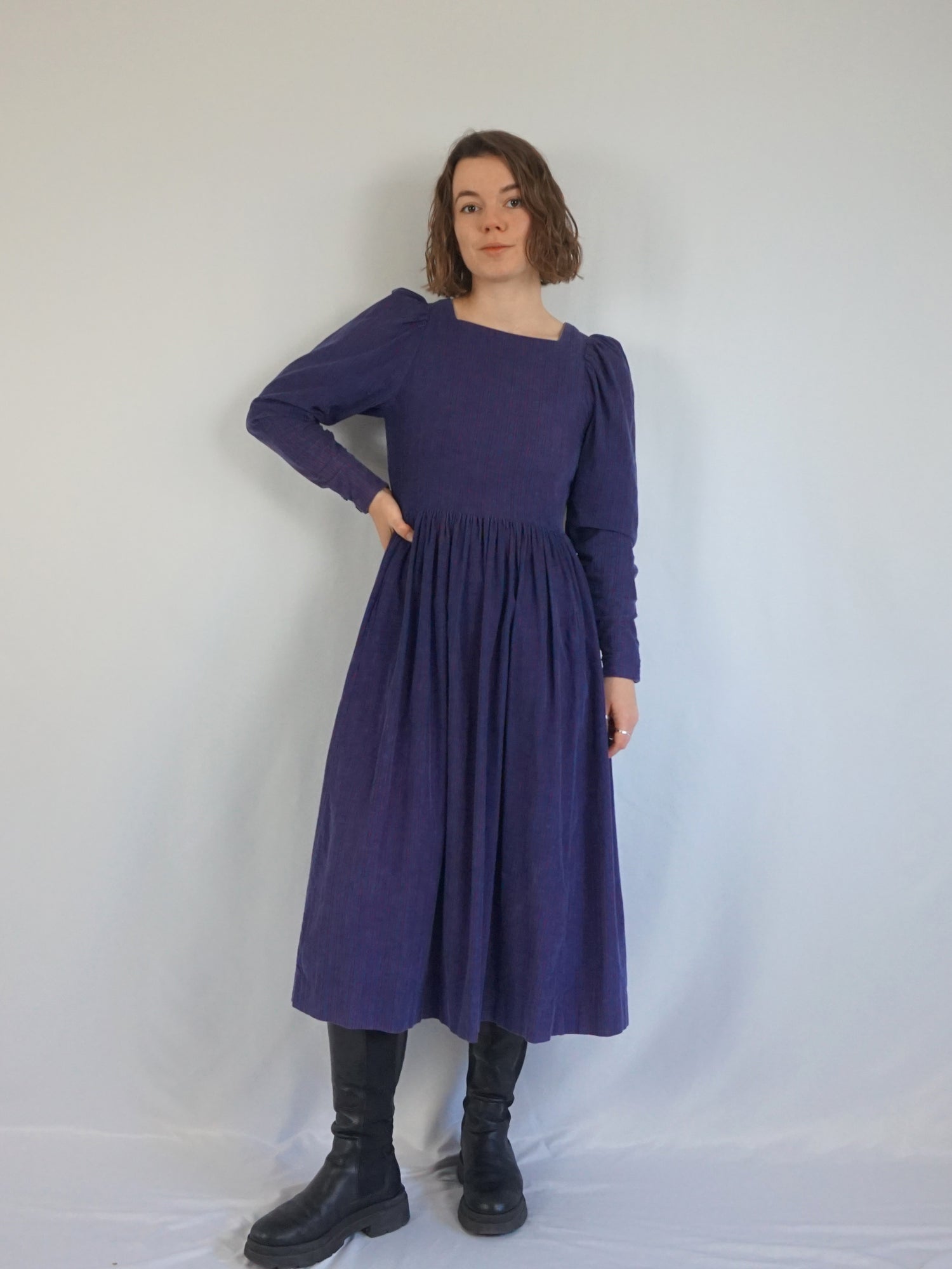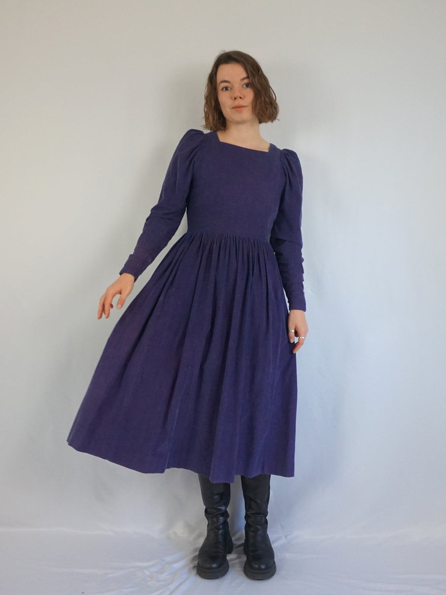 Vintage 80s Laura Ashley navy blue corduroy maxi dress with a red pinstripe pattern, puff sleeves, square neckline and pockets.