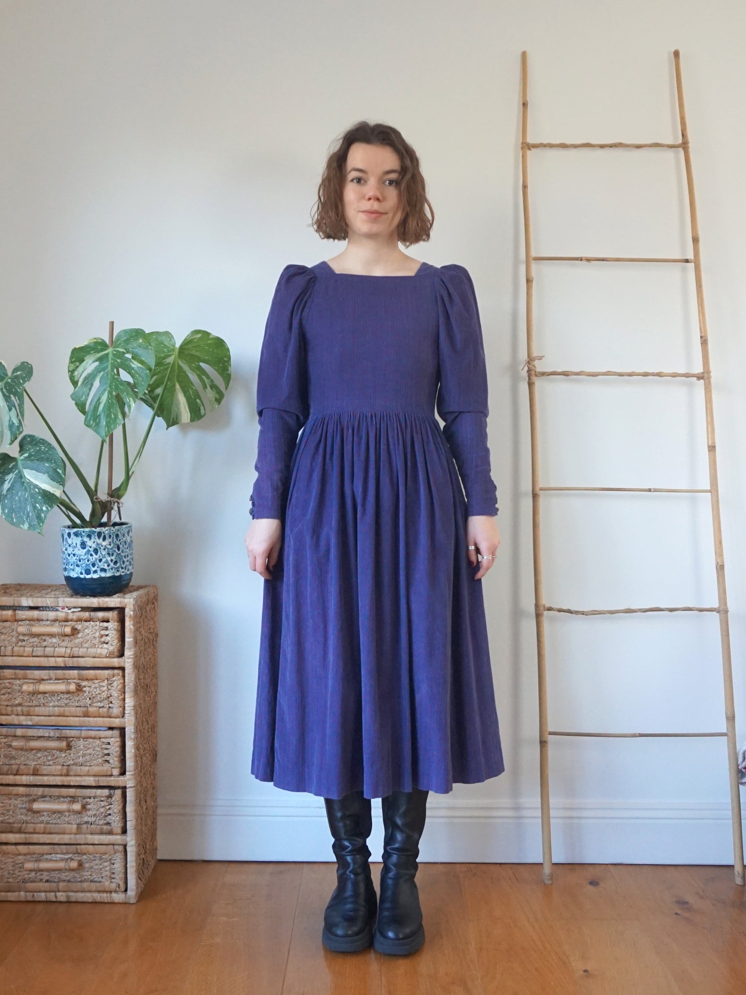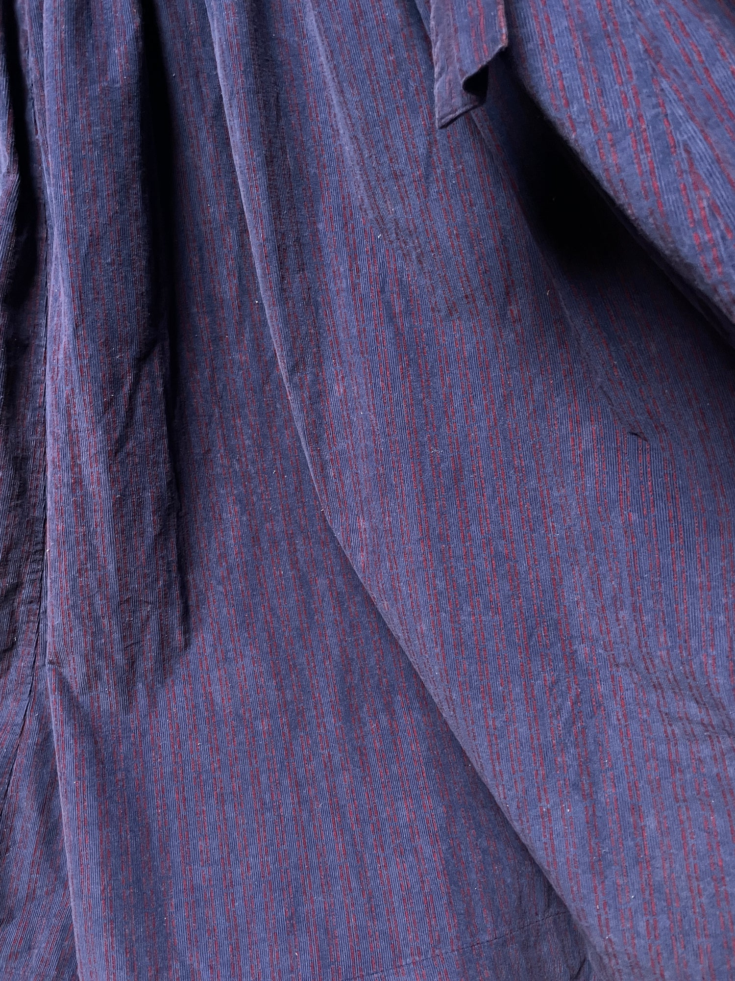 Vintage 80s Laura Ashley navy blue corduroy maxi dress with a red pinstripe pattern, puff sleeves, square neckline and pockets.