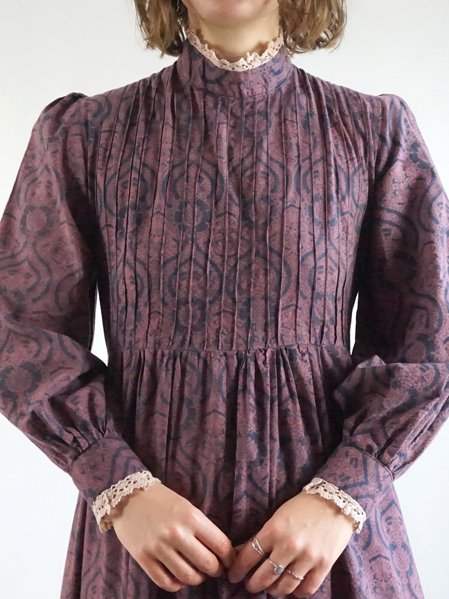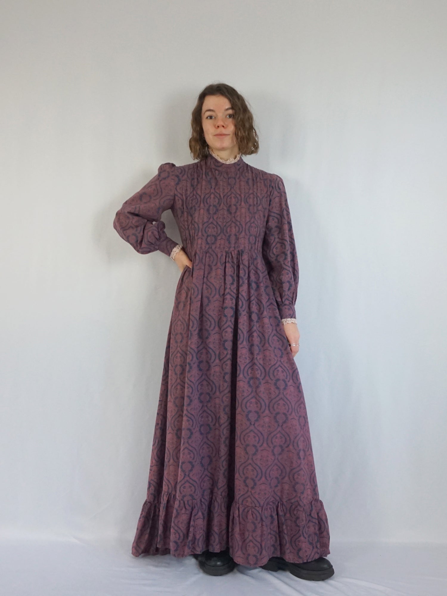 Vintage 70s navy blue and purple/ burgundy patterned cotton maxi dress with long puff sleeves, pintuck detailing and a matching belt.