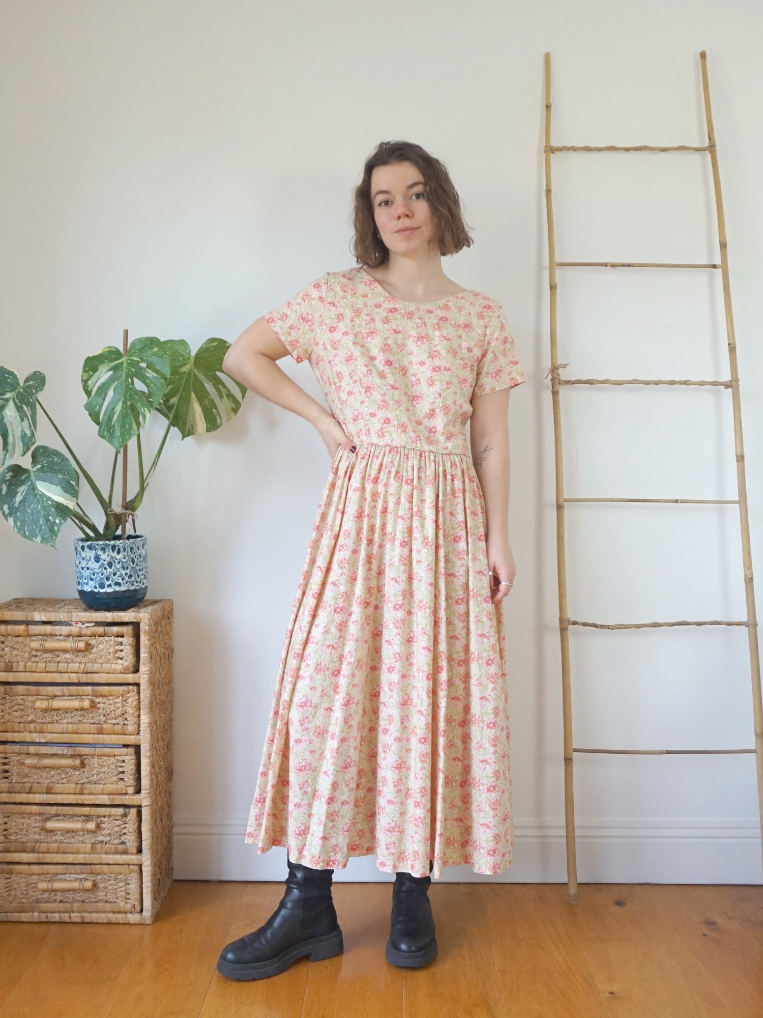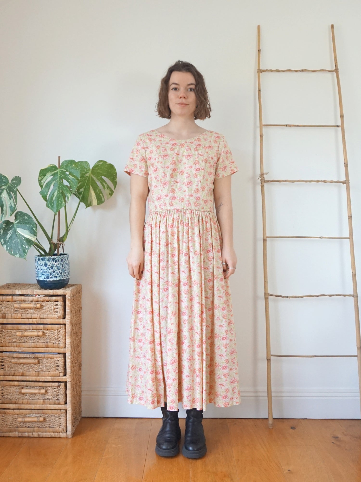 Vintage 80s Laura Ashley peach and pink floral maxi dress with a scoop neckline and scoop back.