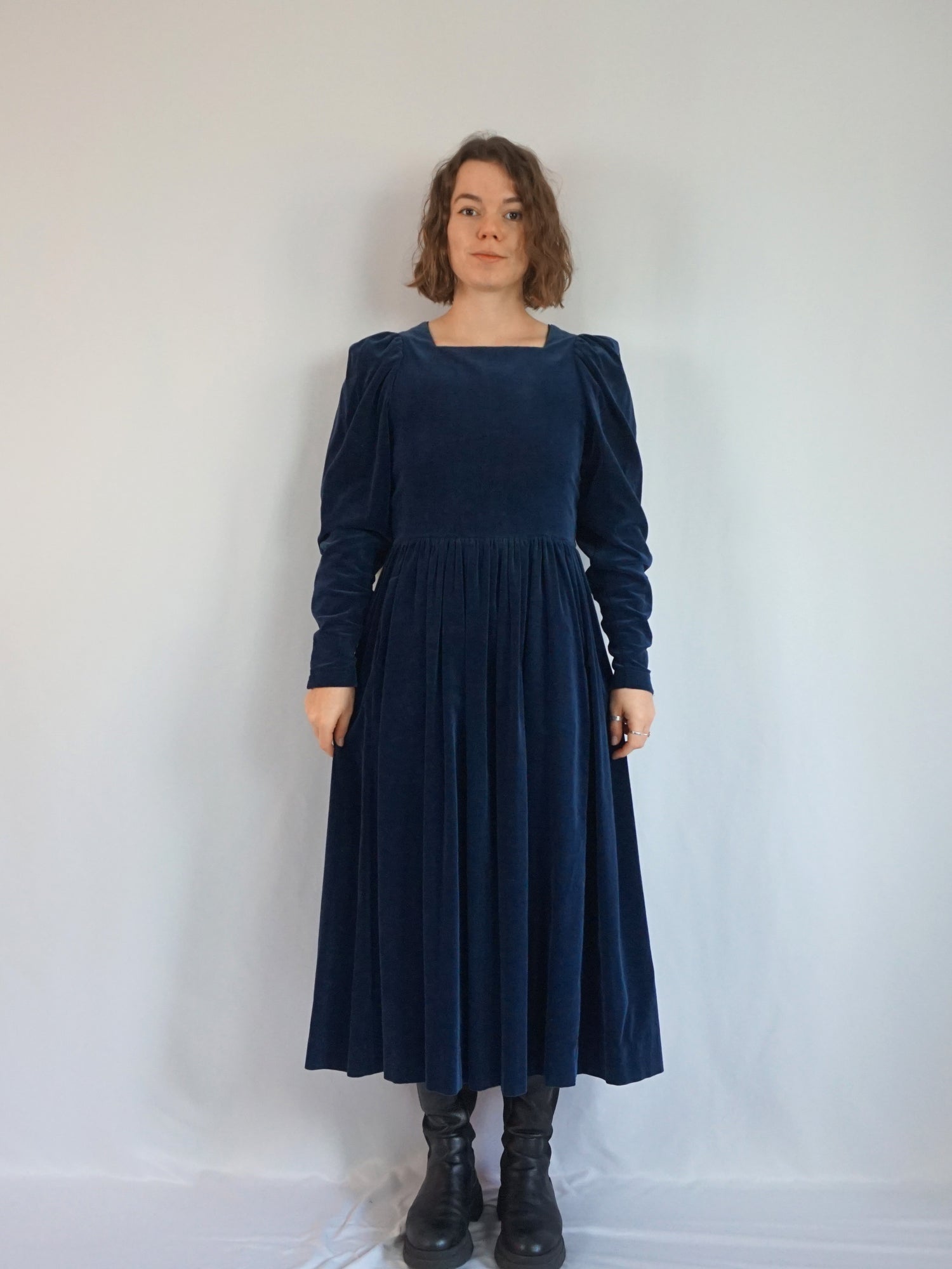 Vintage 80s Laura Ashley navy blue velvet maxi dress with puff sleeves, pockets and a matching tie waist.