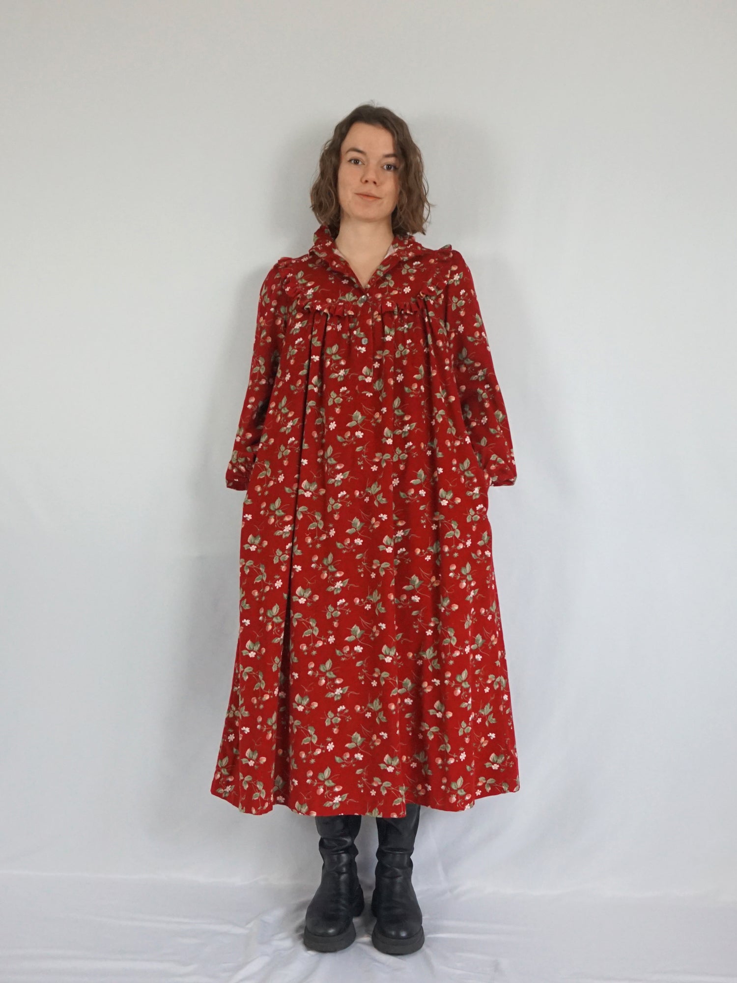 Vintage 70s Laura Ashley made in Wales corduroy smock dress in deep red with a ditsy floral and strawberry print, puff sleeves, pockets and a matching belt.