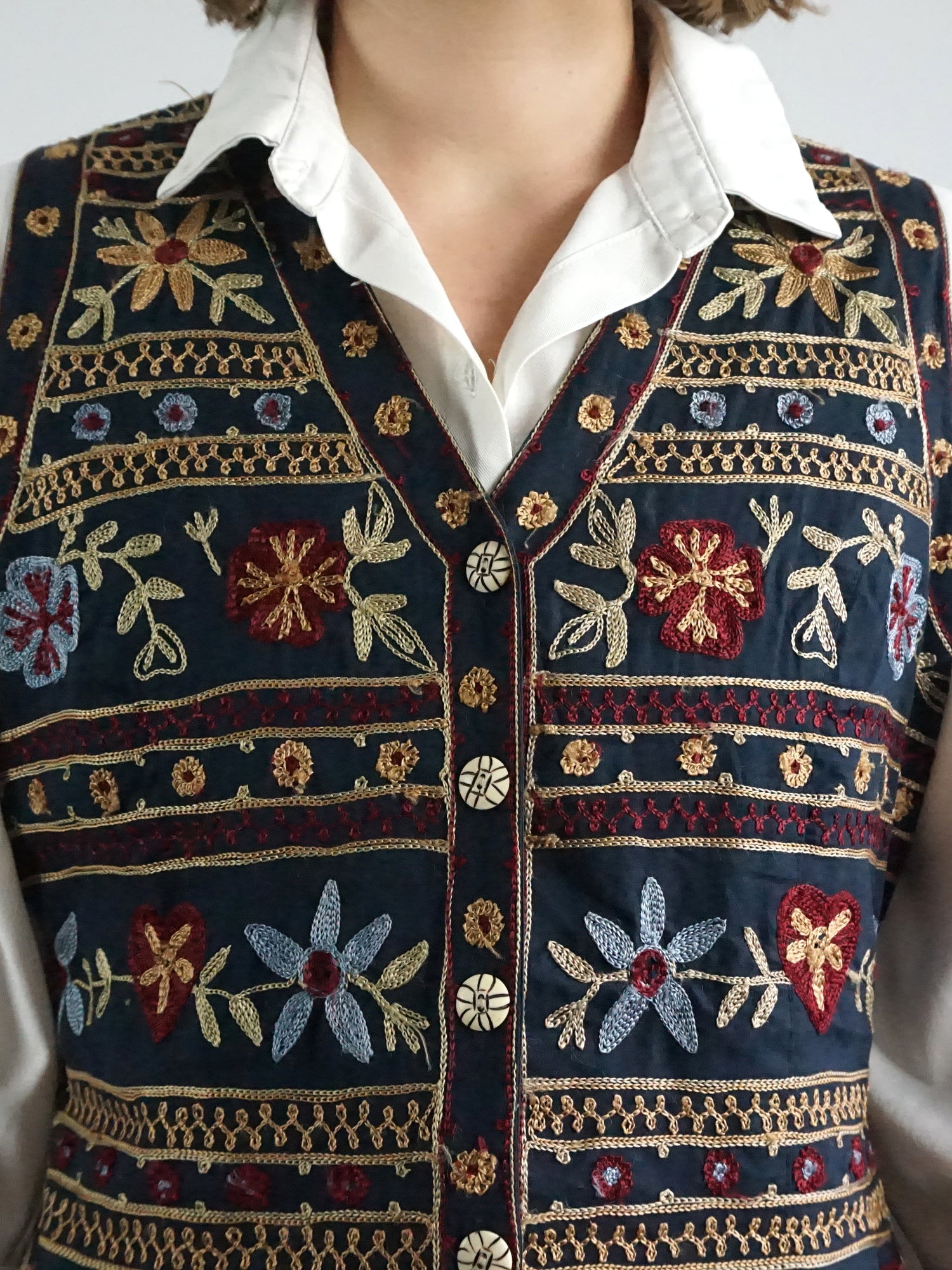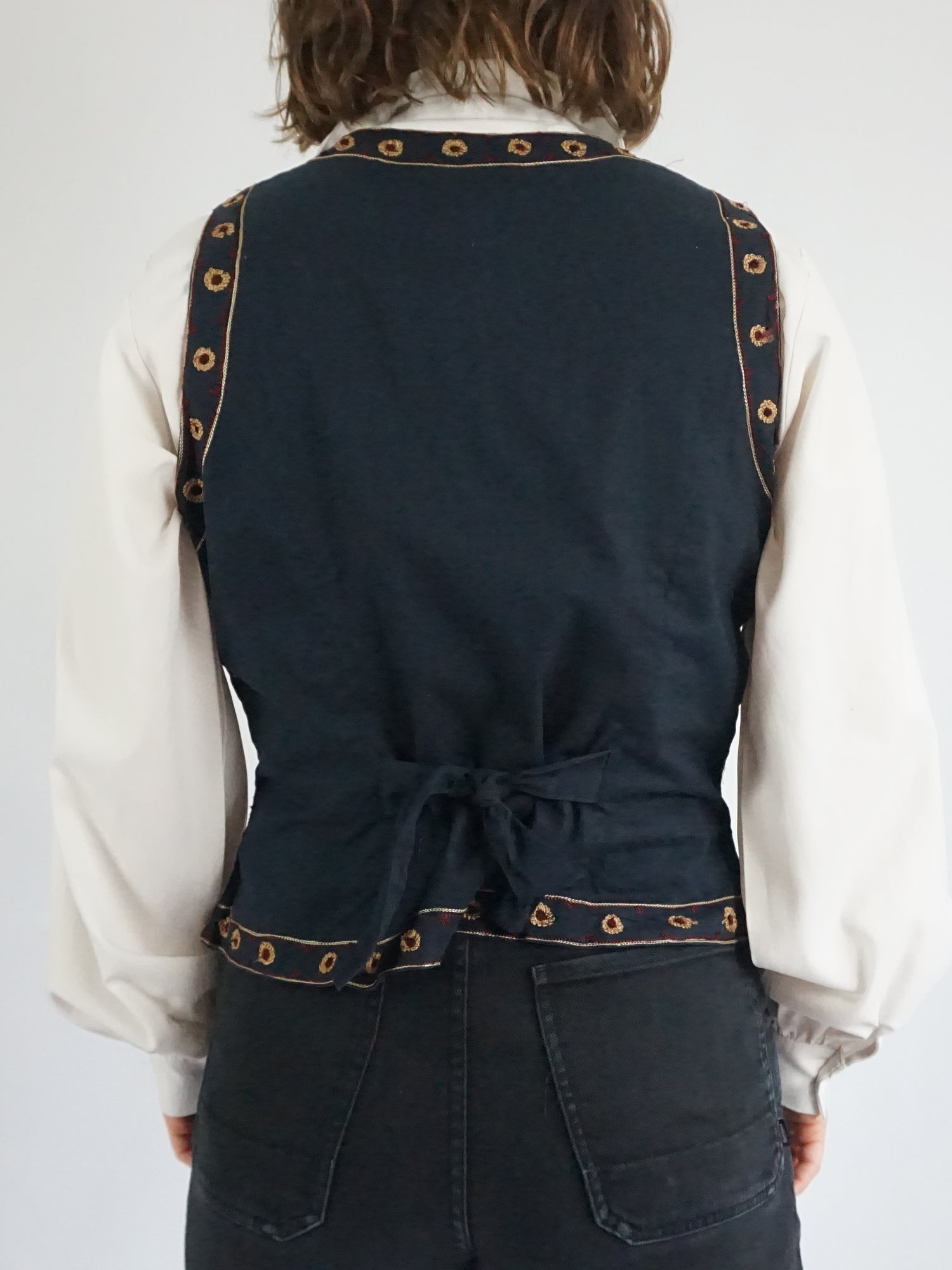 Vintage 90s Monsoon navy blue cotton waistcoat with intricate floral embroidery on the front.