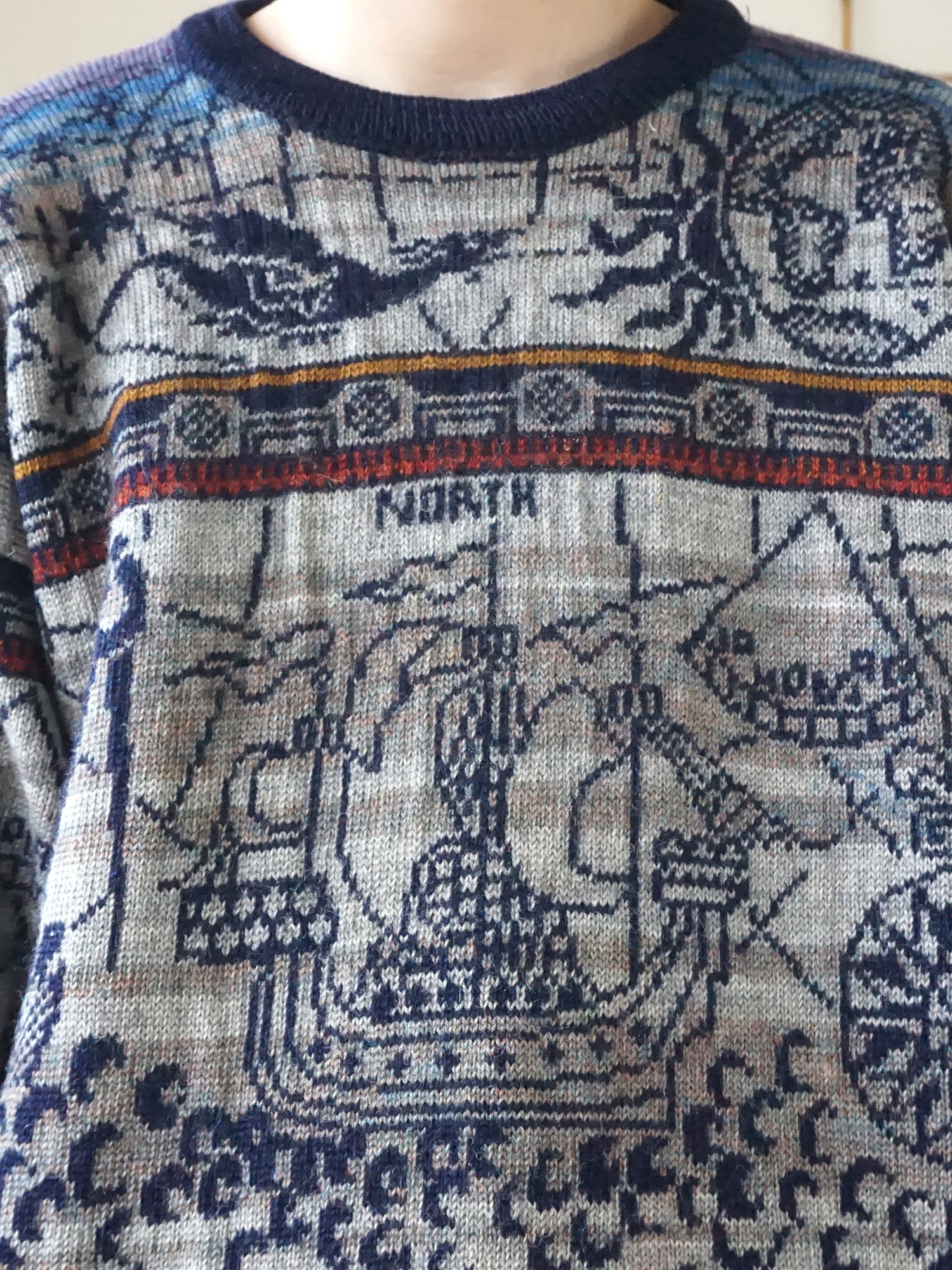 Vintage 90s navy blue and grey pure wool jumper with a detailed nautical and celestial inspired design all over.