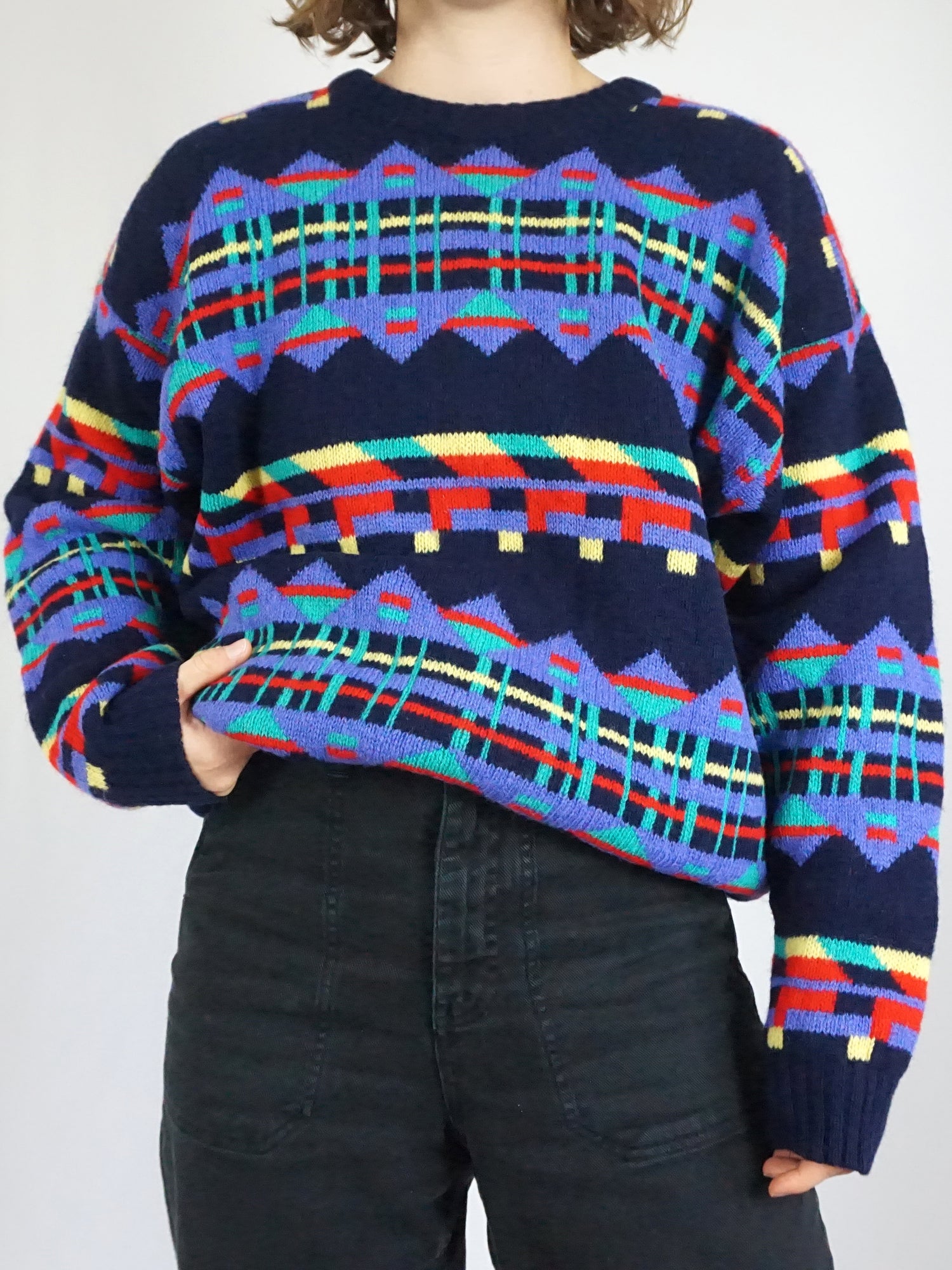 True vintage, not a reproduction. A vibrant wool knit with statement colours and classic 90s energy.