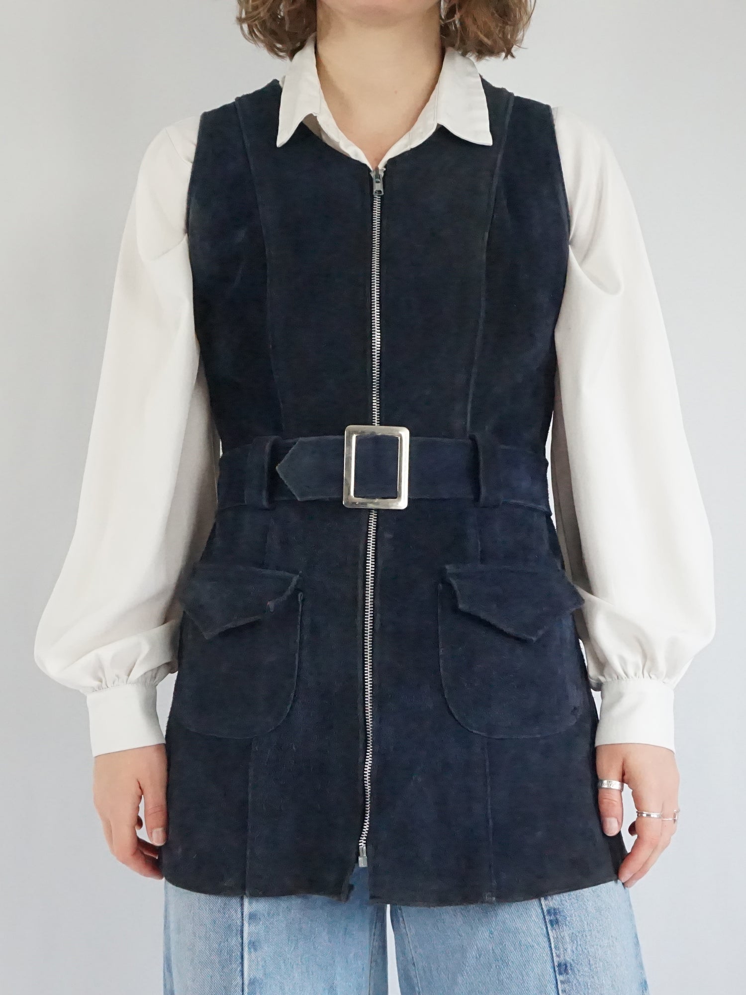 Vintage 70s navy blue suede waistcoat with front pockets, zip closure and a large silver buckle.
