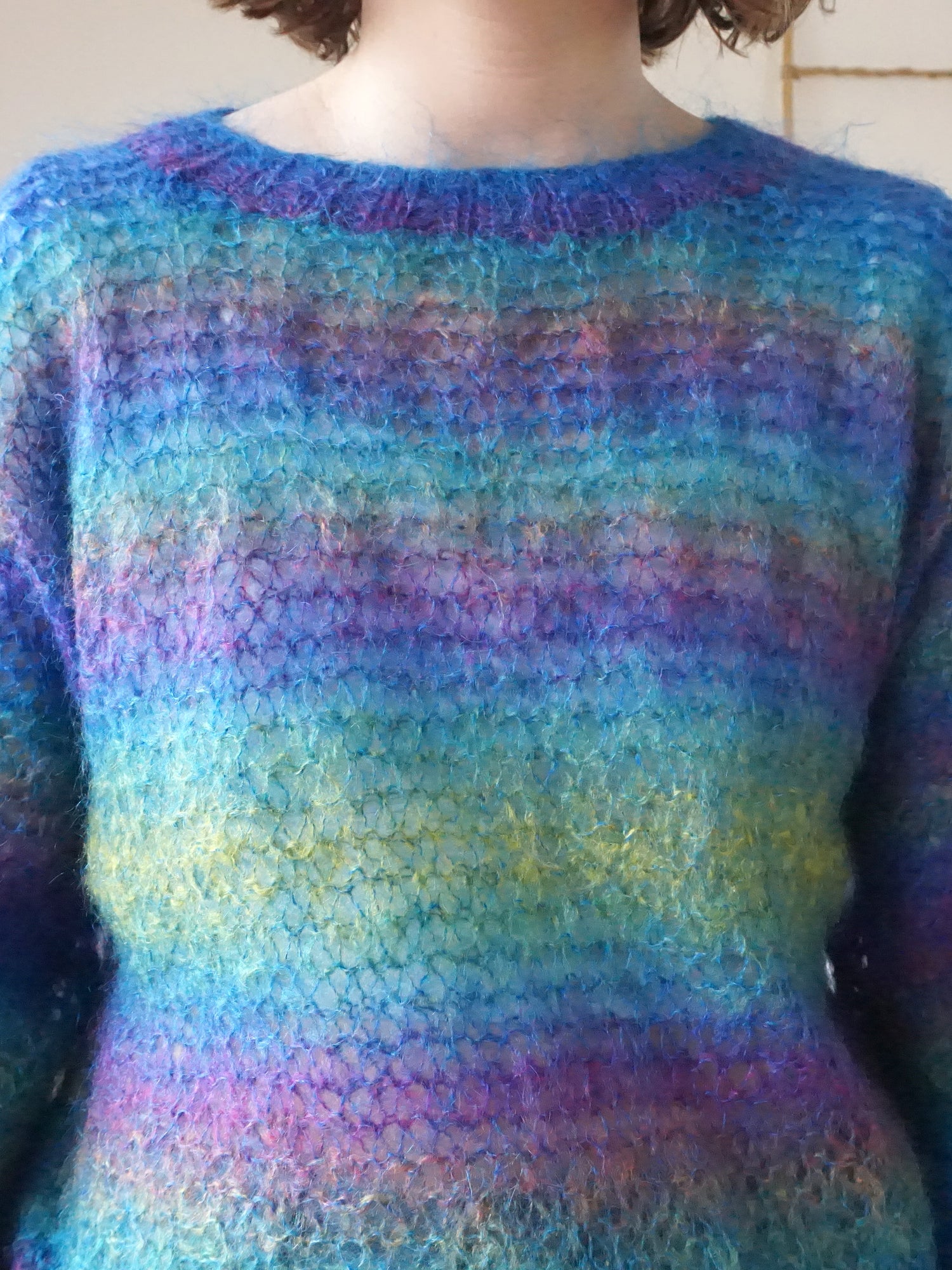 Vintage 70s handknitted rainbow ombré mohair jumper with a loose open weave.