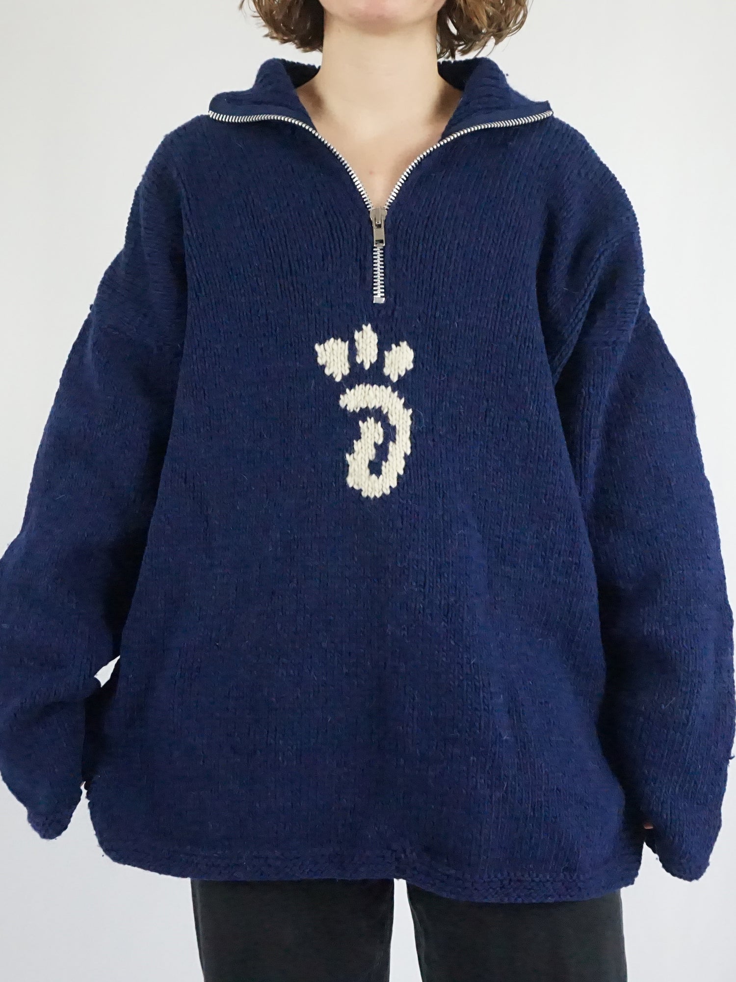 Vintage 90s Pachamama navy blue chunky wool jumper with a quarter zip and large footprint pattern on the front and back.