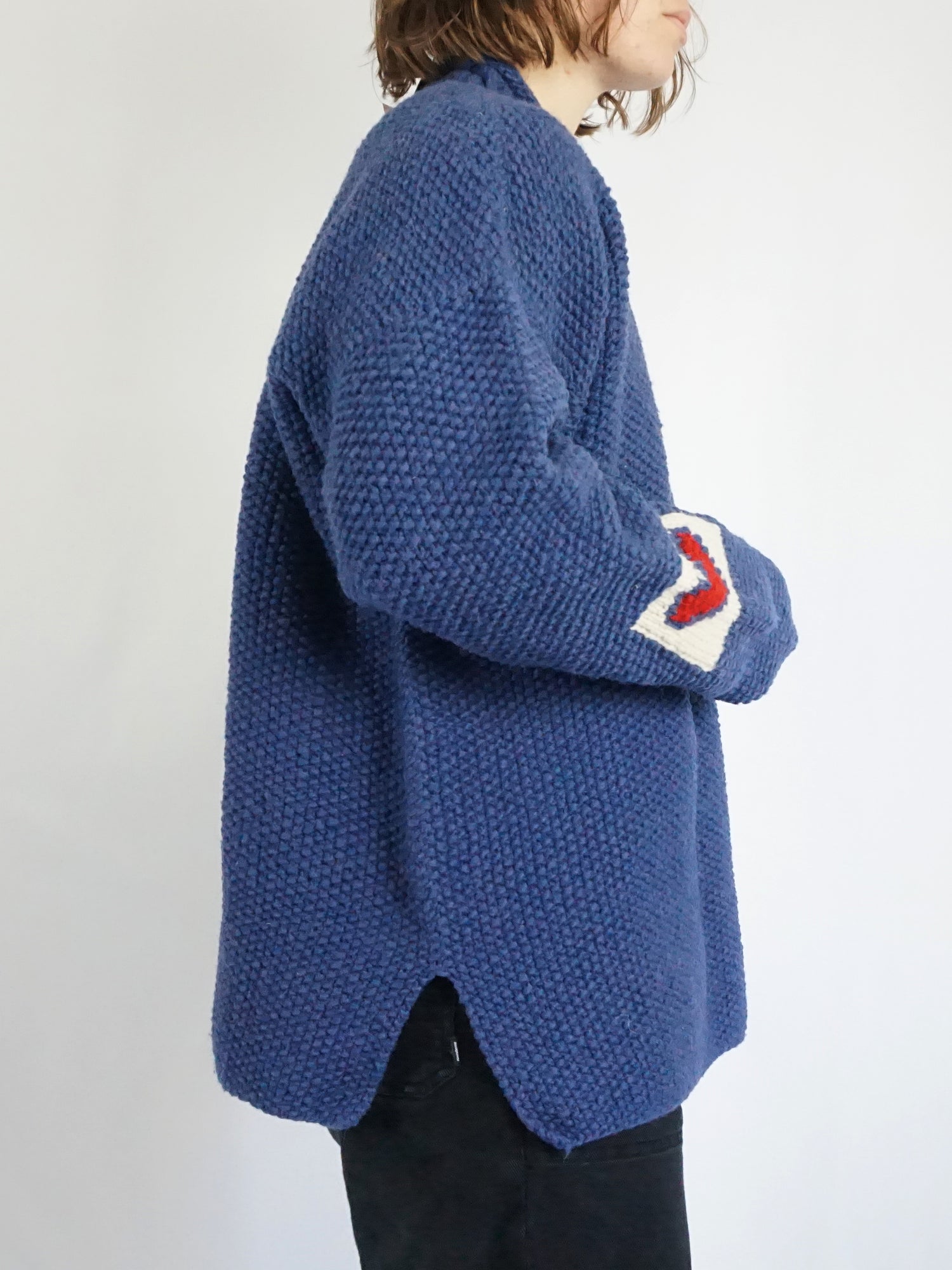 Vintage 90s Pachamama chunky wool jumper in blue with a heart design on the front, back and sleeve.