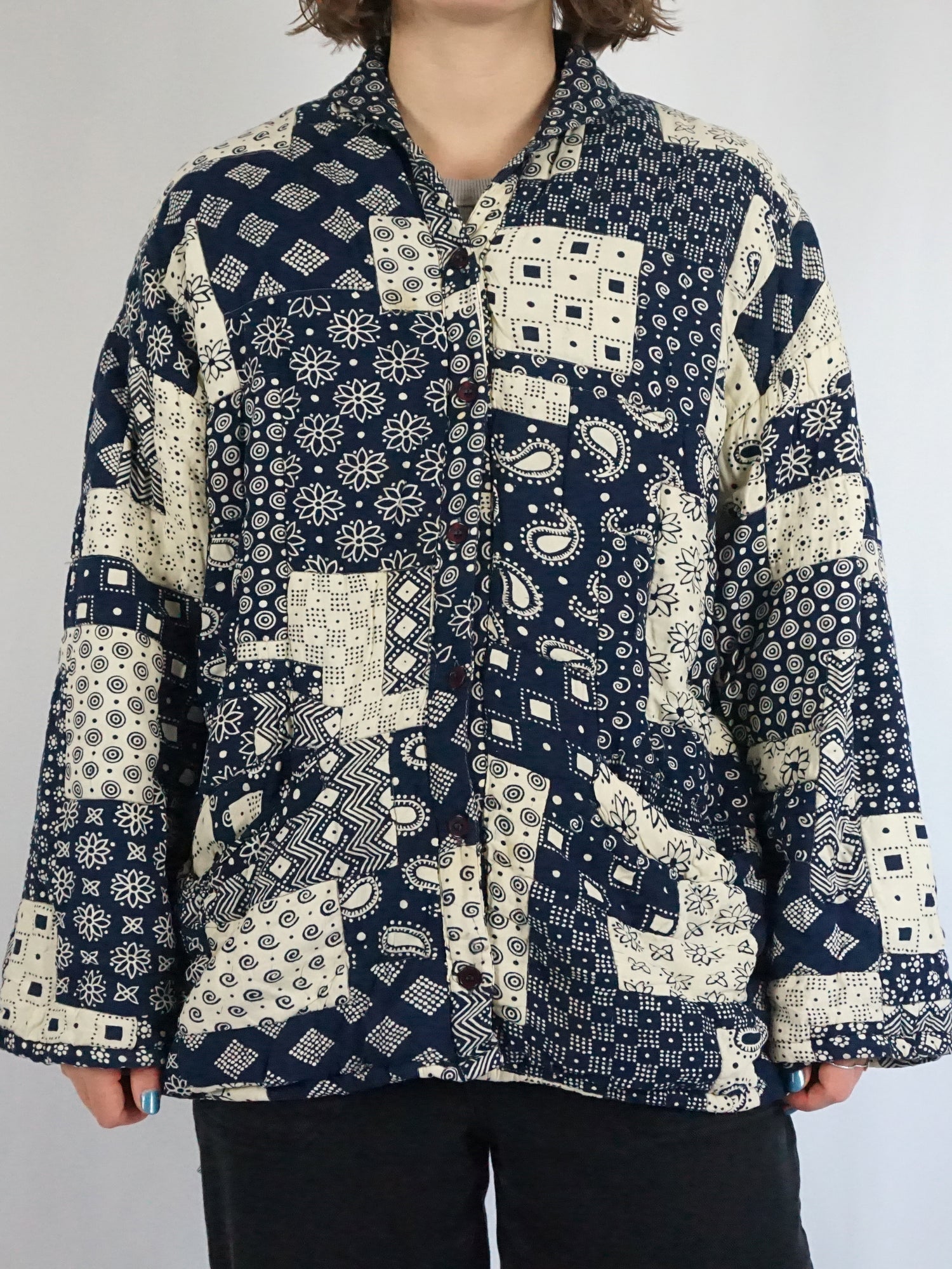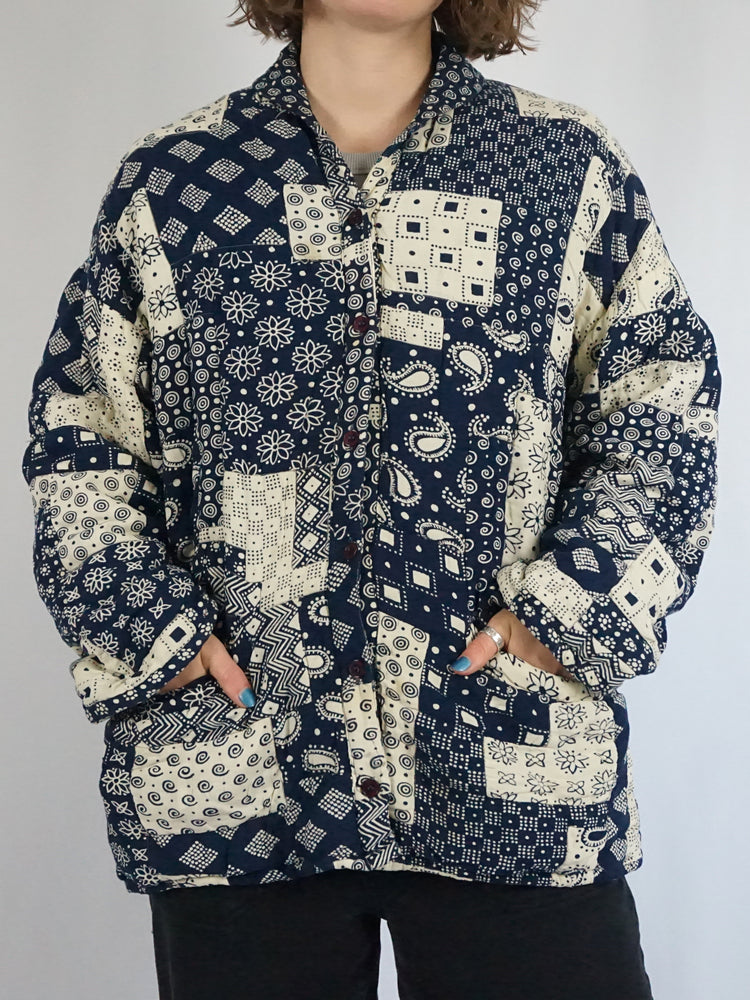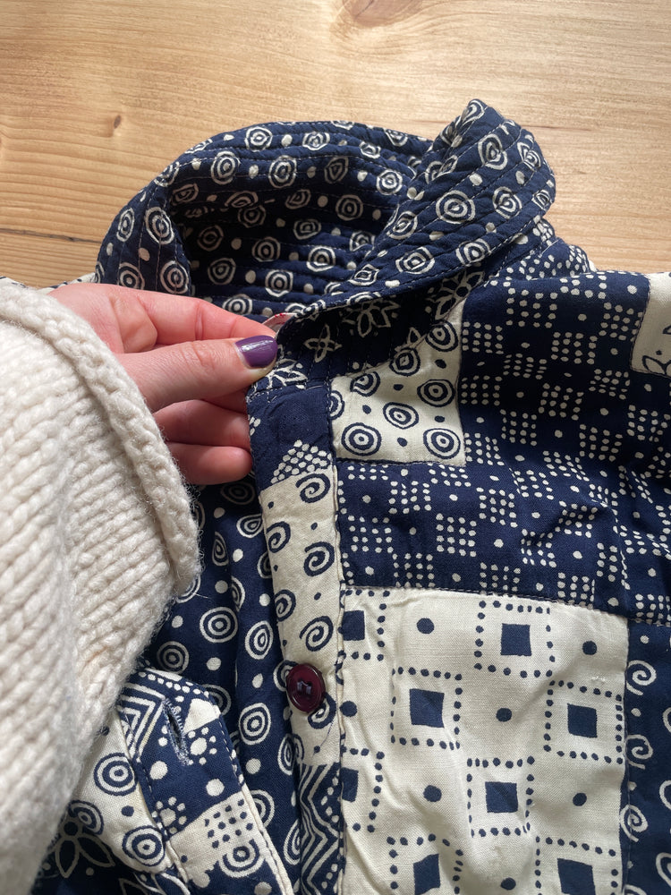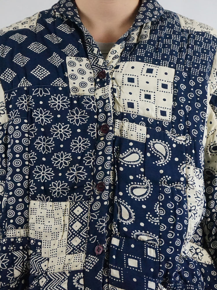 Vintage 90s Phool patchwork quilted jacket in navy blue and white with floral, paisley and funky patterning, and front pockets.