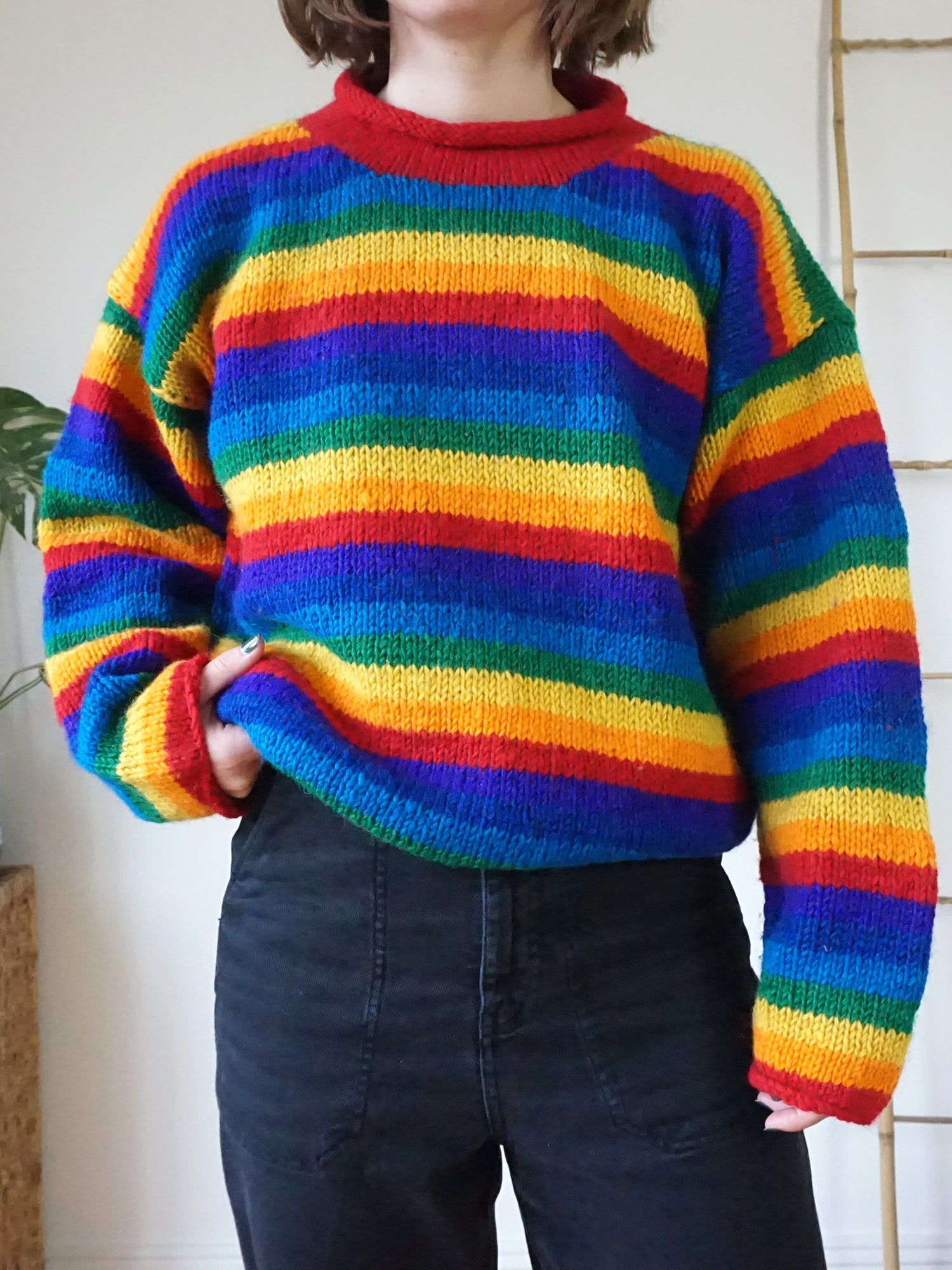 Vintage 90s chunky wool jumper with a colourful rainbow striped design and rolled neckline.