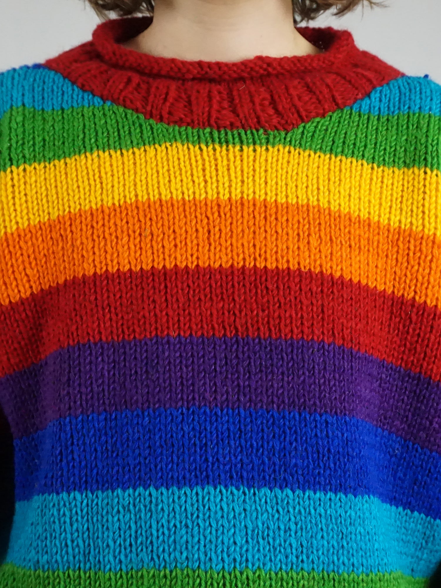 Vintage 90s chunky wool jumper with a multicoloured rainbow striped pattern and rolled neck.
