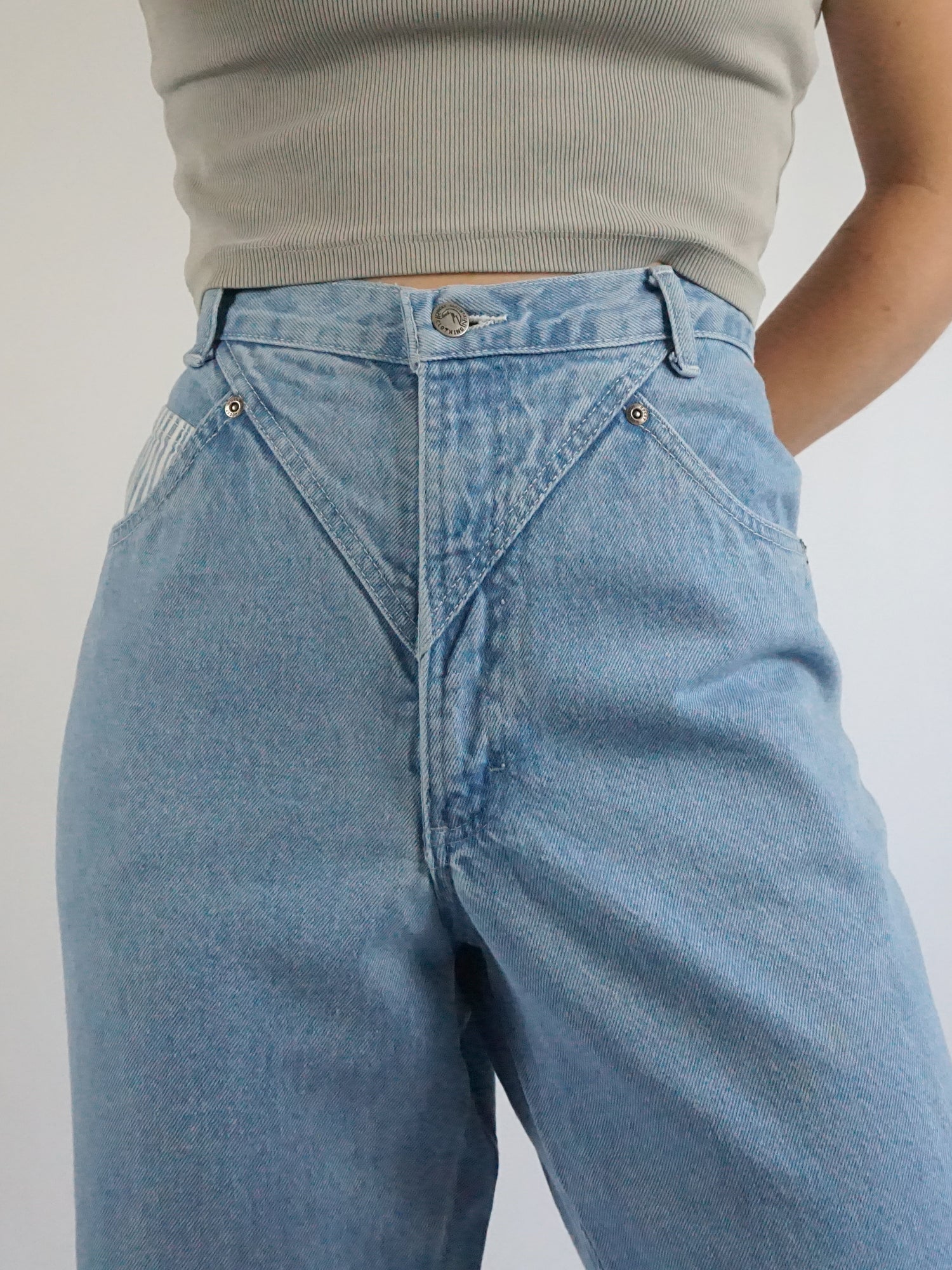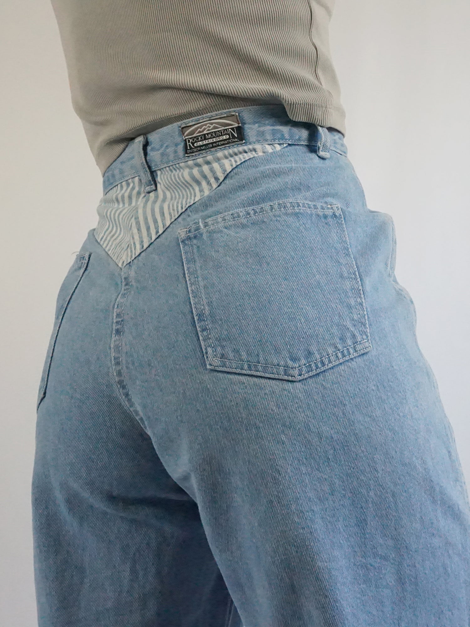Vintage 90s Rocky Mountain light blue mum jeans with white and blue striped detailing on the back and pockets.