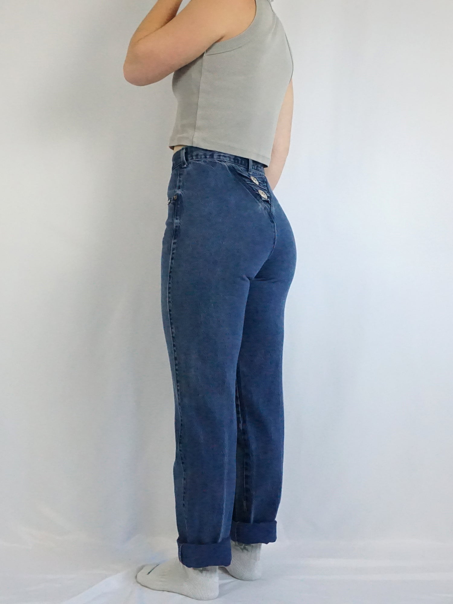 Vintage 90s Roughrider mum jeans in dark blue with metal stud detailing on the back.