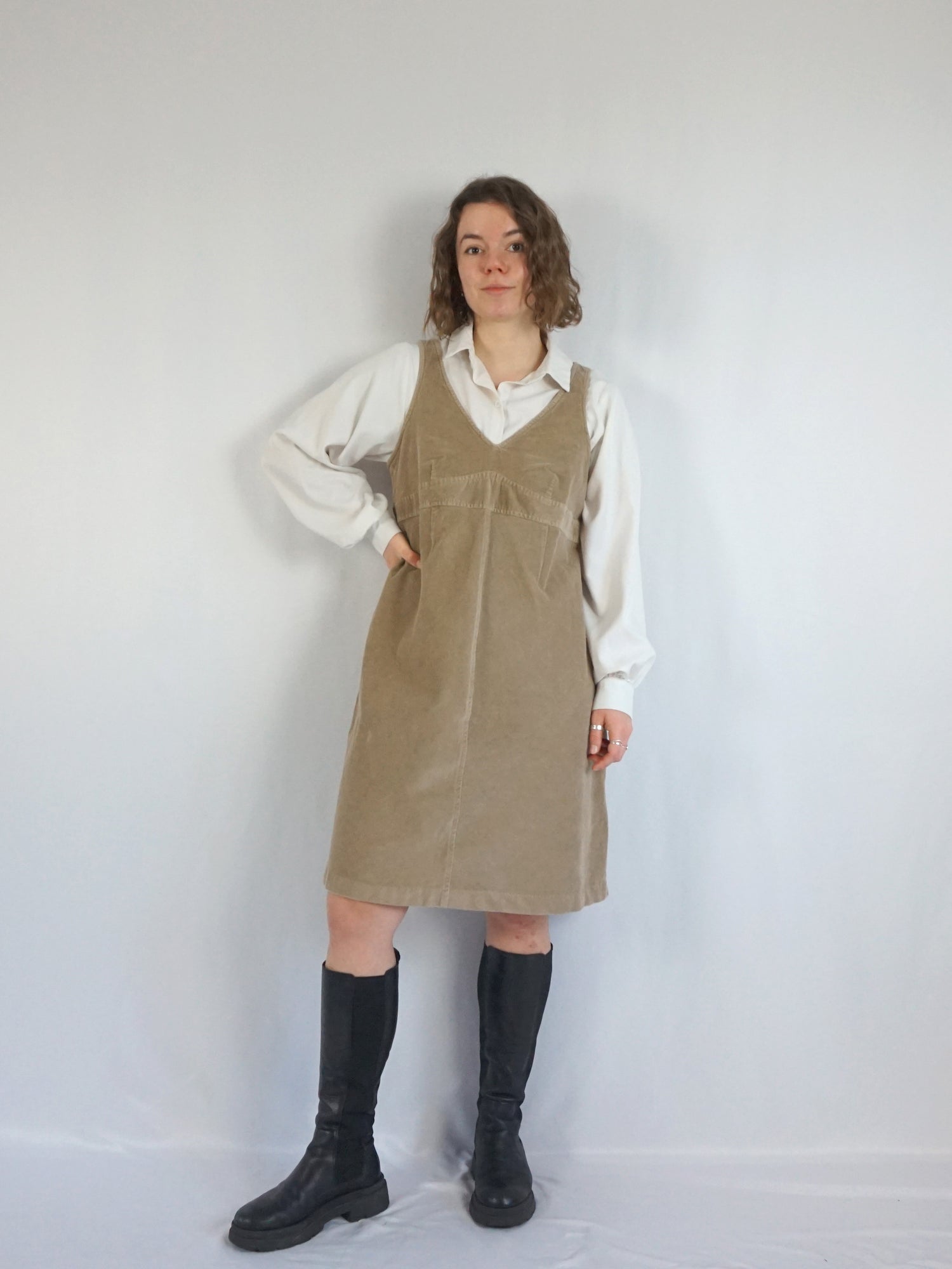 Vintage 90s sand brown corduroy mini dress. Originally a maternity piece but works beautifully as a relaxed fit dress for anyone.