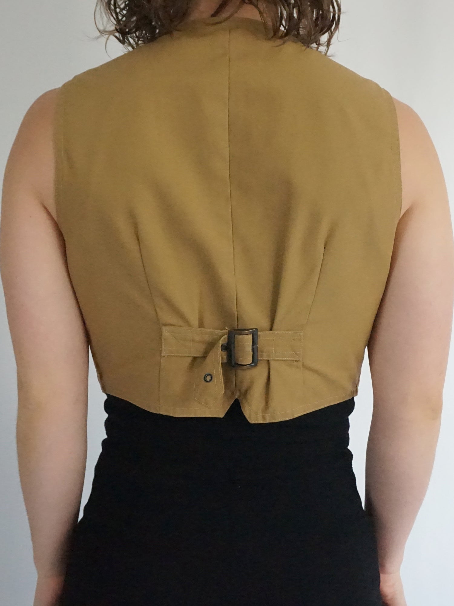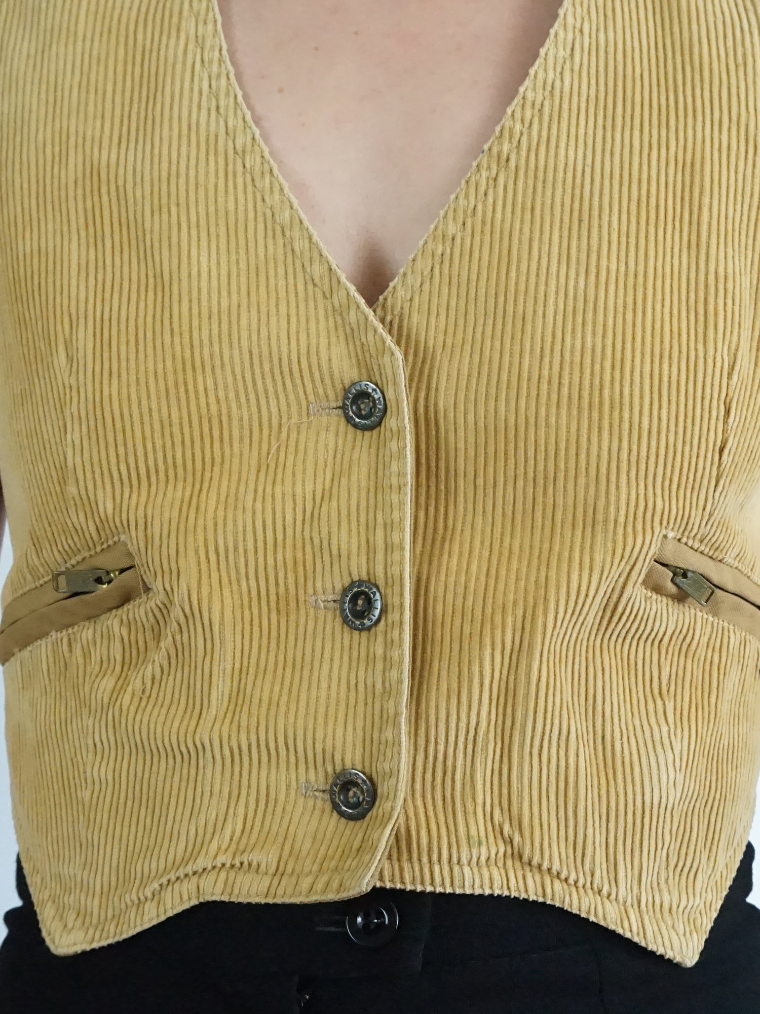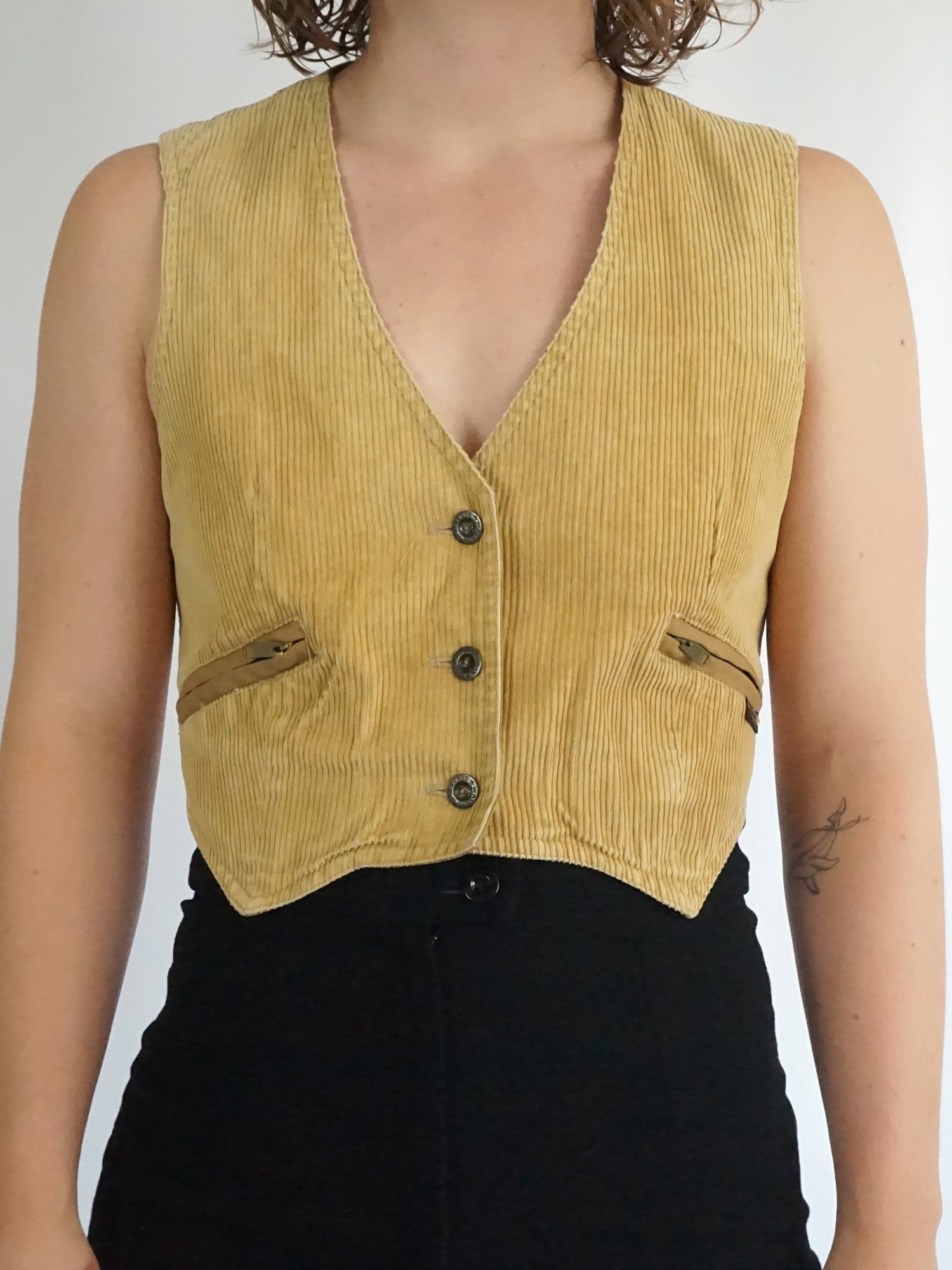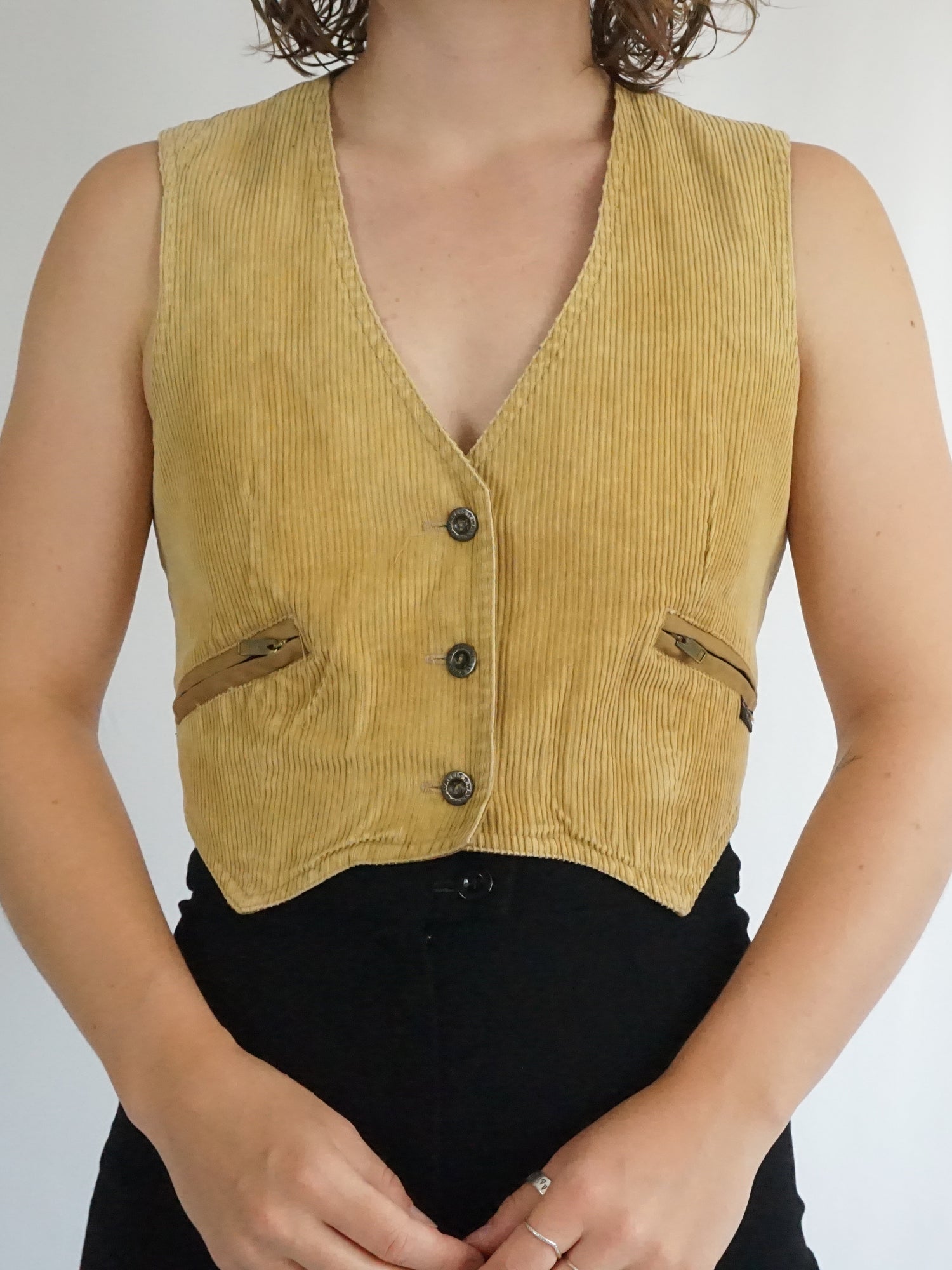 Vintage 70s Wallis sand brown corduroy vest with pockets and an adjustable back. Can be worn by itself or with a shirt underneath.