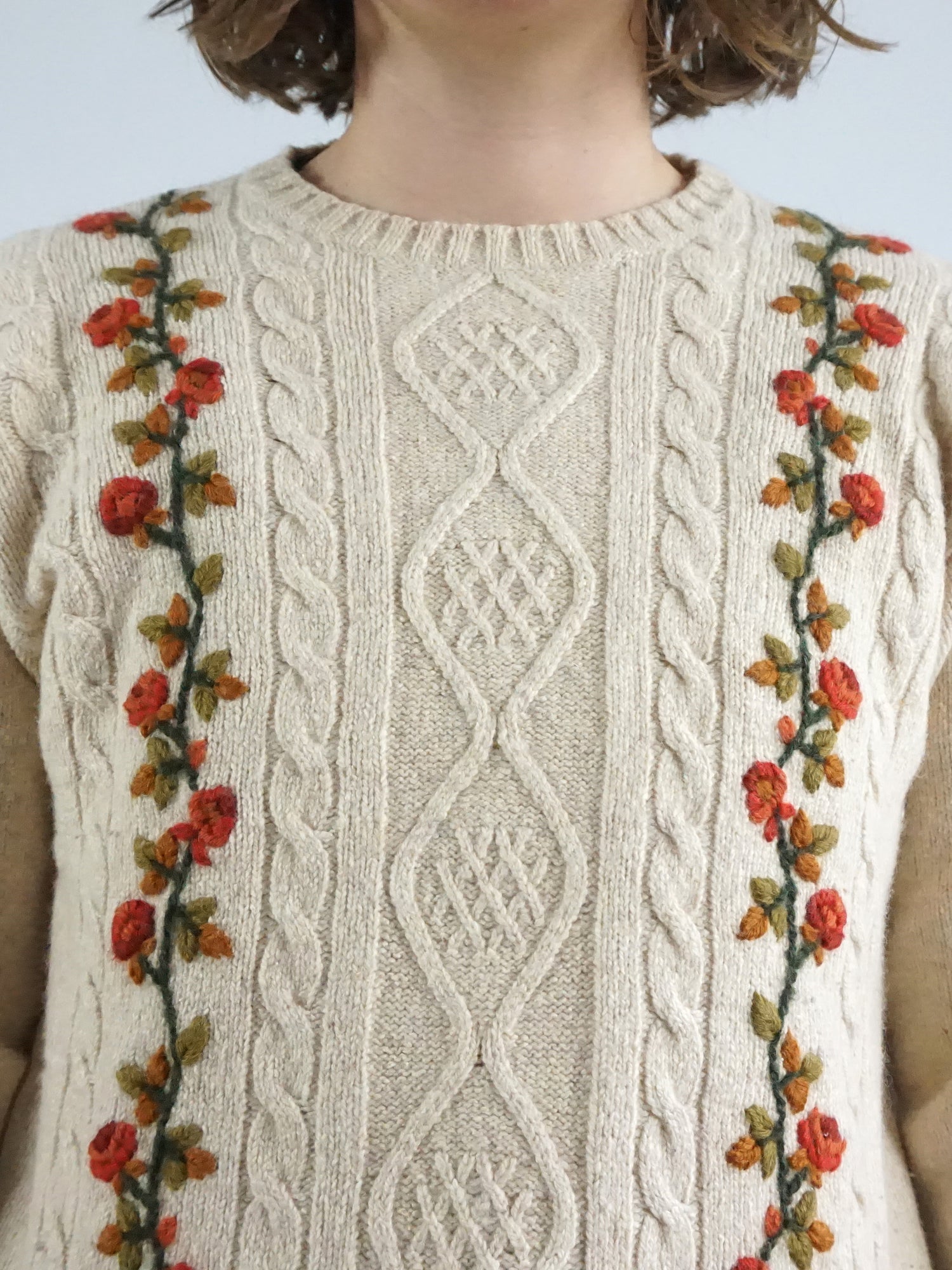 True vintage, not a reproduction. A soft lightweight knit with delicate stitched florals and warm autumn tones.