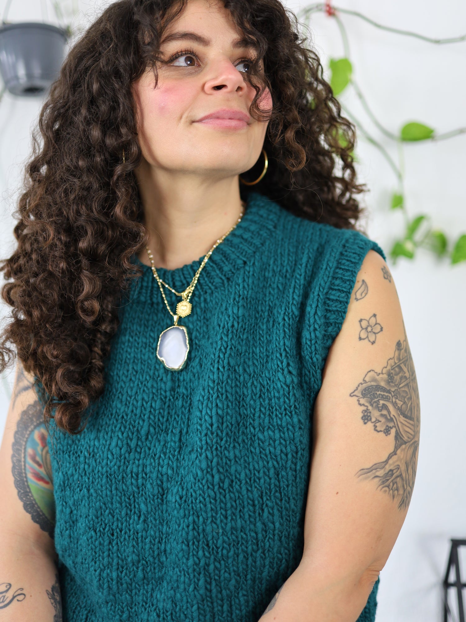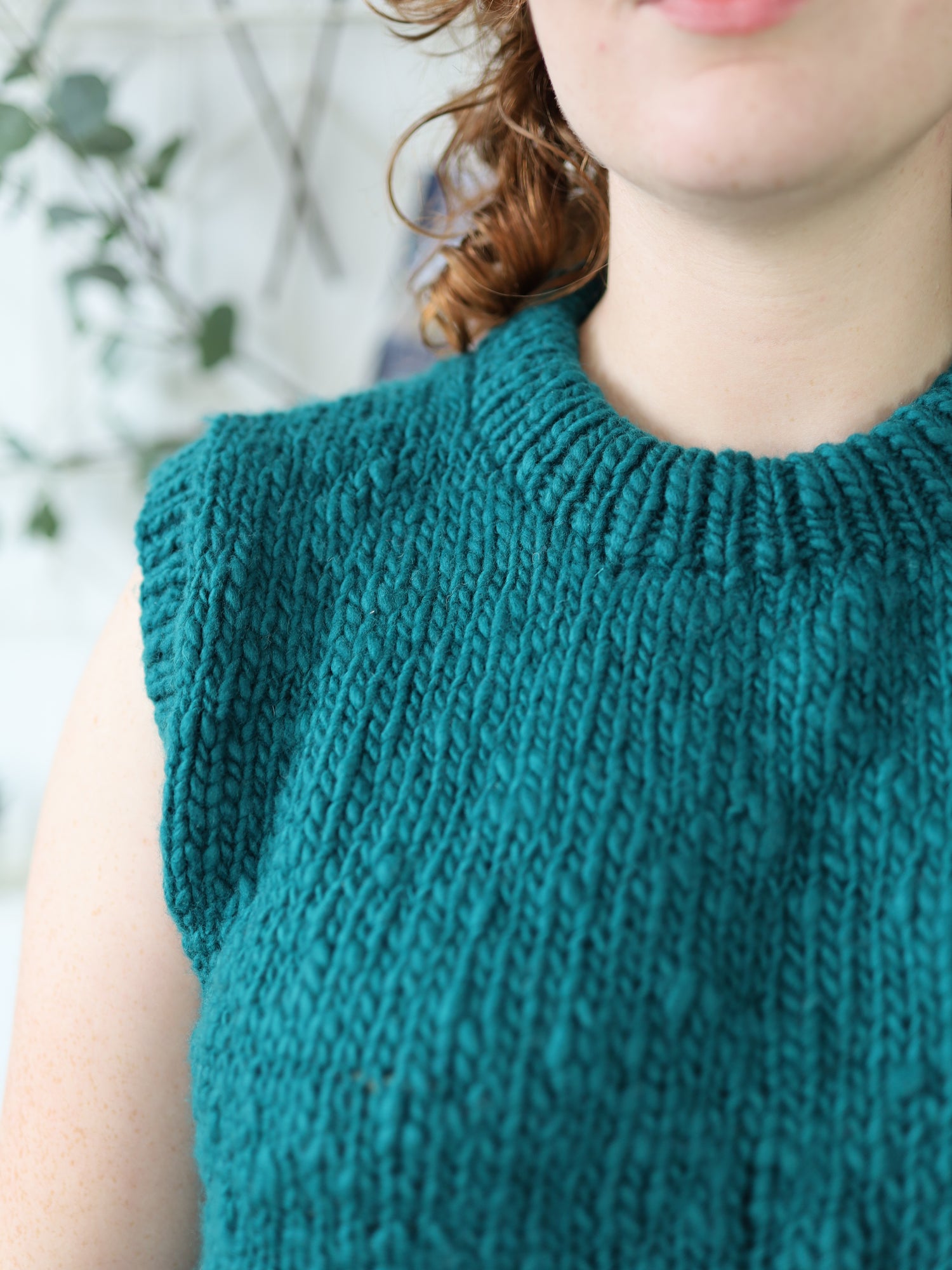The hand-spun and hand-dyed yarn gives each piece a subtly uneven texture, making every vest truly one of a kind.